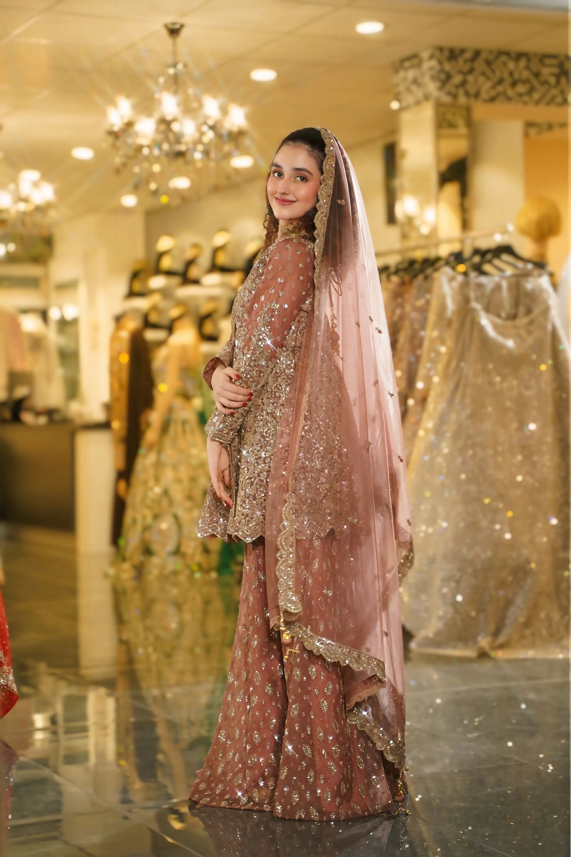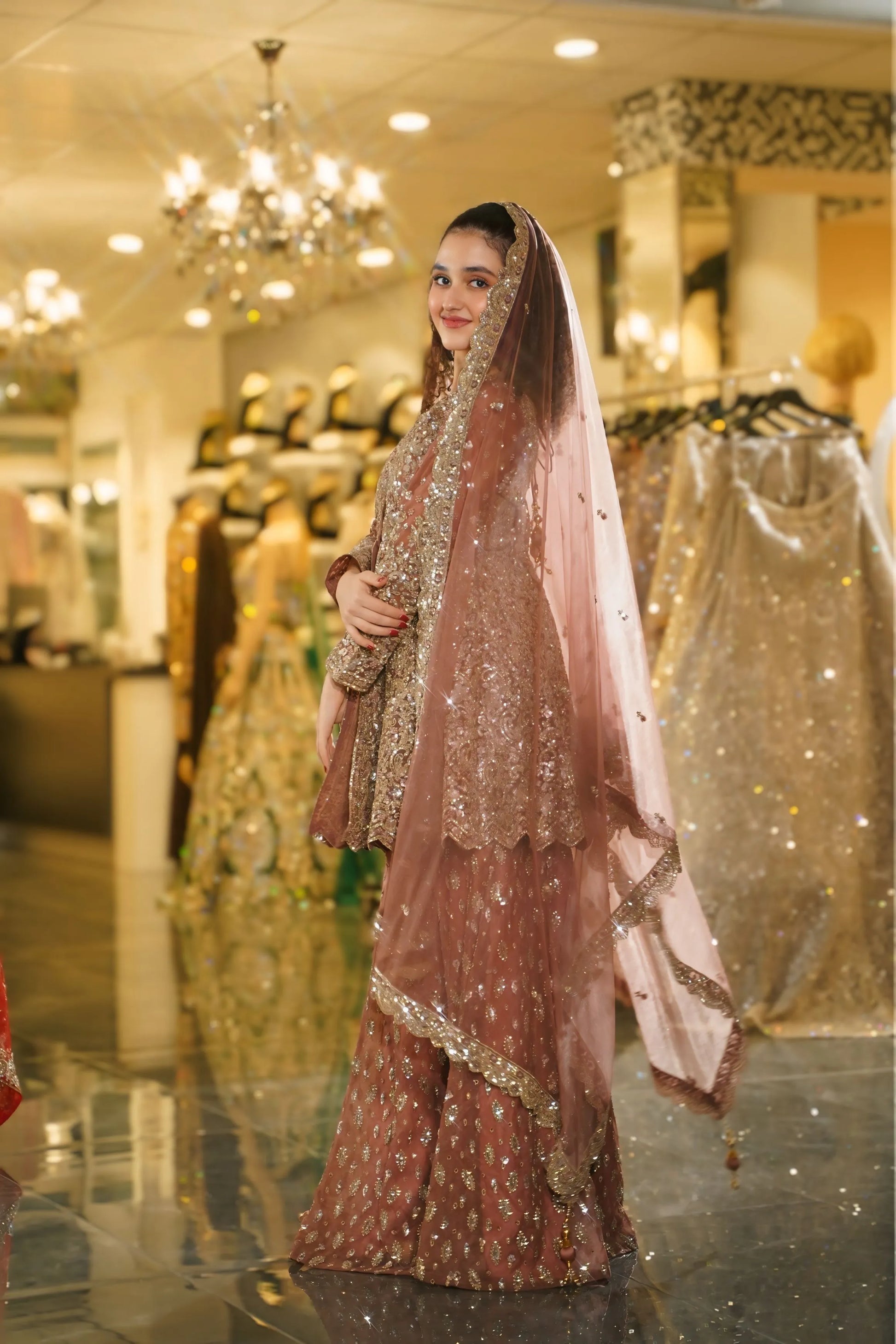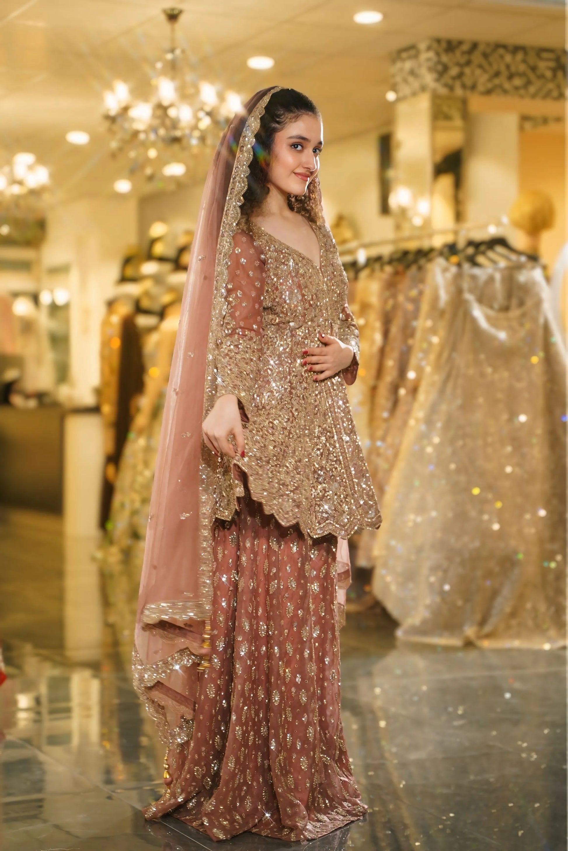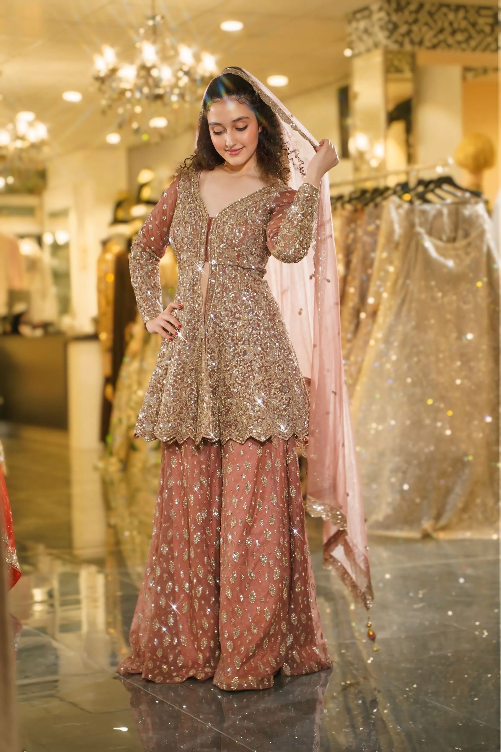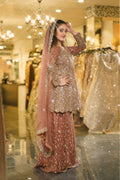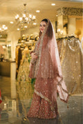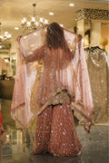Radiate bridal brilliance with this breathtaking Rose Gold Sharara Set. This magnificent ensemble combines warm rose and dusty pink tones with lavish gold sequin work, creating a look that's both luxurious and romantic. Perfect for the bride who desires to shine with sophisticated glamour at her special celebrations.