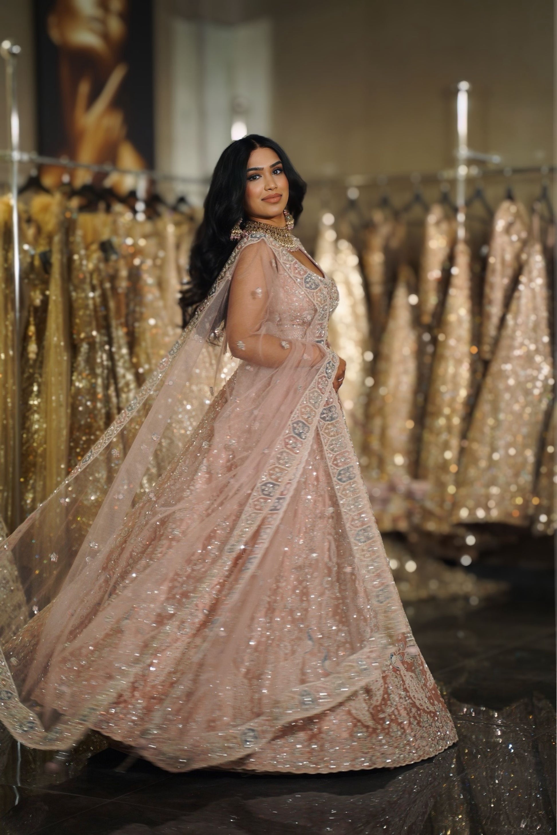All-Over Silver Shimmer: The lehenga skirt is dusted with scattered silver sequins and delicate embroidery that catches the light beautifully during movement