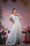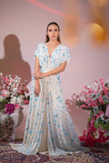 Cream & Powder Blue Floral Embroidered Slit Evening Gown