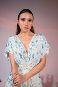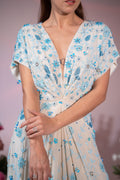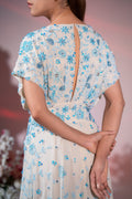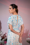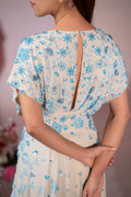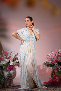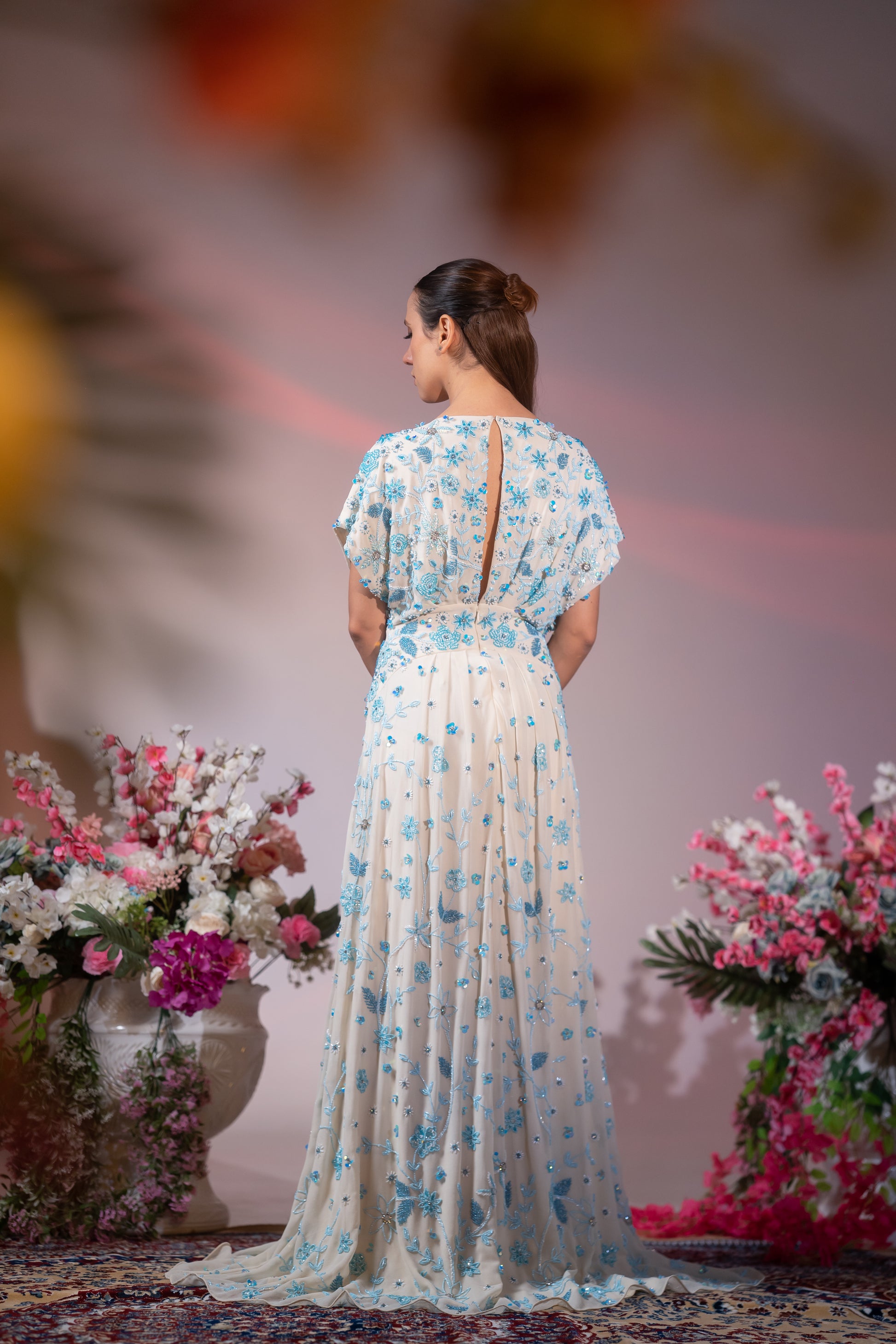 Drift into a world of effortless beauty with this enchanting Cream and Powder Blue Evening Gown. A breath of fresh air, this gown captures the essence of a summer romance with its soft, flowy silhouette and delicate embellishments. The creamy ivory base is adorned with whimsical blue floral and butterfly motifs, making it the perfect choice for a beach wedding, a garden party, or a sophisticated brunch soiree.