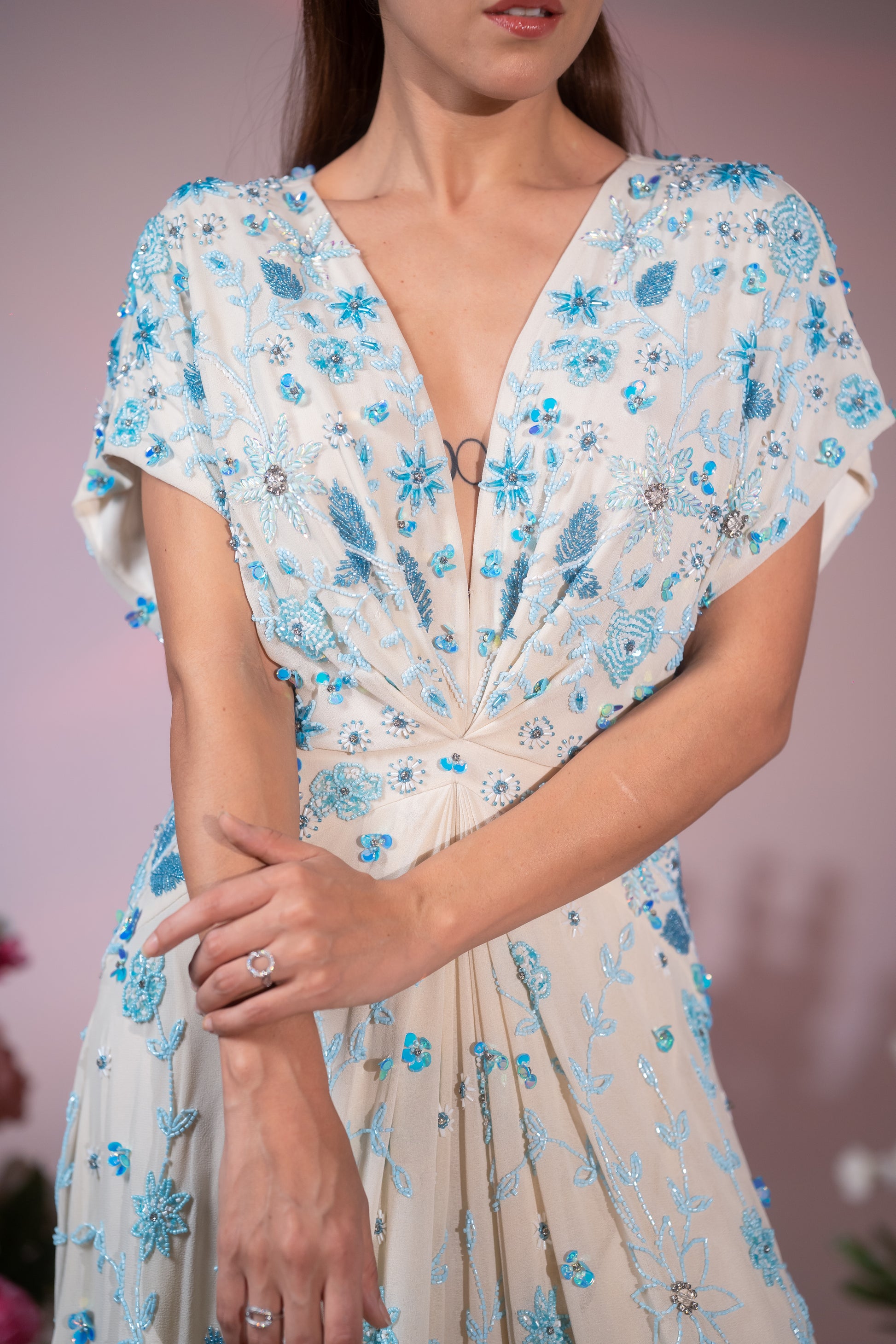 Whimsical Blue Embroidery: The gown is scattered with intricate sequins and beads in shades of powder blue and turquoise, forming charming floral and butterfly motifs that evoke a sense of freedom and nature 🦋