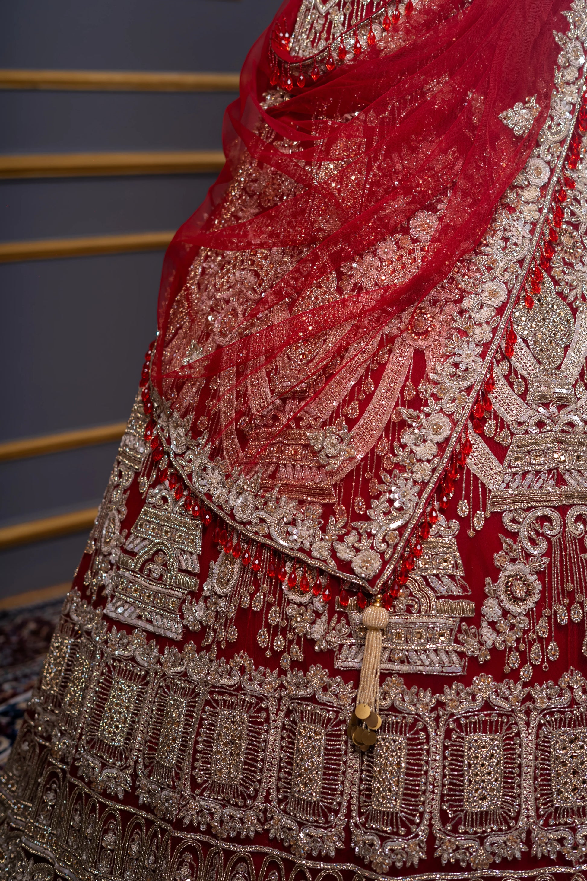 Classic bridal red lehenga with heavy silver-gold zari work featuring intricate geometric patterns and scalloped borders. The epitome of traditional bridal elegance.