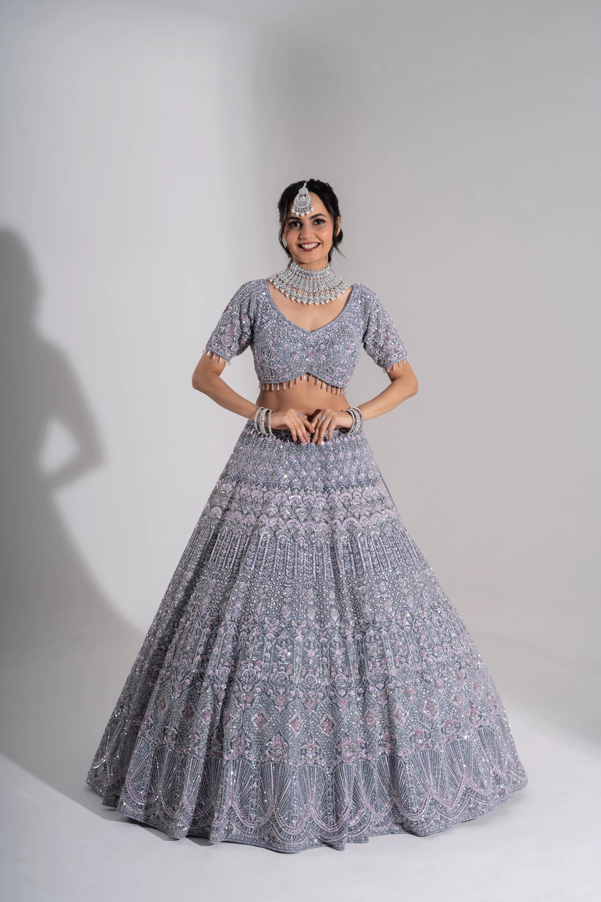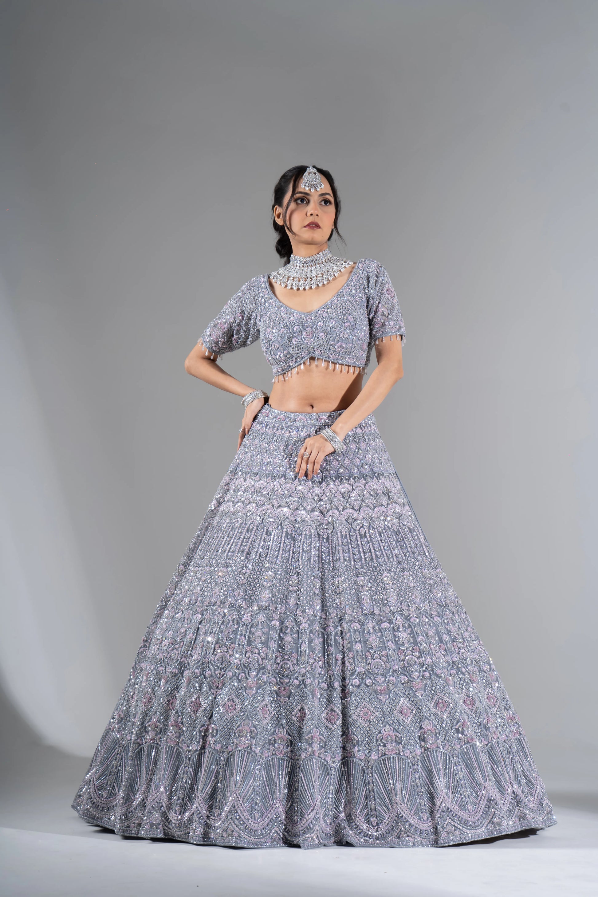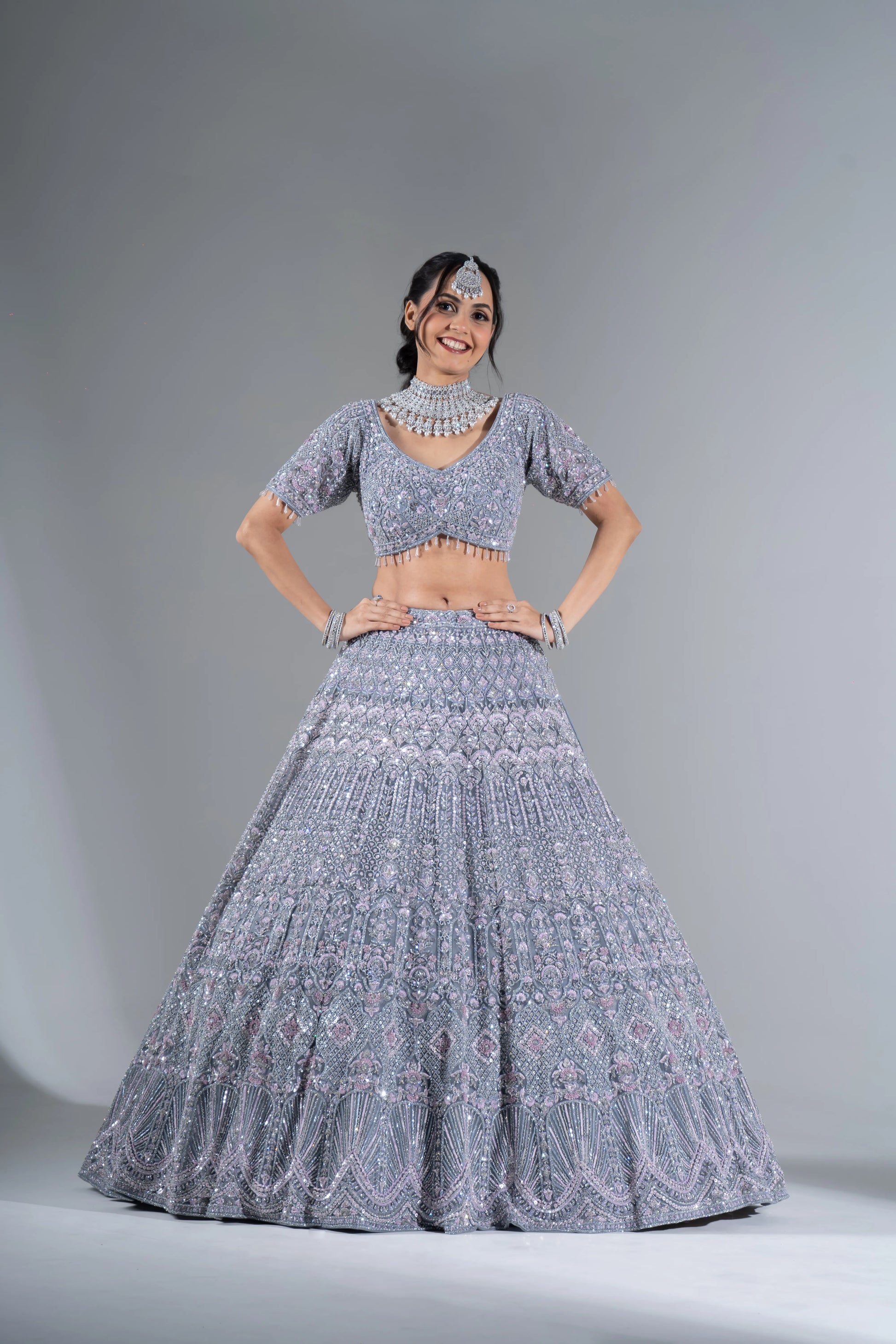 Enchanting lavender-grey lehenga with all-over crystal and sequin embroidery featuring art deco borders and geometric patterns. Perfect for the contemporary bride seeking ethereal elegance.