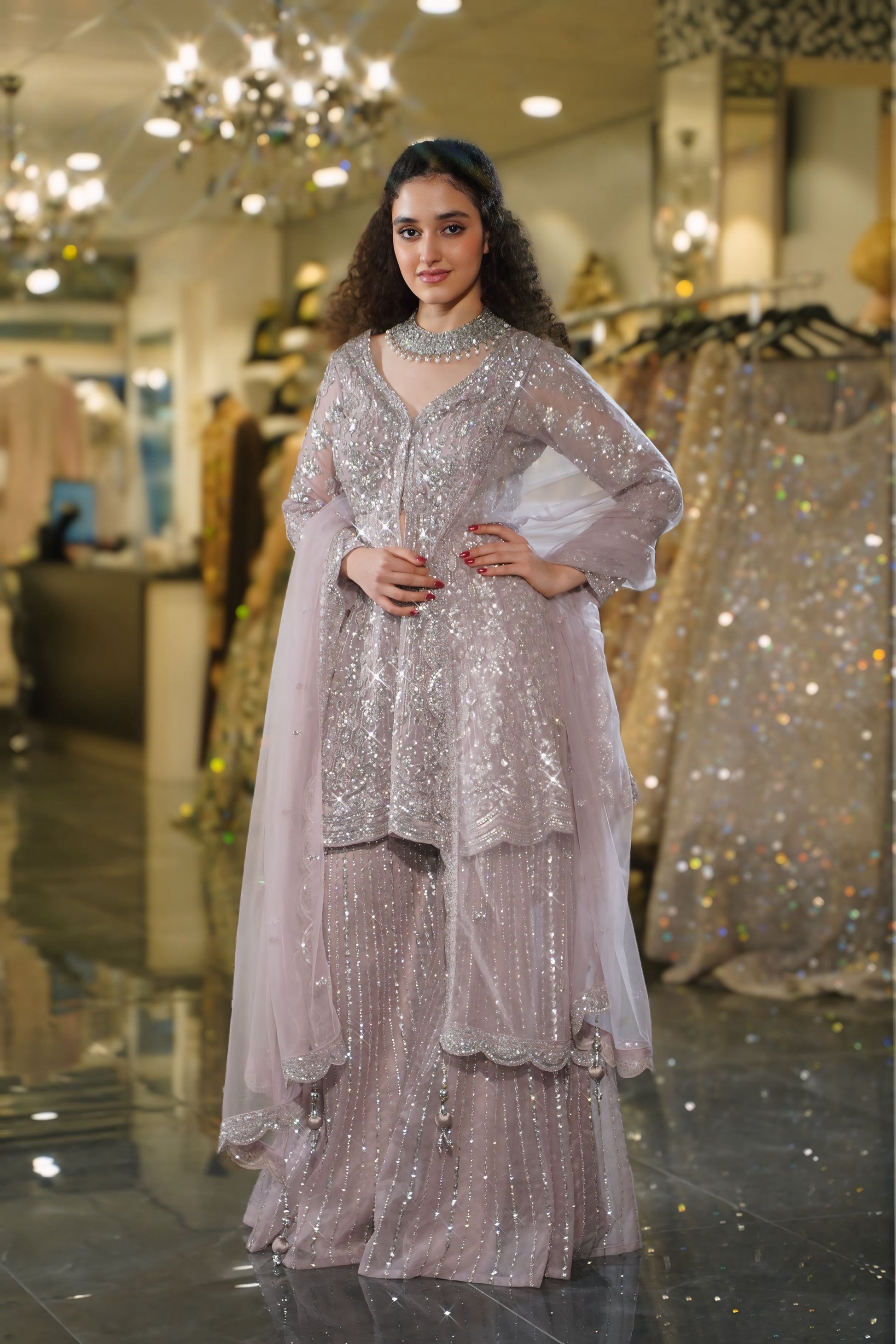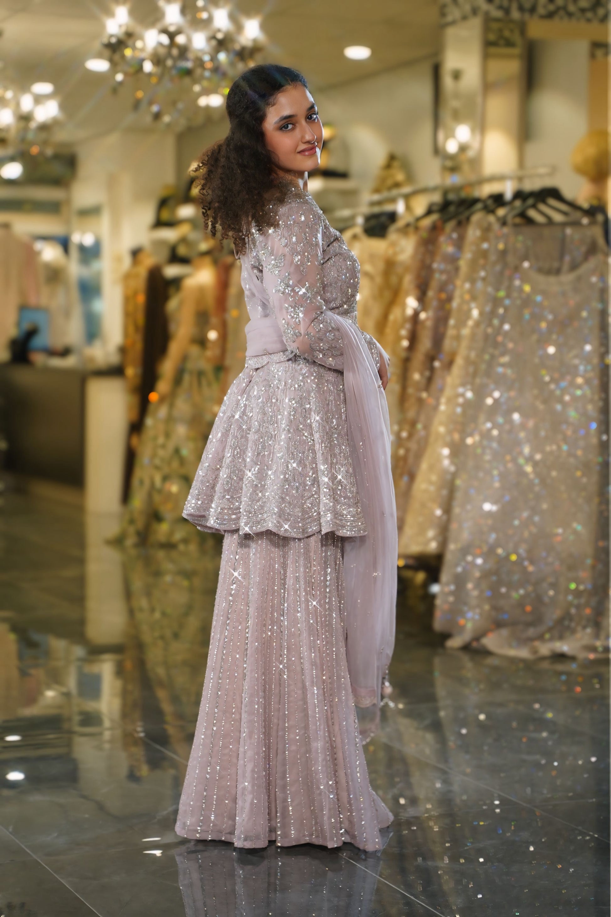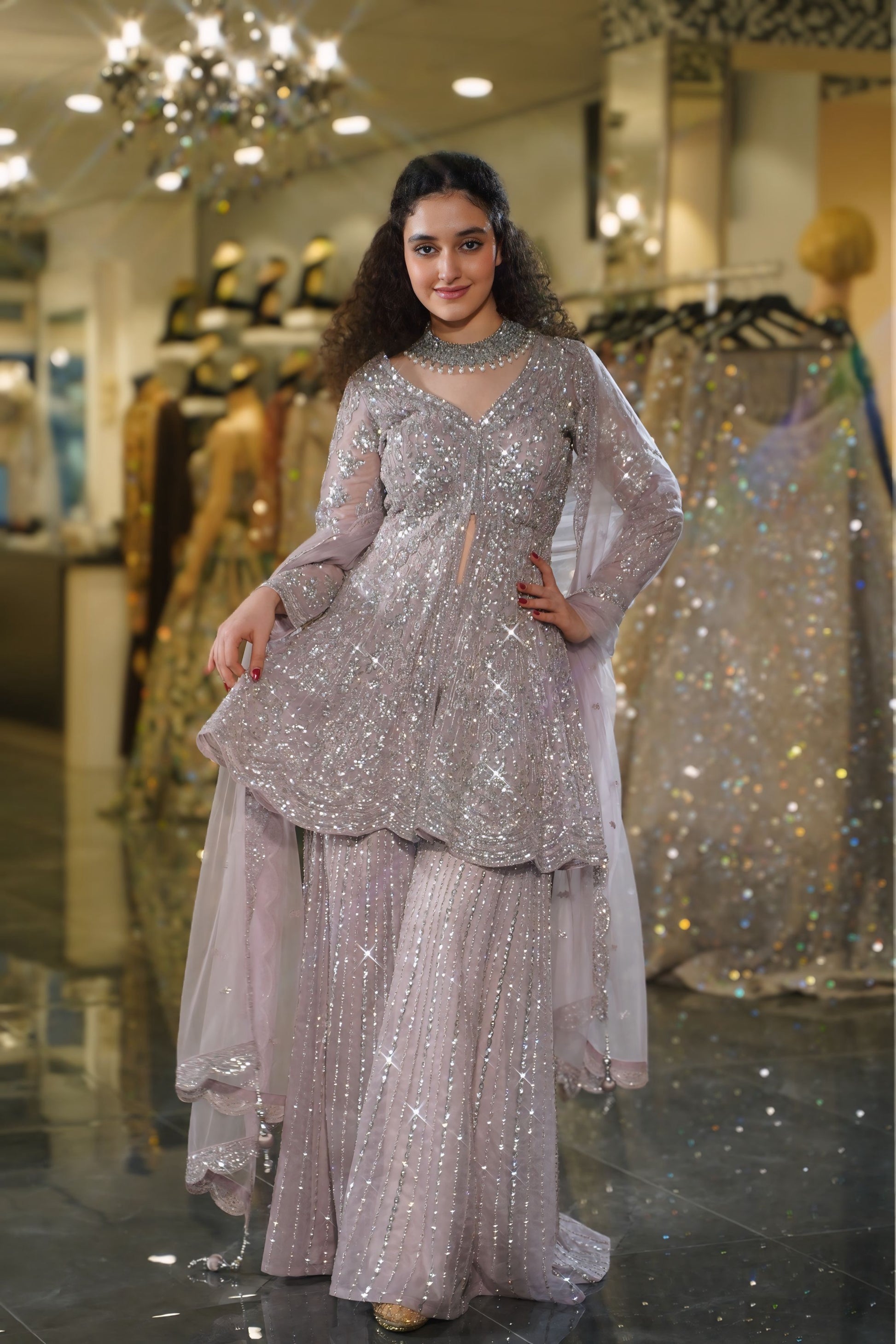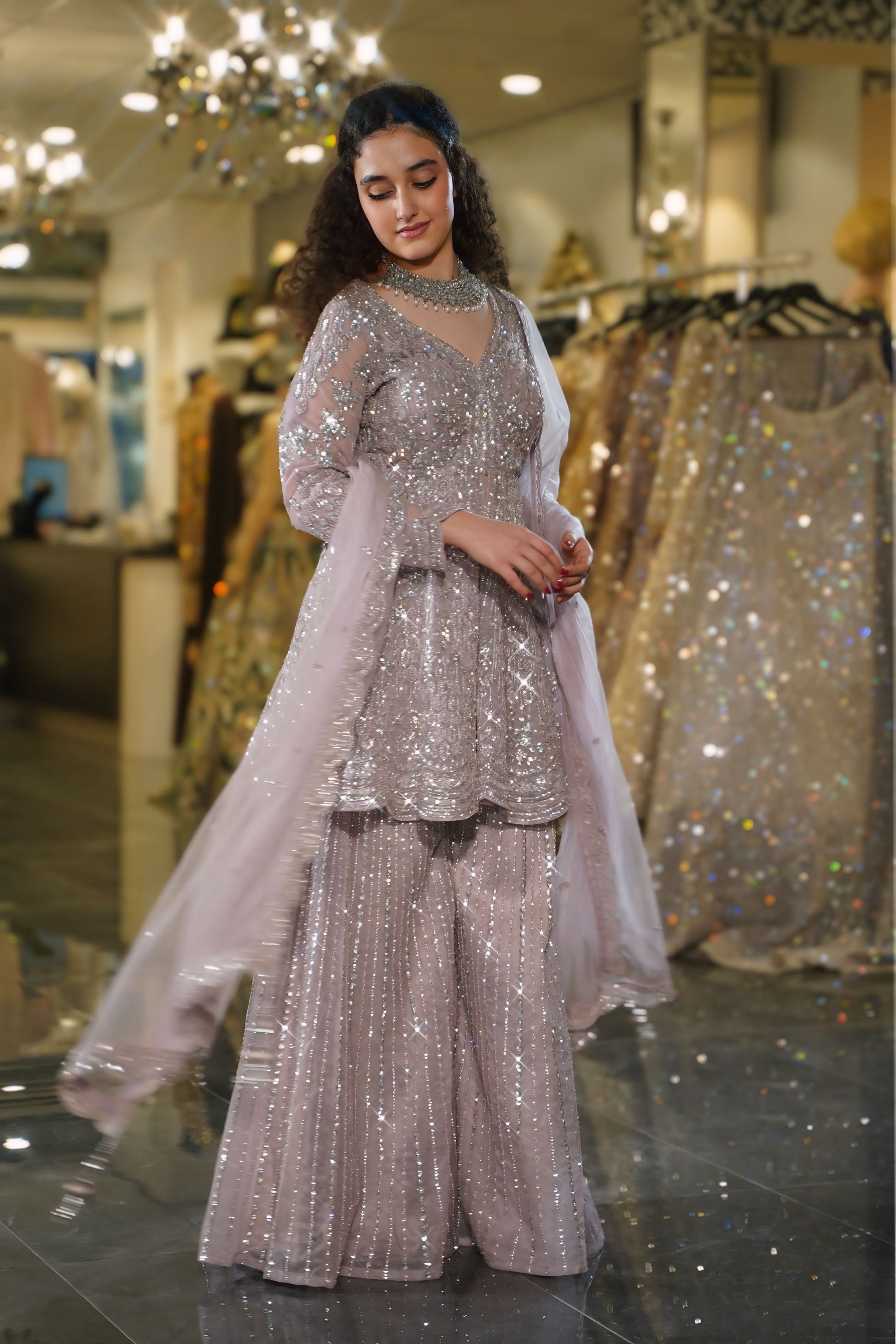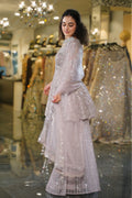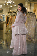 Step into a world of dreamy sophistication with this stunning Dusty Lilac Sharara Set. This enchanting ensemble combines soft pastel hues with dazzling silver sequin work, creating a look that's both romantic and contemporary. Perfect for the modern woman who seeks understated glamour with maximum impact at wedding festivities.