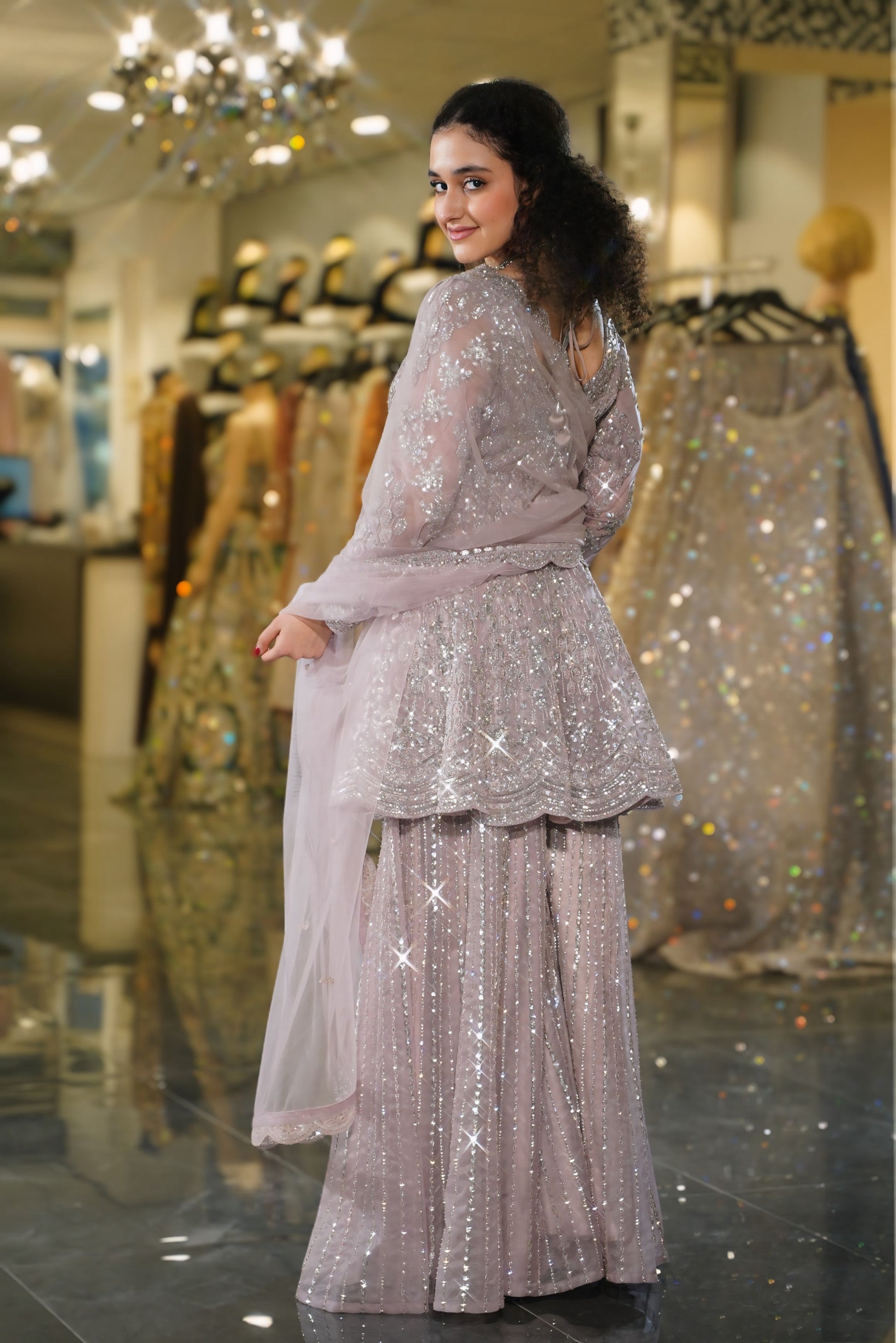 Dusty Lilac Silver Sequin Embellished Sharara Set