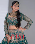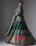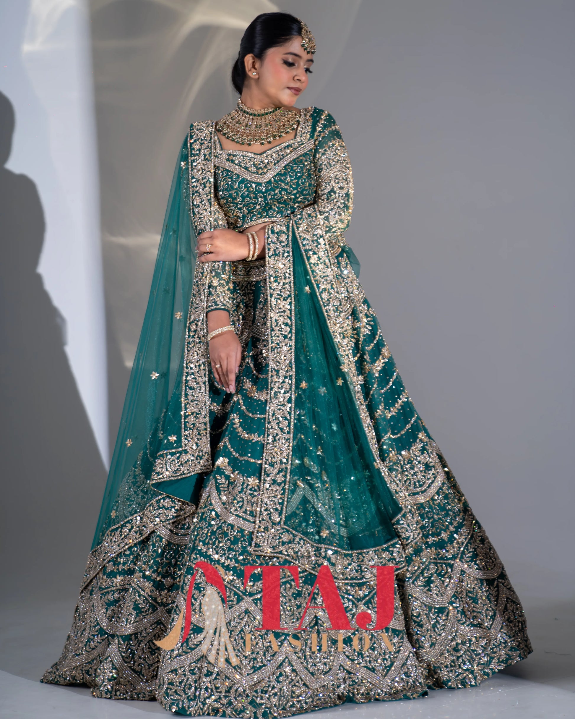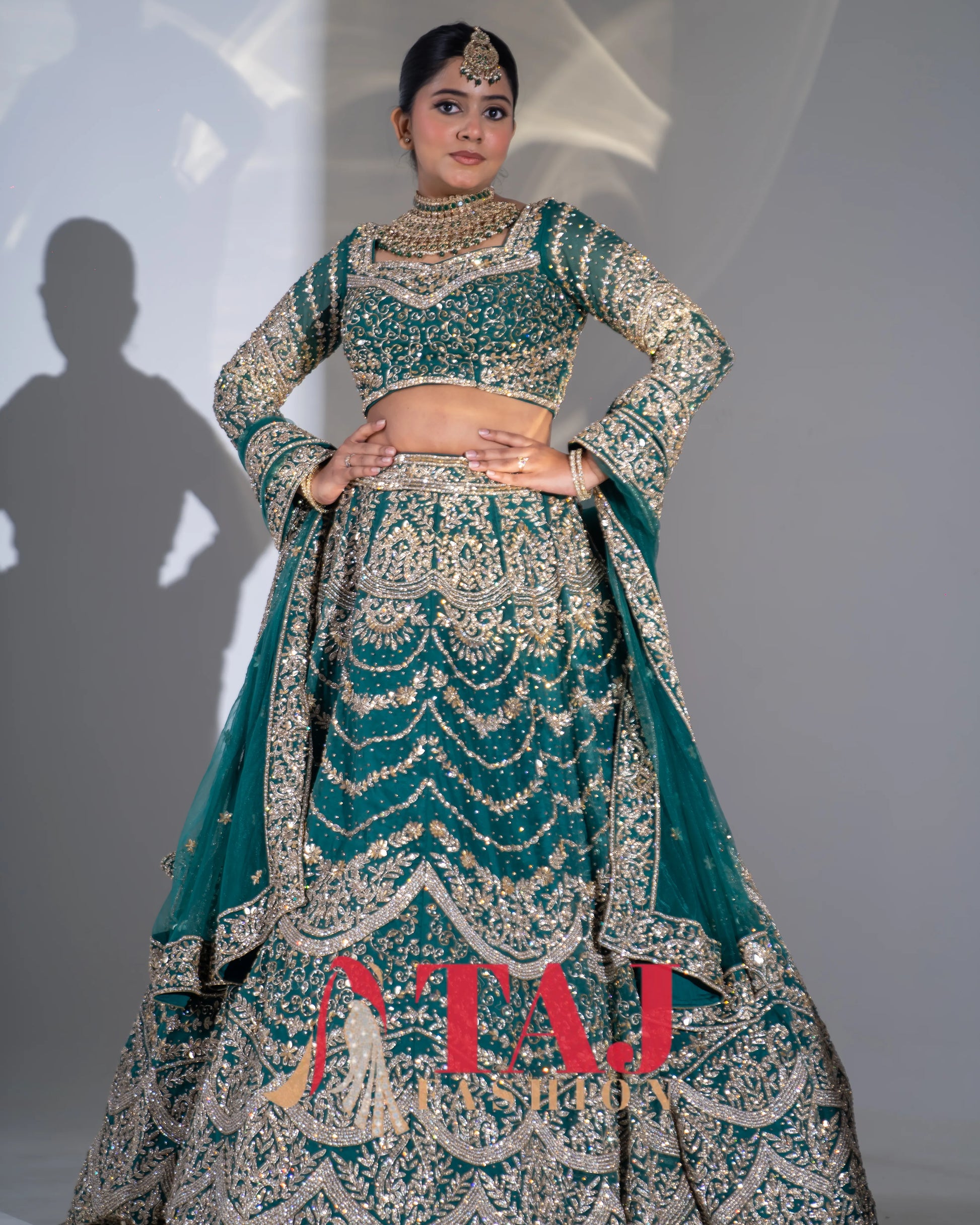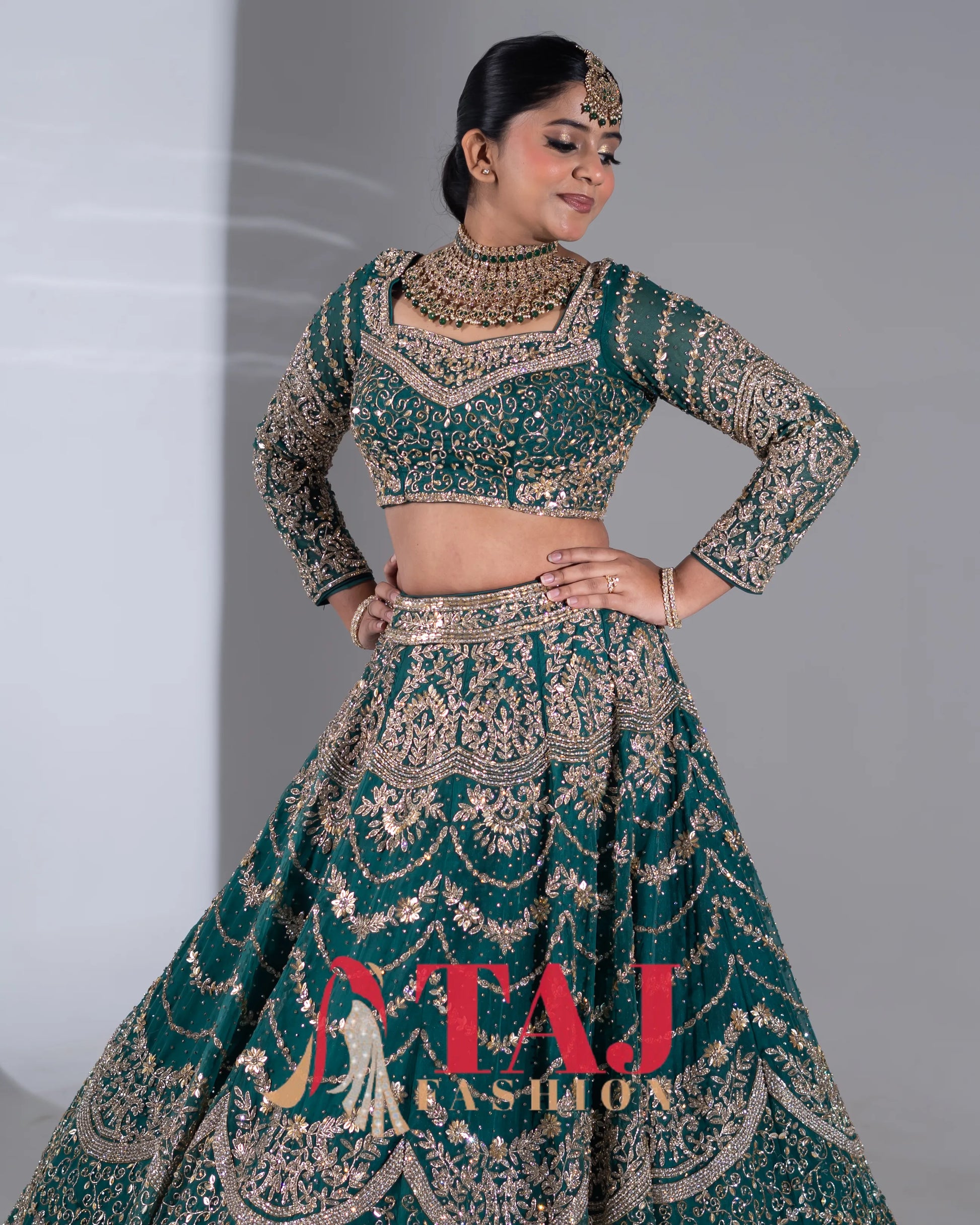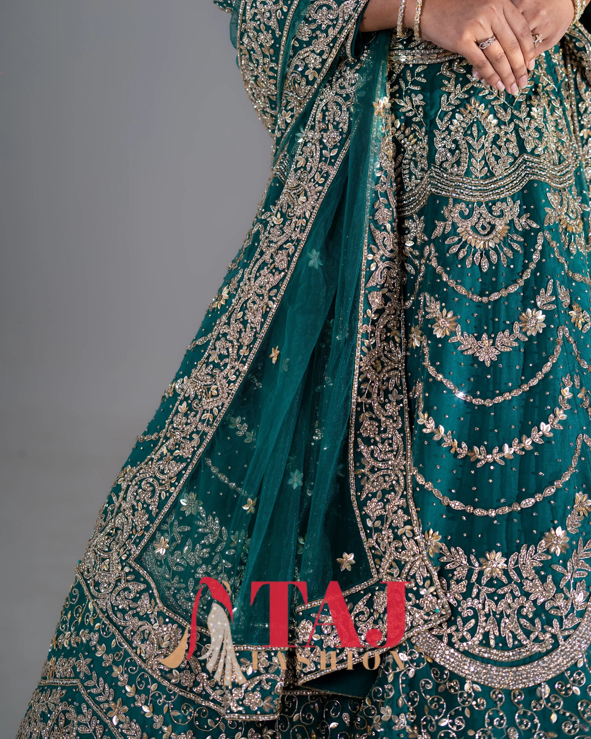 Captivate the crowd with this breathtaking Emerald Green Bridal Lehenga. A symbol of royalty and prosperity, this ensemble features a deep, jewel-toned green base that provides a stunning contrast to the heavy gold and silver embroidery. Designed for the bride who wants to look regal and timeless, this outfit is perfect for a grand Reception, Sangeet, or a traditional wedding ceremony where deep colors are celebrated.