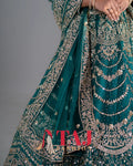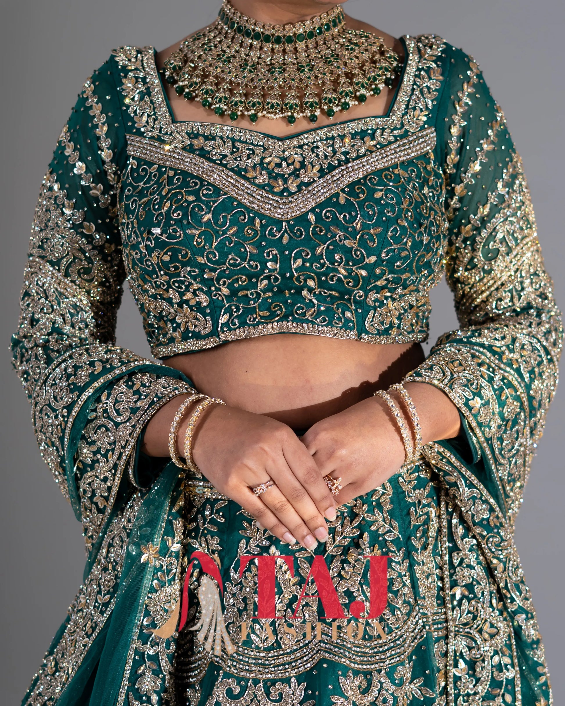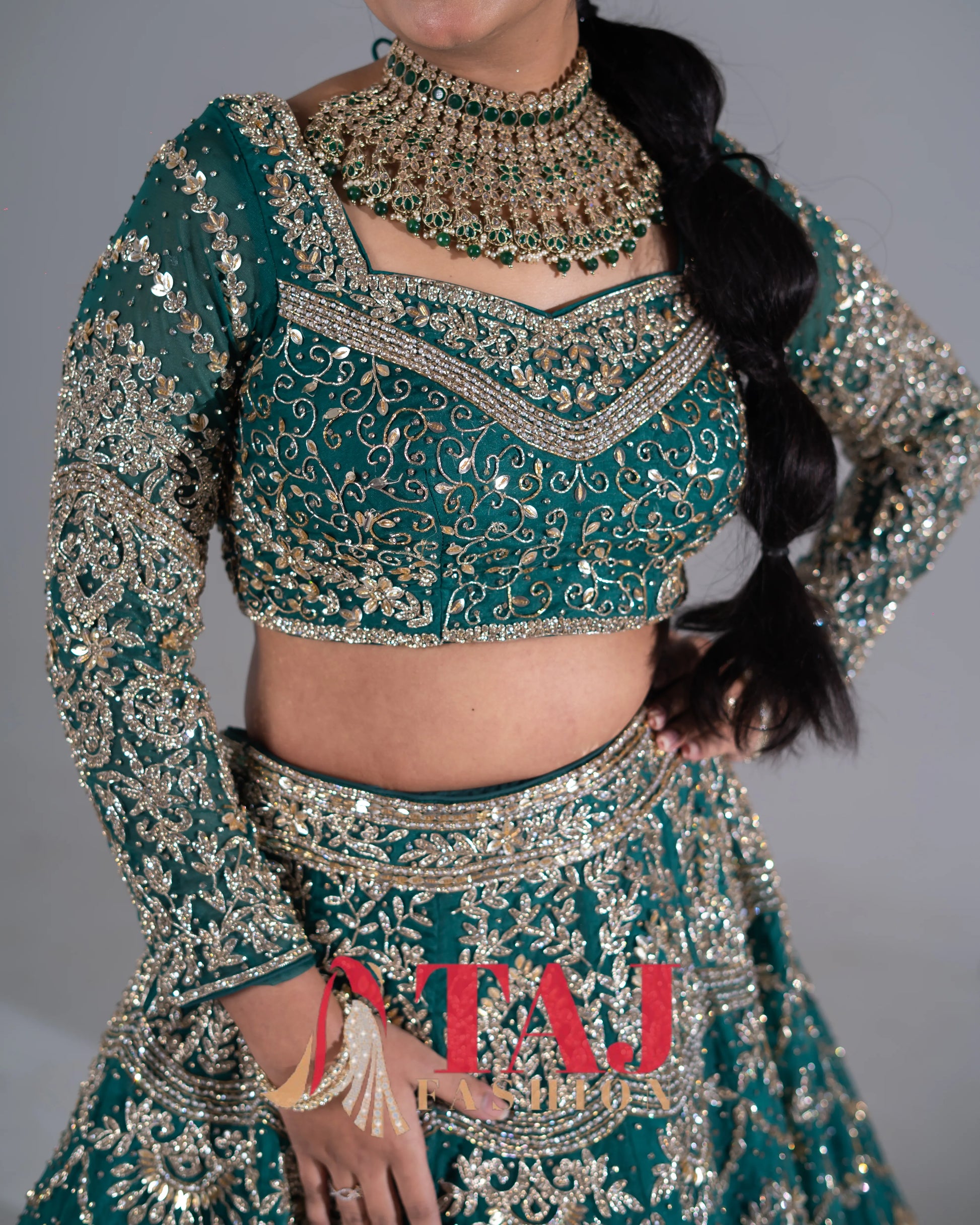 | Blouse (Choli) | Full-sleeved emerald choli with sheer embroidered sleeves and heavy zardosi work |