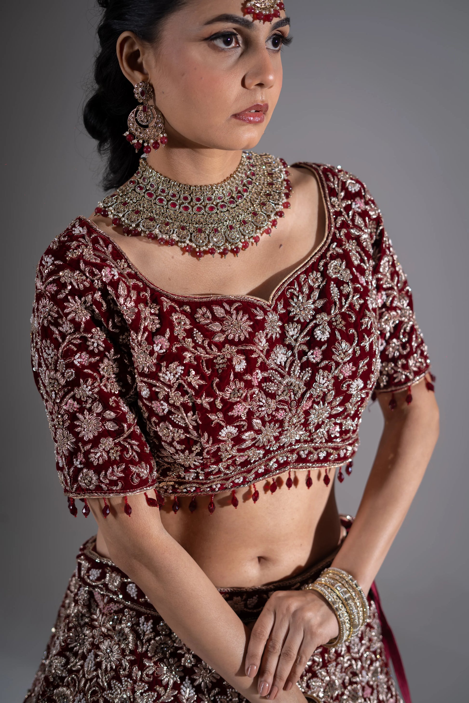 | Blouse (Choli) | Short-sleeved velvet choli with round neckline, heavy silver embroidery, and bead fringe detailing |