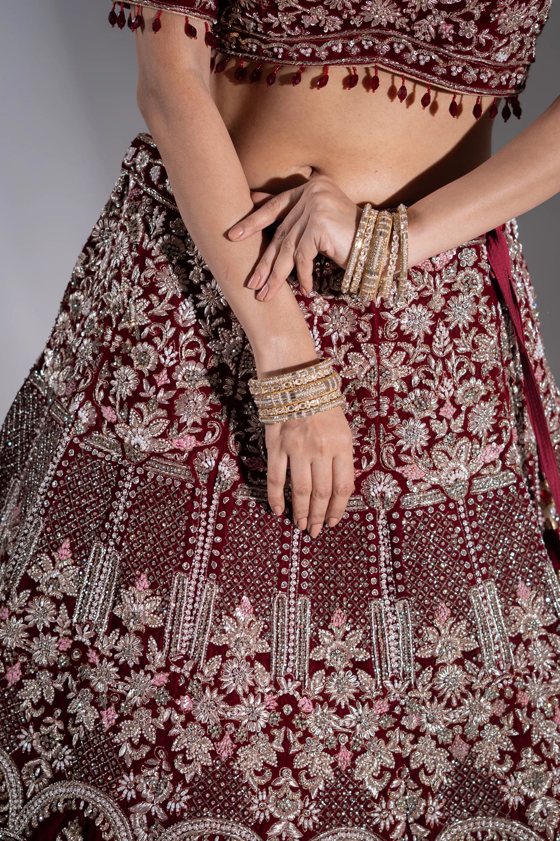 | Lehenga (Skirt) | Voluminous A-line velvet skirt featuring Mughal arches, vertical vines, and a heavy border |