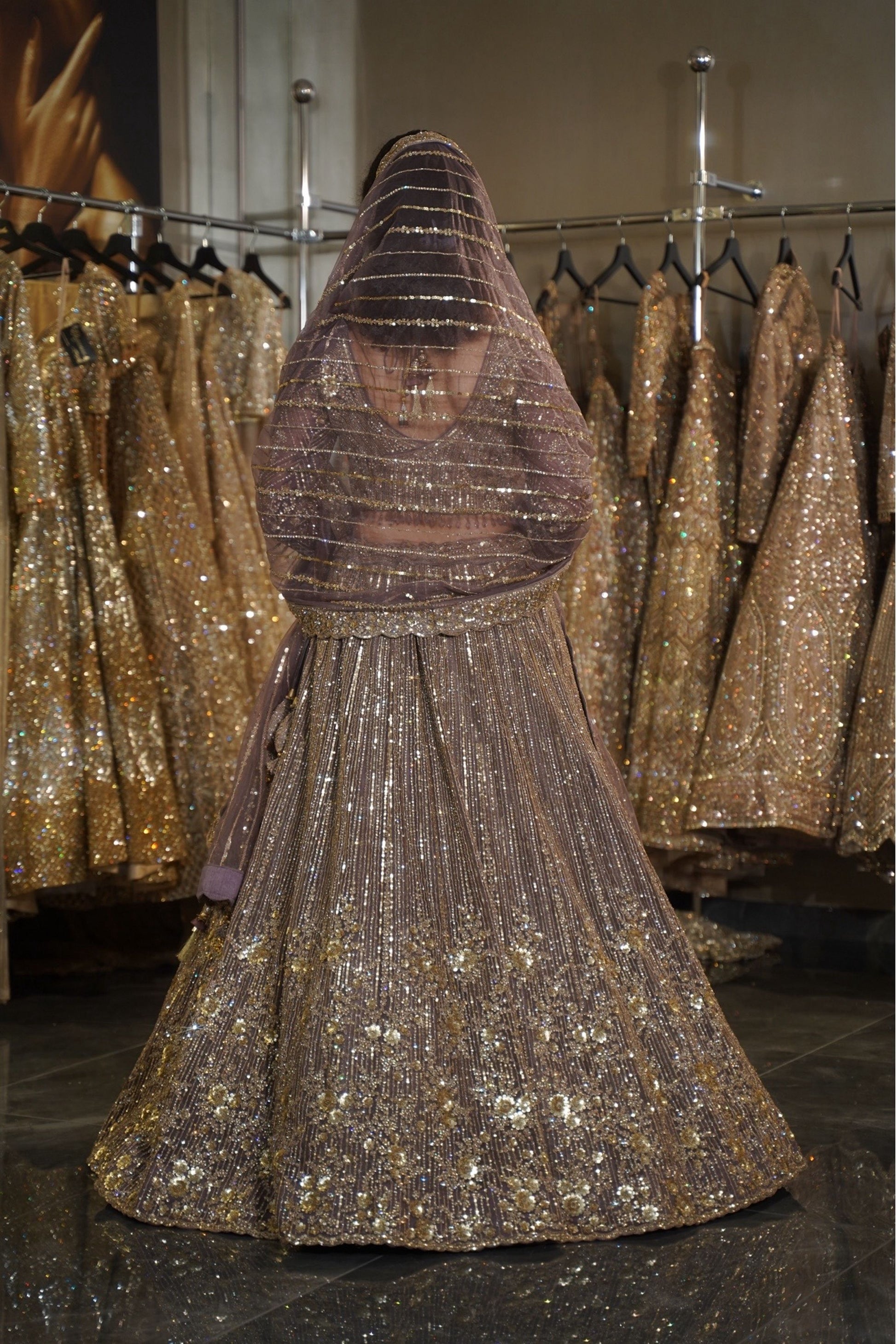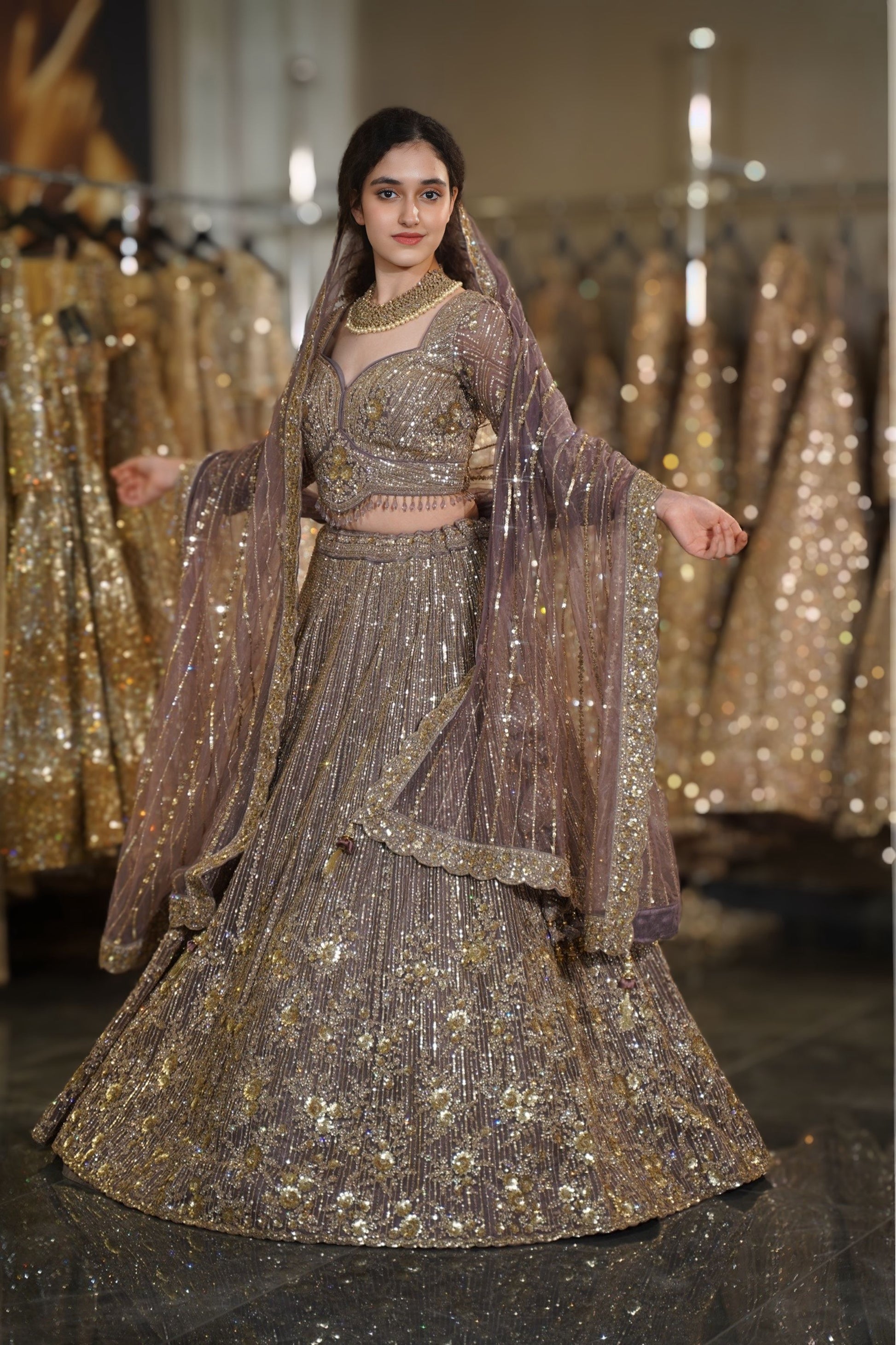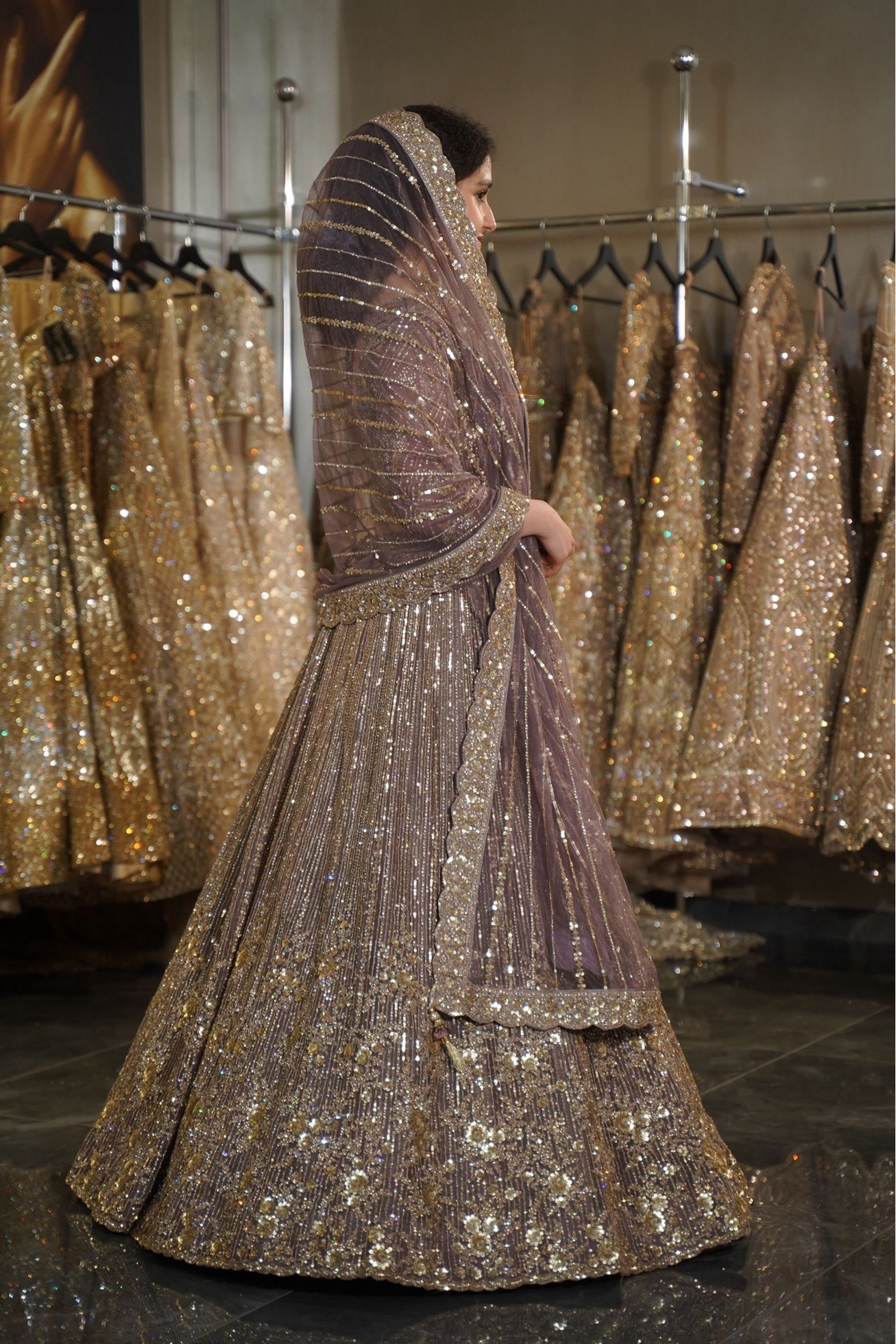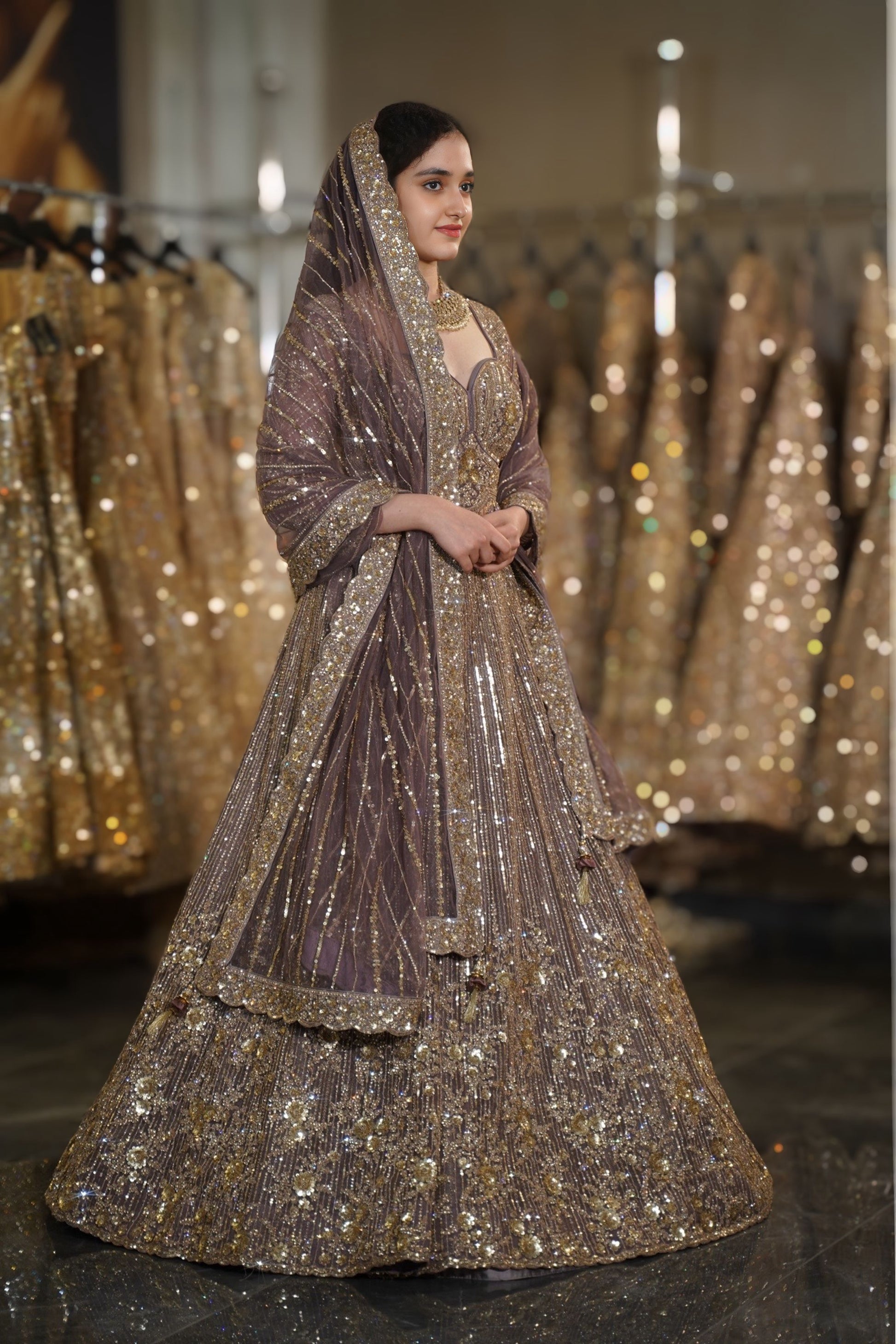 Step into the spotlight with this sophisticated Taupe Mauve Lehenga Set. A color that exudes mystery and understated luxury, this deep mushroom-brown hue is a refreshing departure from standard brights. The ensemble features a mesmerizing cascade of vertical sequin lines that flow into a garden of floral sparkles at the hem. Perfect for the unconventional bride or fashion-forward guest who wants a look that is dark, dreamy, and undeniably chic for an evening reception or cocktail gala.
