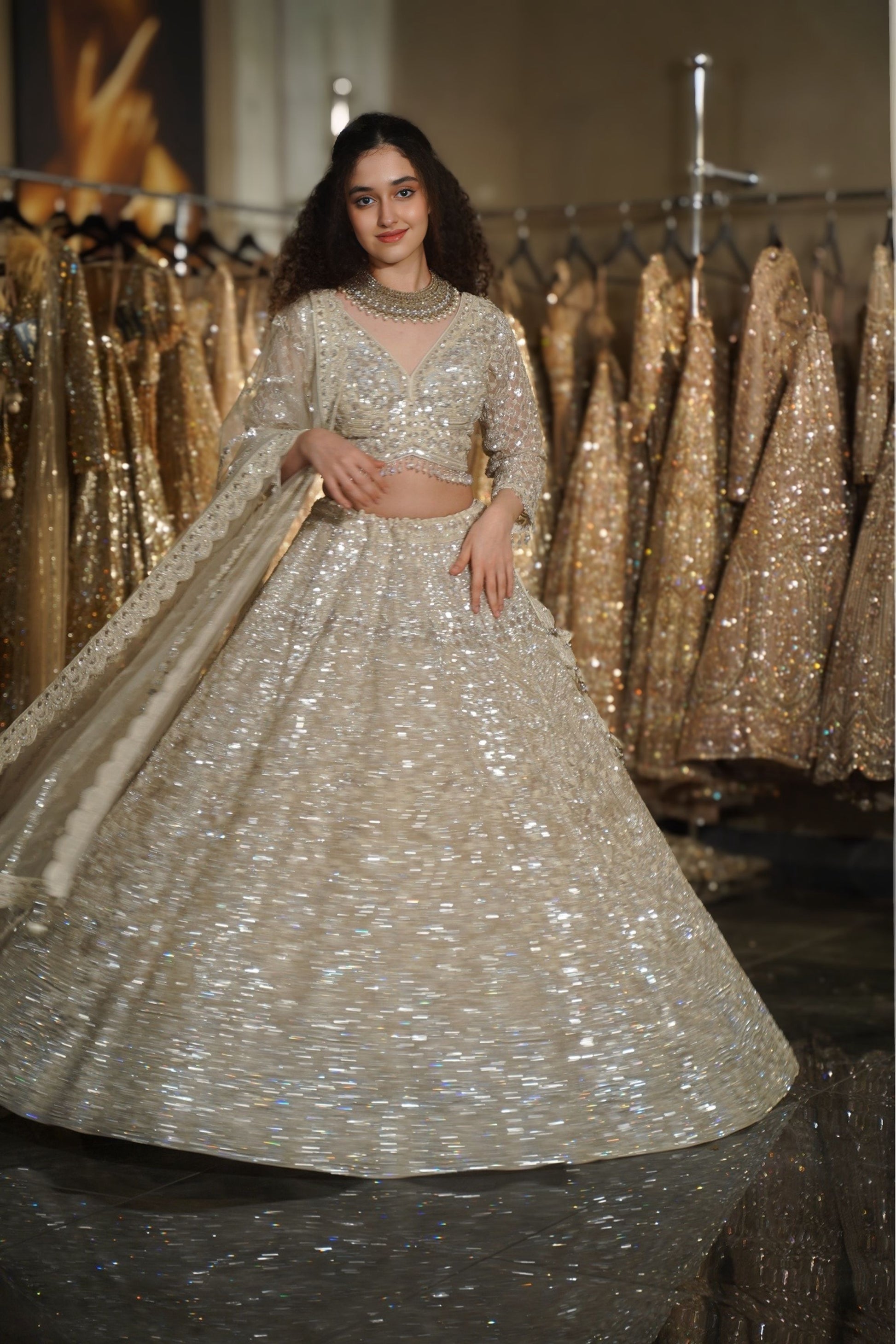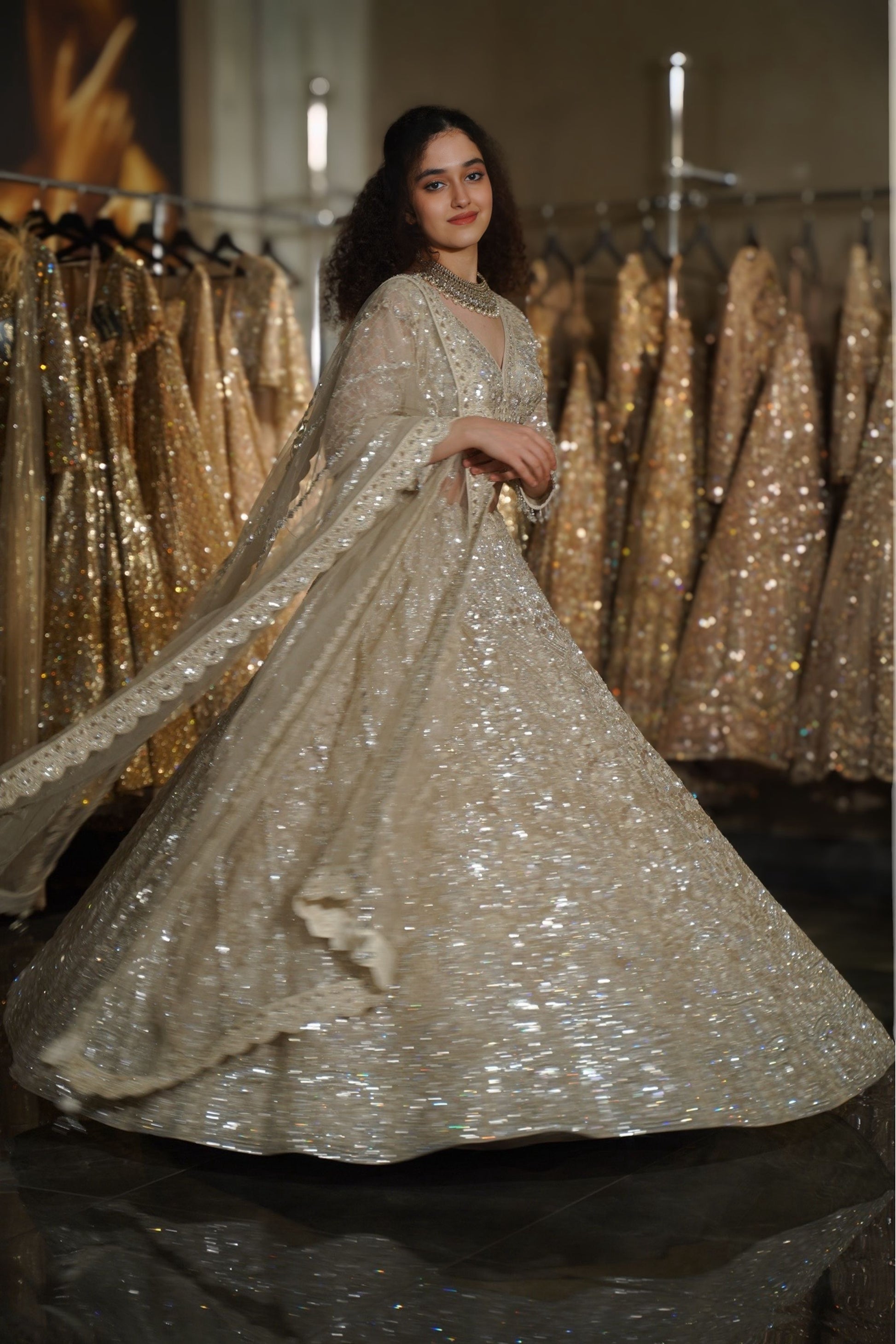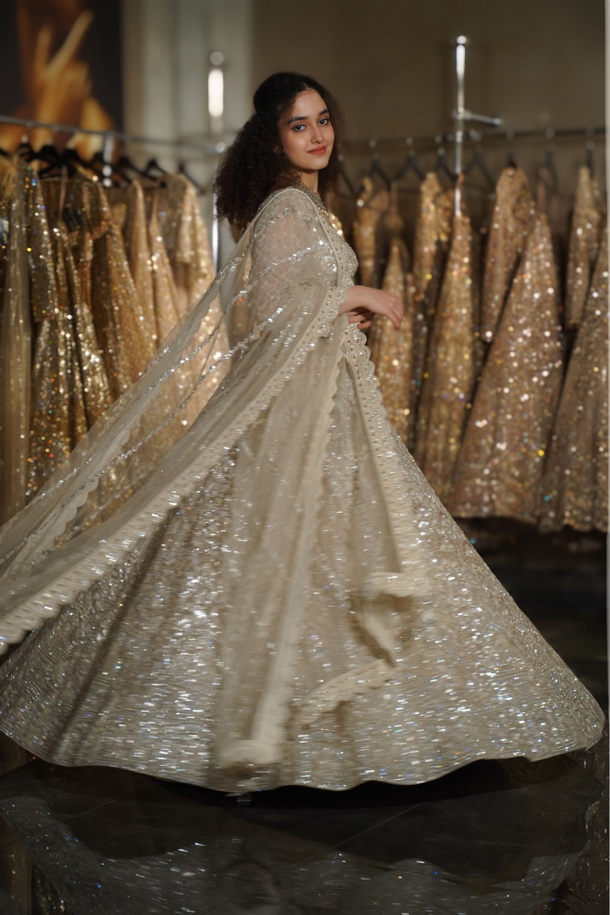 Ivory Silver Heavy Sequin & Crystal Embroidered Lehenga Set