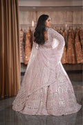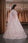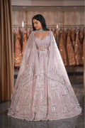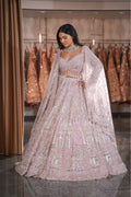 Step into your own royal fairytale with this breathtaking Lilac Pink Bridal Lehenga. A masterpiece of storytelling through embroidery, this ensemble captures the grandeur of royal heritage in a soft, dreamy pastel hue. The delicate pink base is completely illuminated by heavy silver artistry depicting majestic palace domes and arches. Designed for the bride who wants to feel like a modern-day princess, this outfit is the ultimate choice for a grand Reception, Engagement, or a magical Sangeet night.