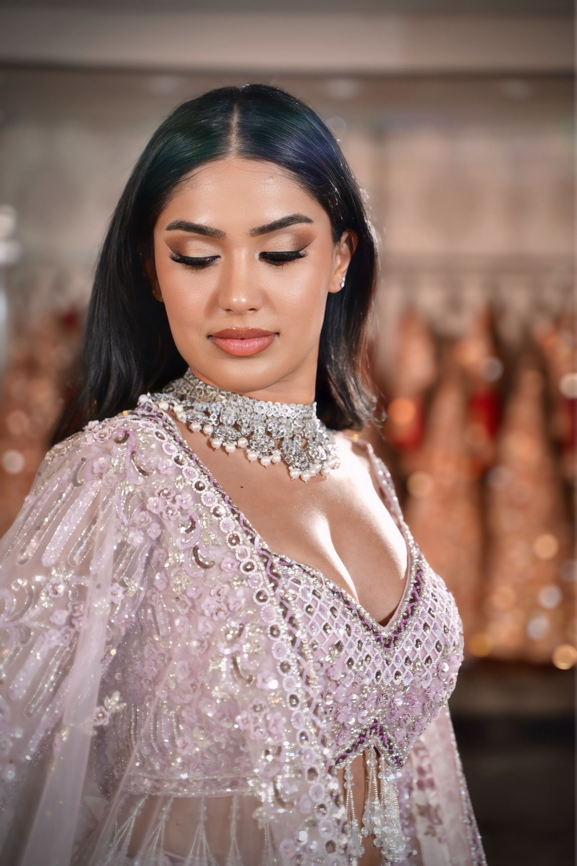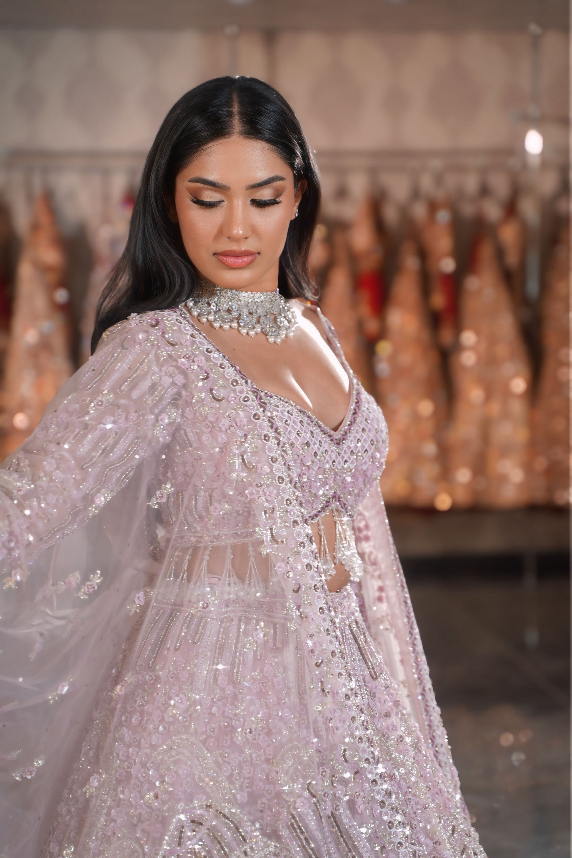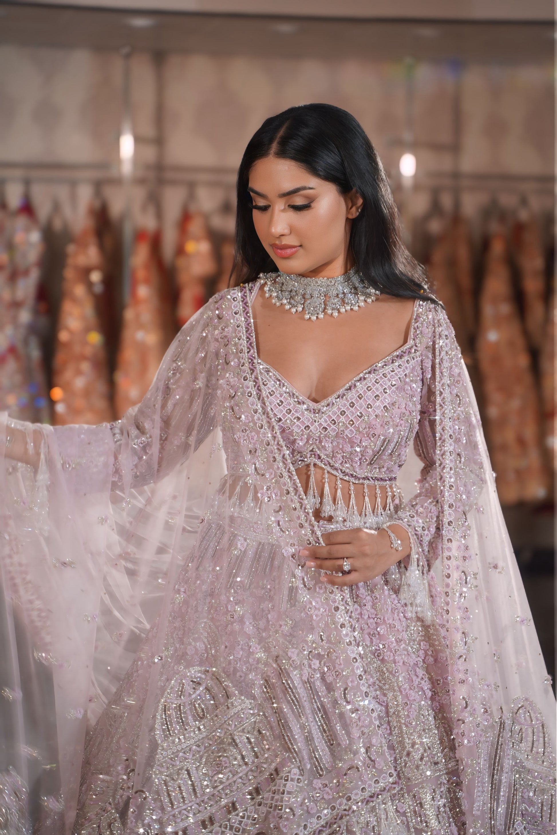 | Blouse (Choli) | Sleeveless/strap lilac choli with heavy silver work and long crystal bead tassels at the hem |