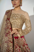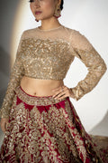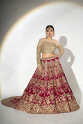 Deep Maroon Velvet & Gold Heavy Zardosi Bridal Lehenga With Royal Trail