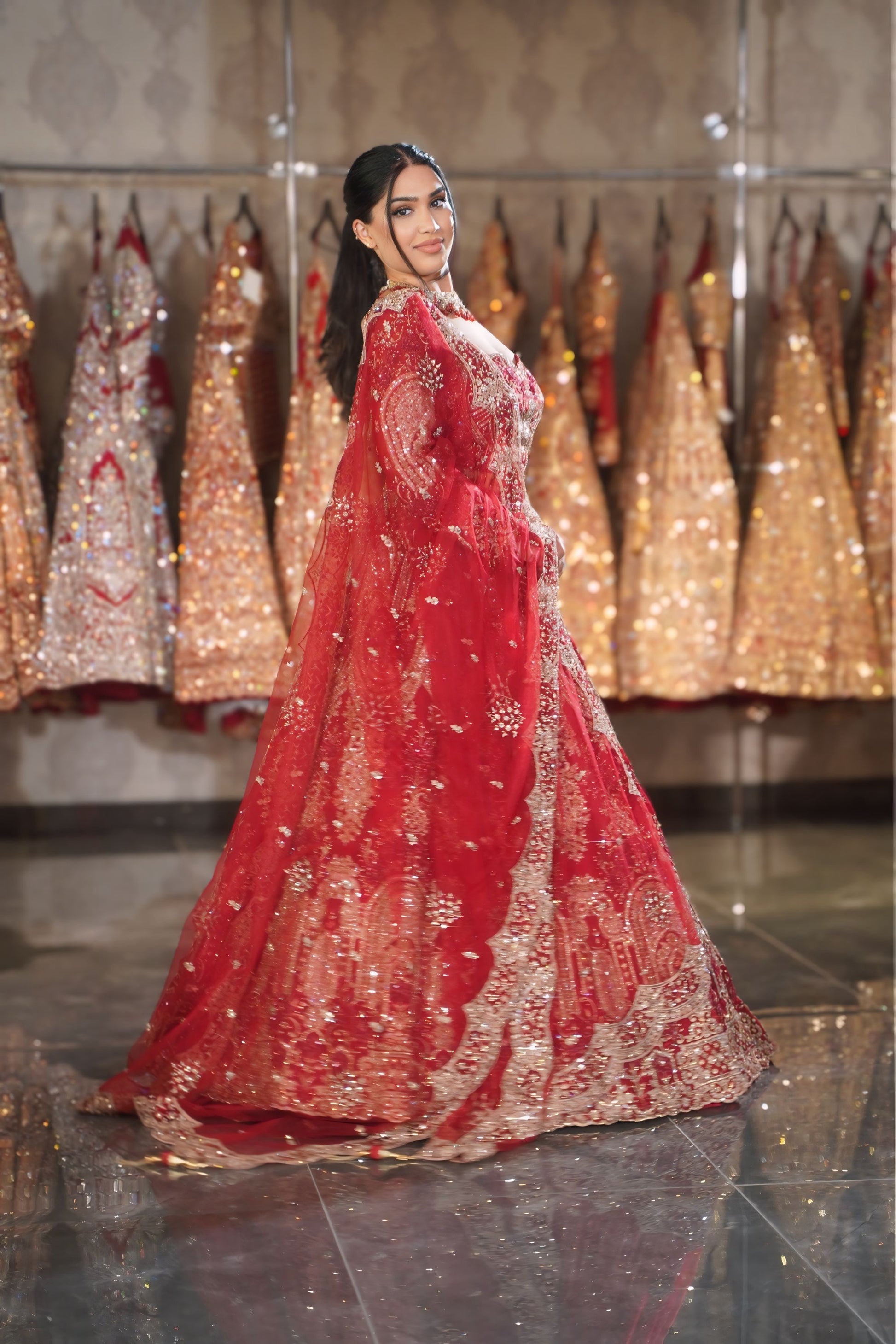 Embody the spirit of the traditional Indian bride with this magnificent Scarlet Red Bridal Lehenga Set. This ensemble is a celebration of heritage, featuring the classic bridal red hue adorned with elaborate gold and silver craftsmanship. It is designed for the bride who dreams of a majestic, royal entrance on her big day, offering a look that is both culturally rooted and breathtakingly opulent.