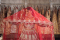 | Blouse (Choli) | Long-sleeved scarlet blouse with heavy embroidery, sheer sleeve details, and a tassel-tie back |