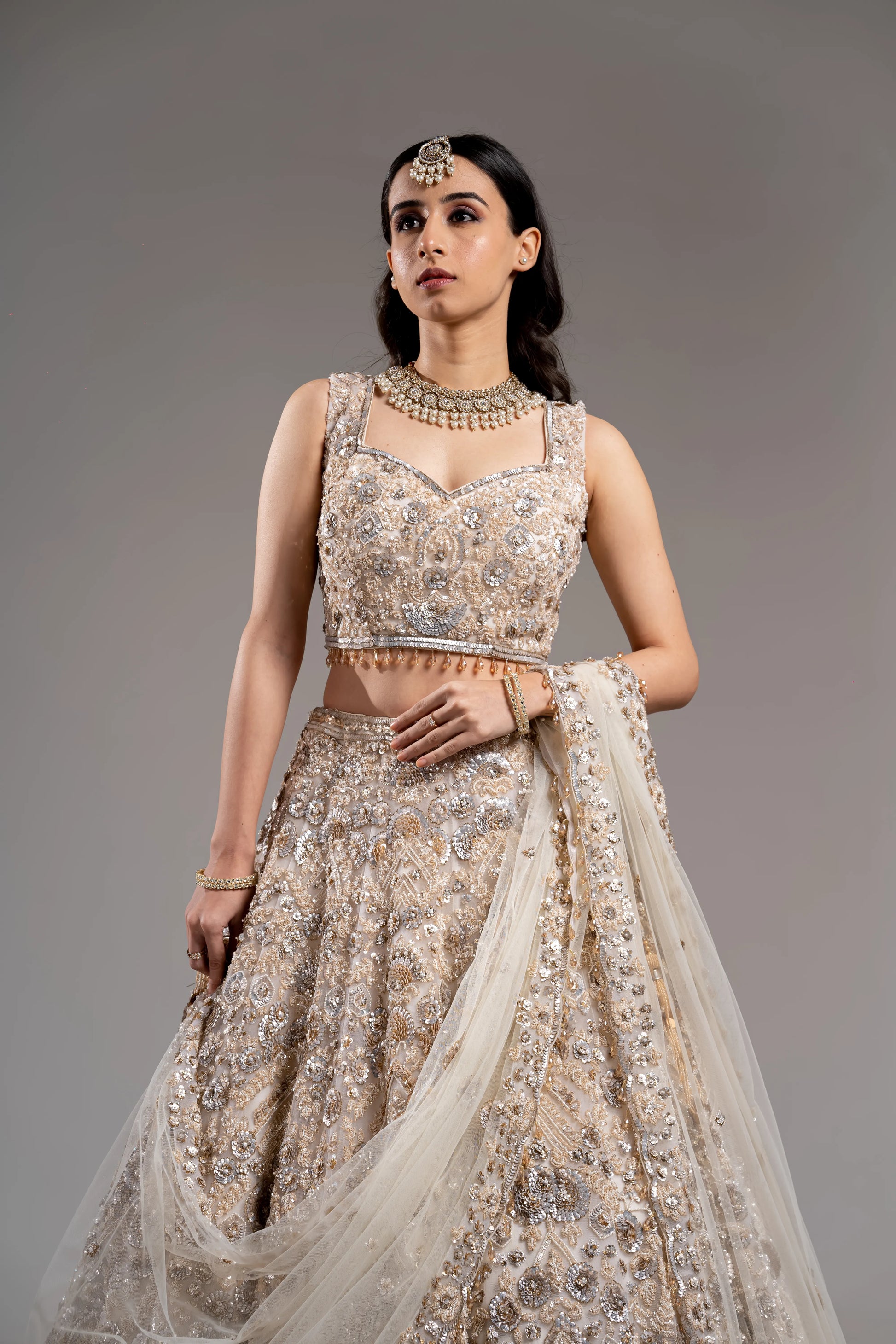Champagne Ivory Silver & Gold Zardosi Embroidered Bridal Lehenga