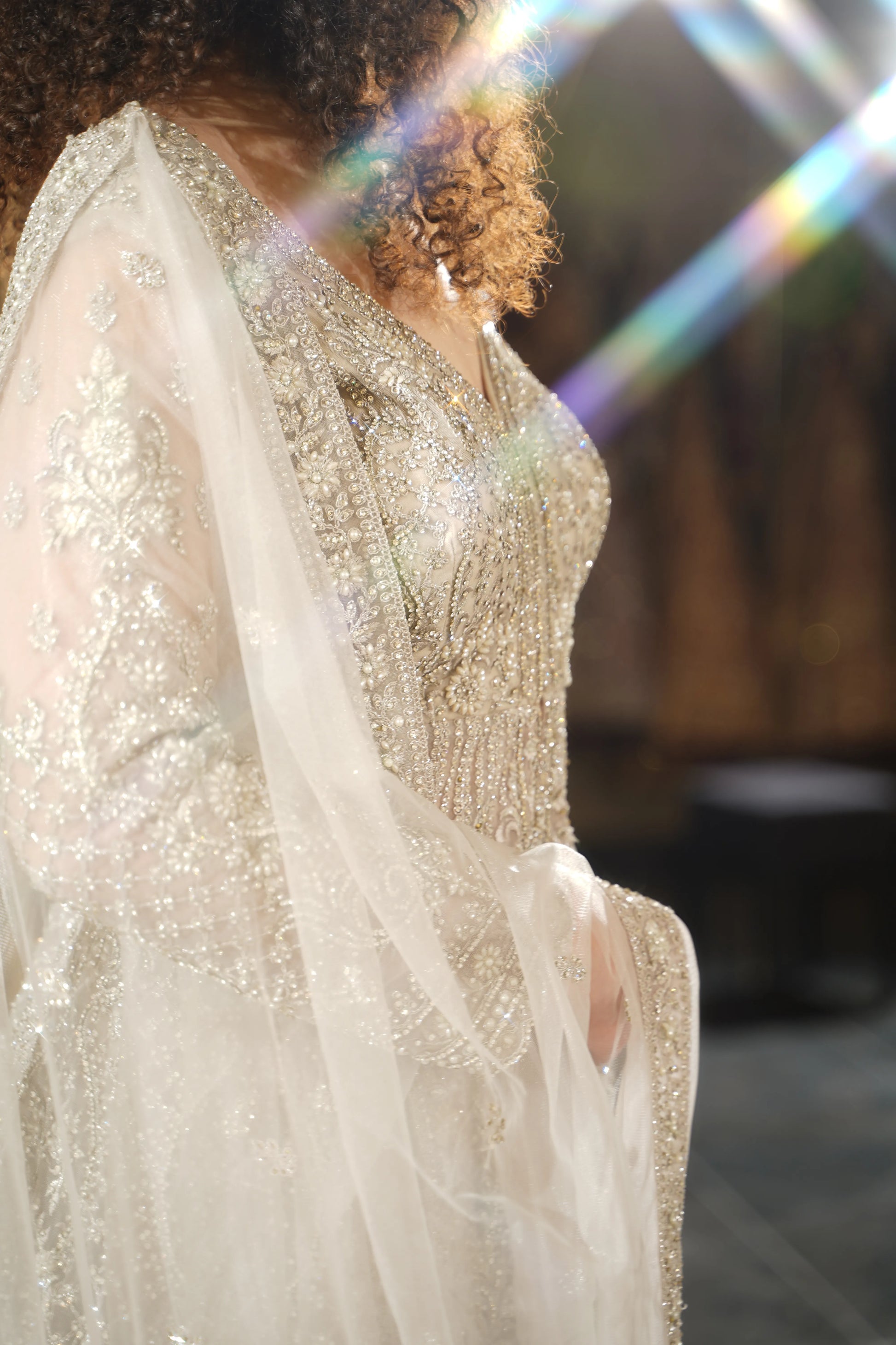 - Tonal Embroidery: Silver and beige thread work that blends seamlessly with the champagne base π