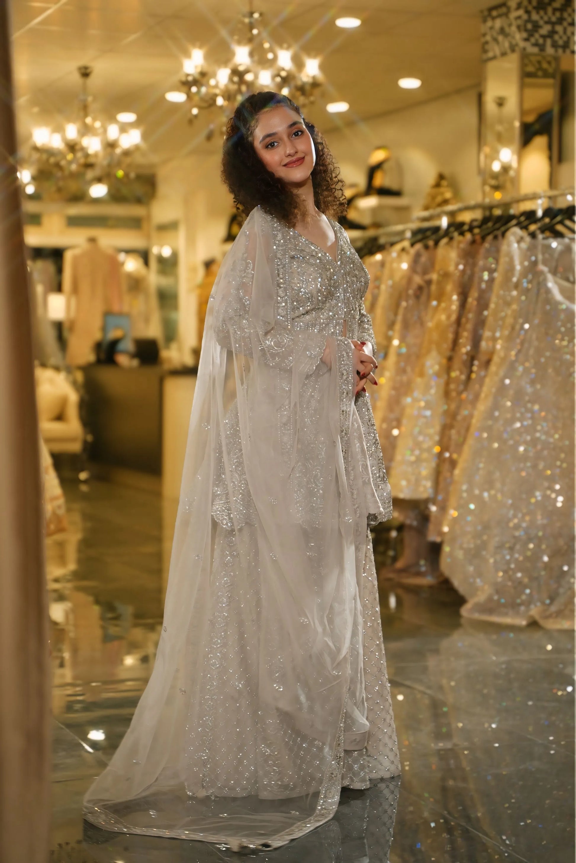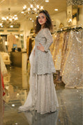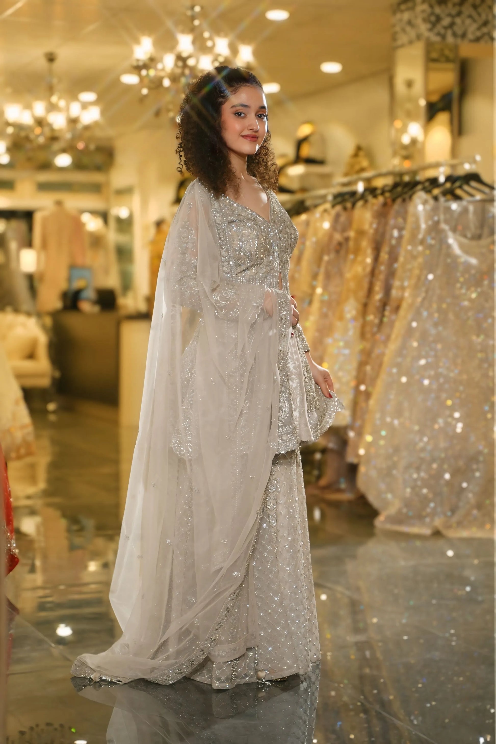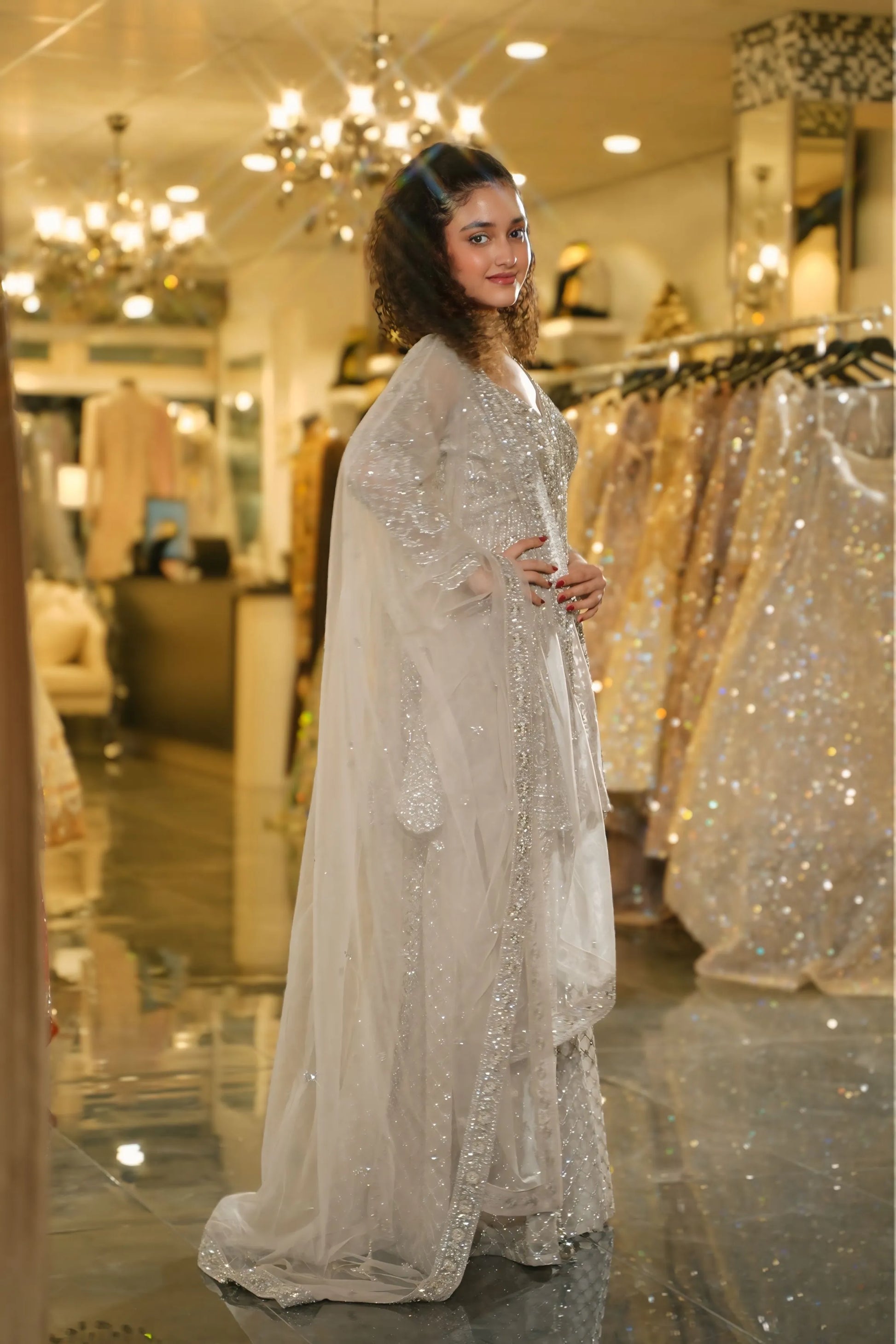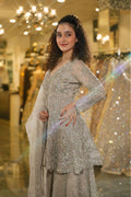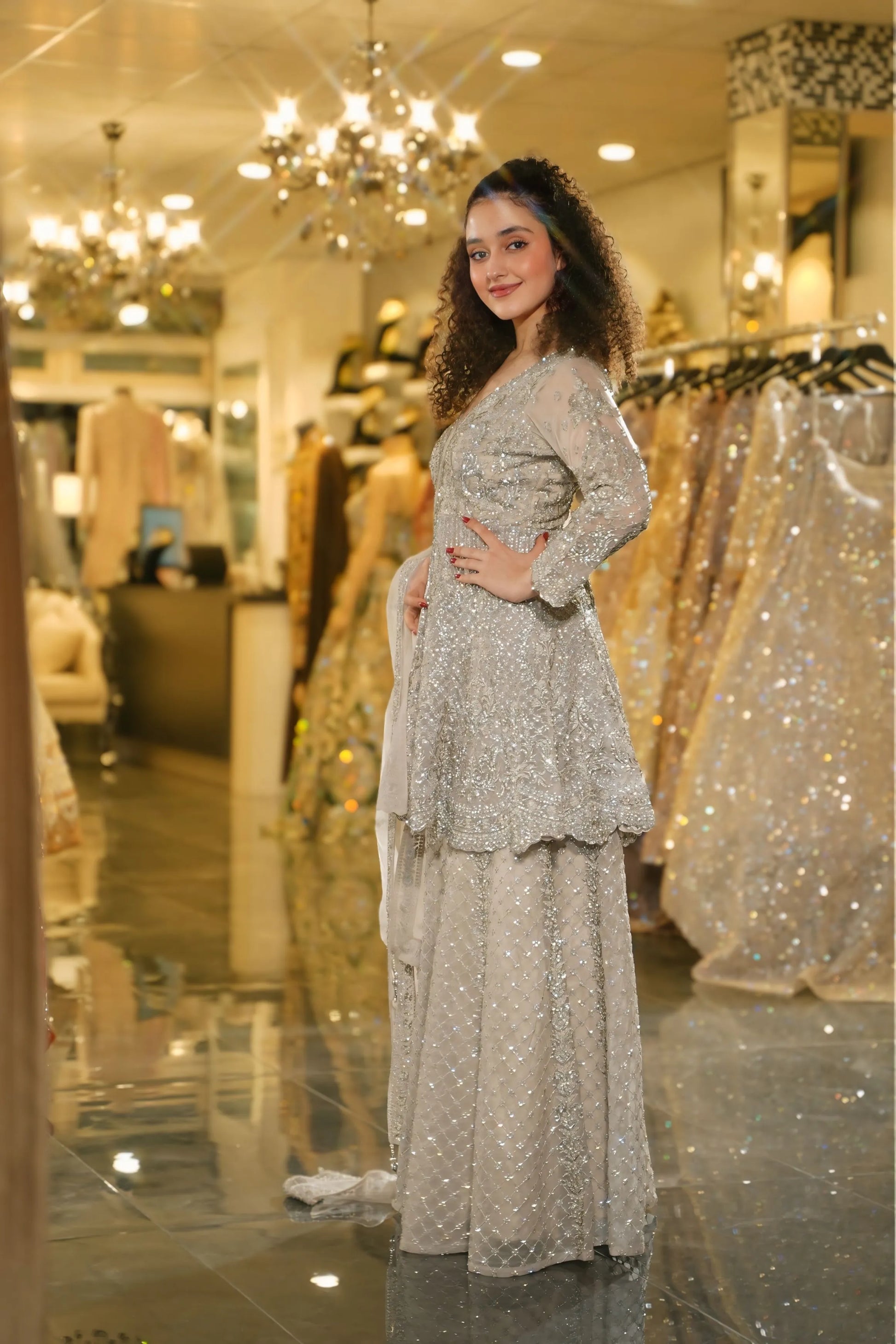 Embody effortless elegance with this stunning Champagne Silver Sharara Set. This sophisticated ensemble radiates subtle glamour through its neutral tone and all-over sequin embellishments. Perfect for the modern woman who appreciates refined luxury and wants to make a statement without overpowering color at festive celebrations.
