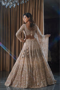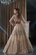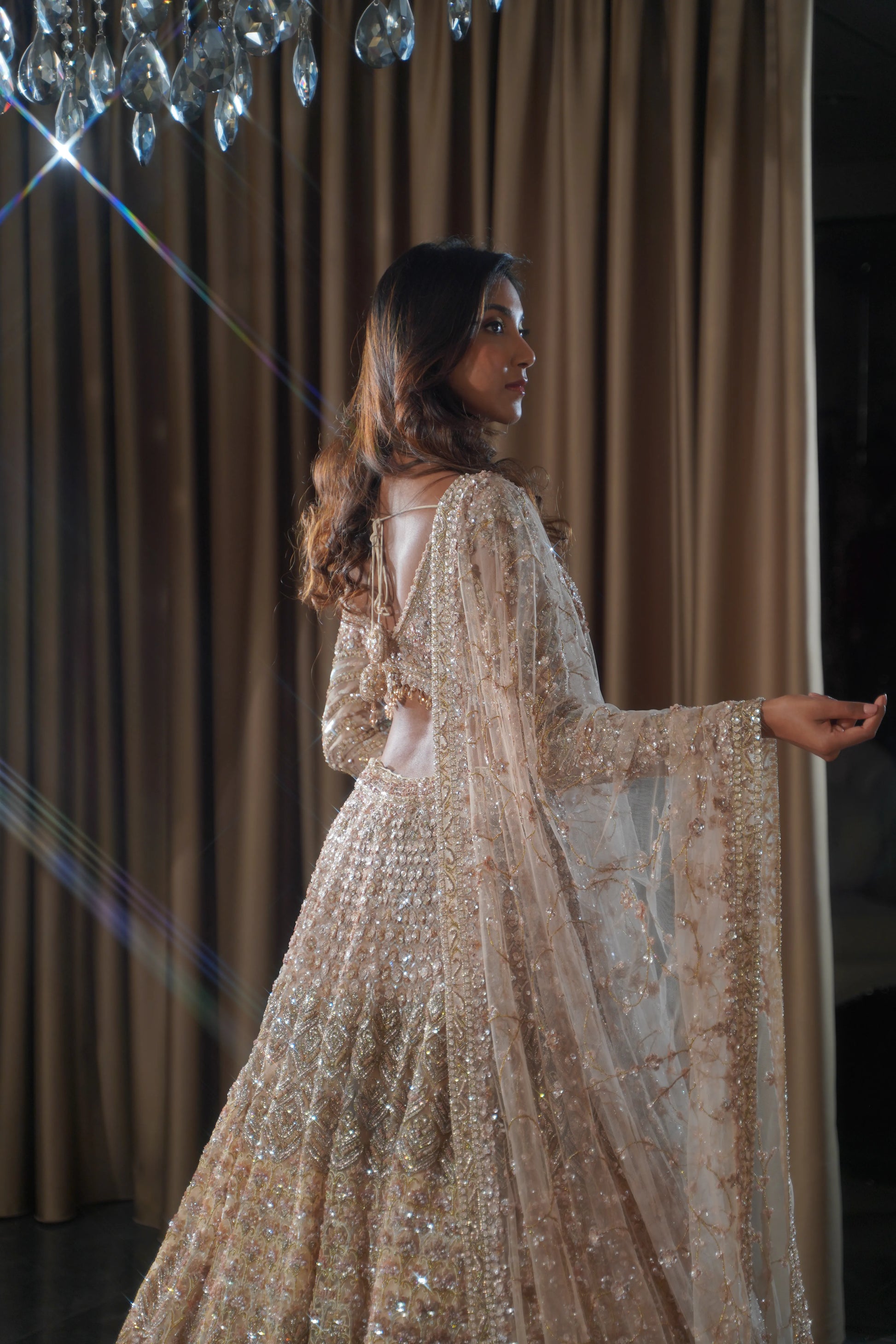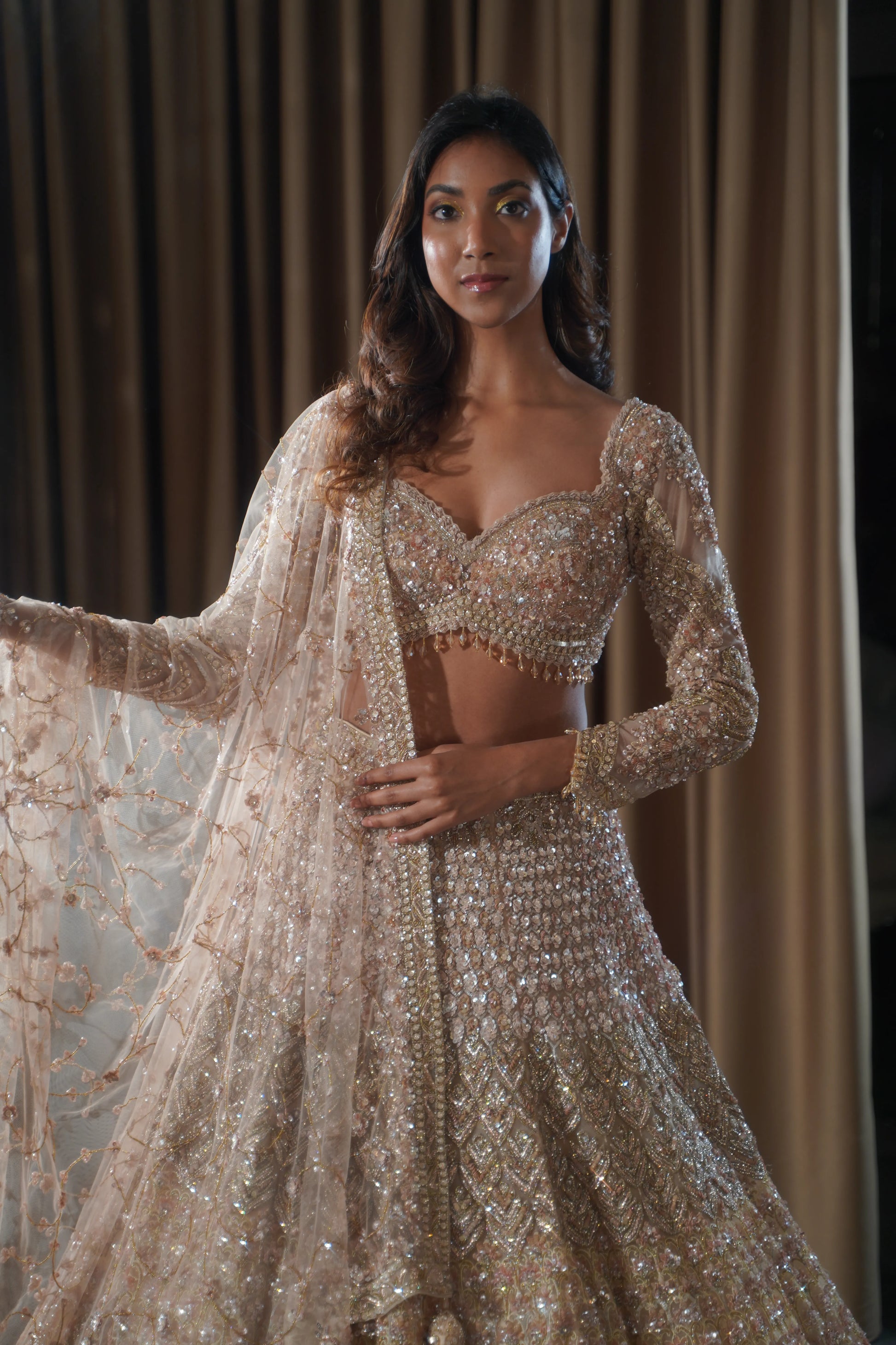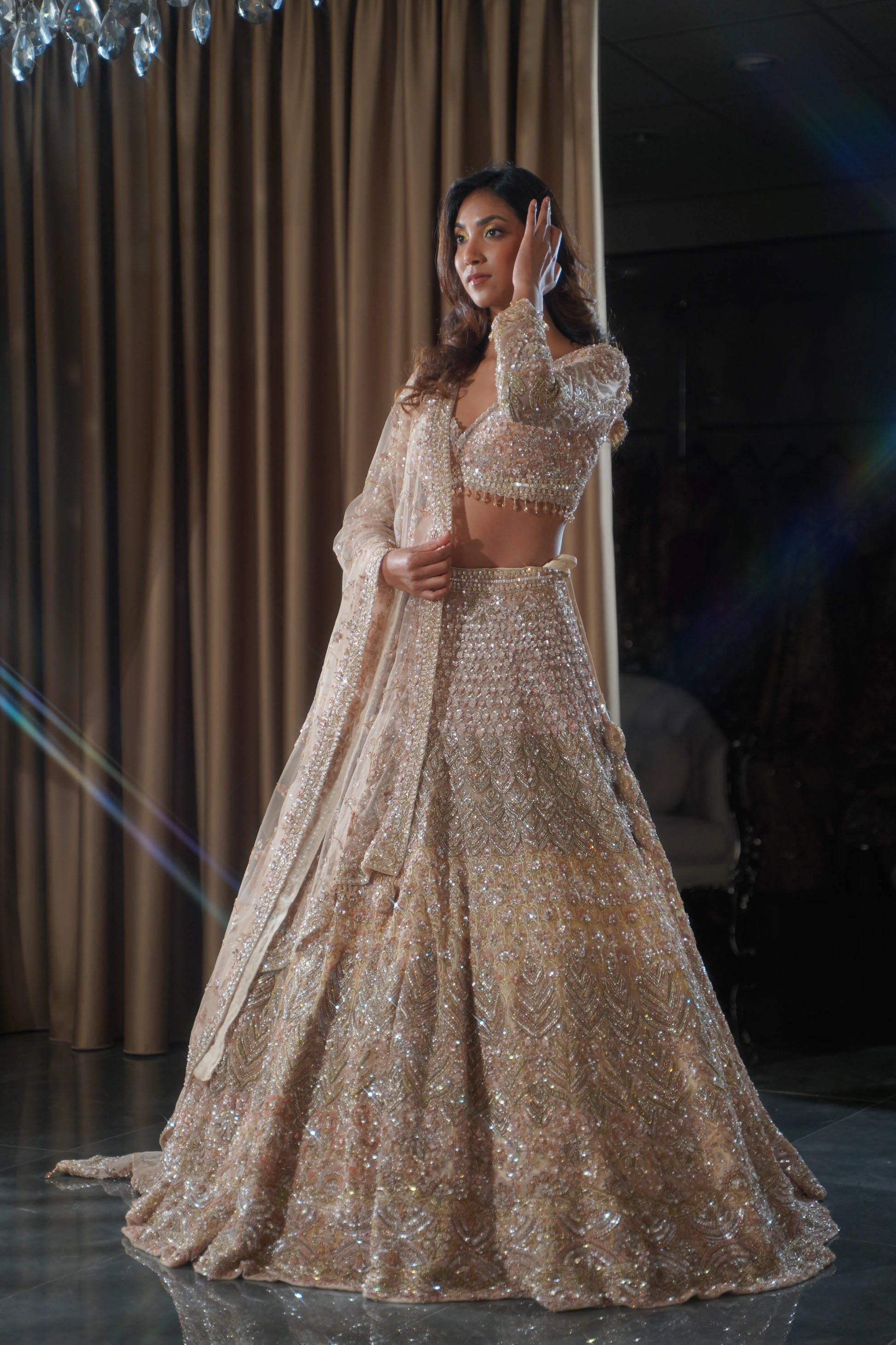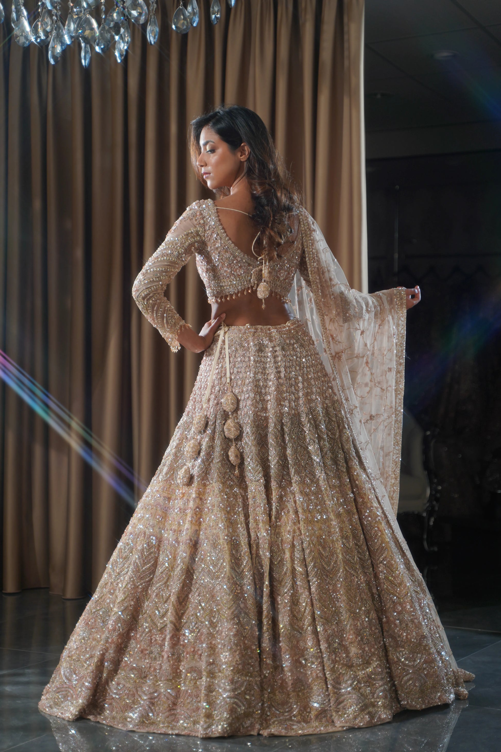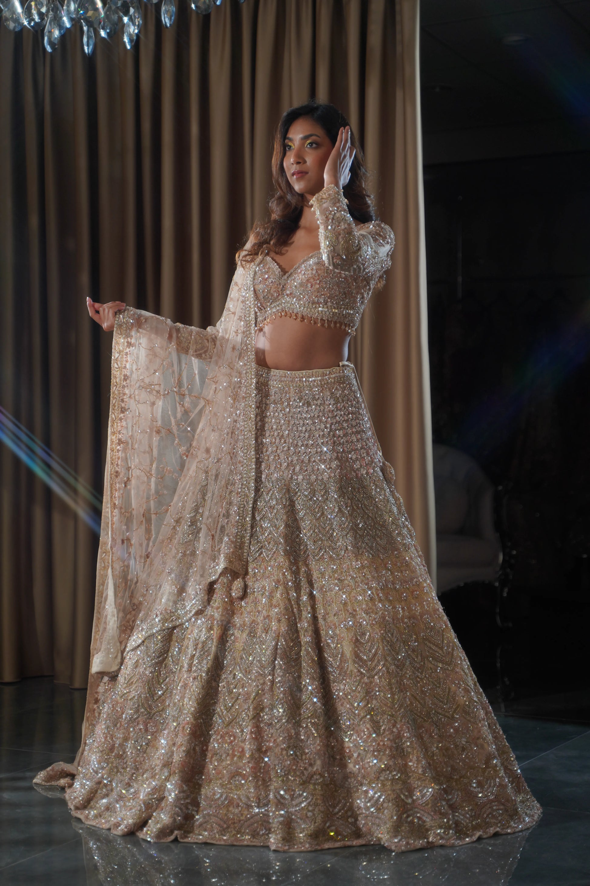 Step into a world of opulent tradition with this breathtaking Champagne Gold Bridal Lehenga. A masterpiece that radiates luxury and refinement, this ensemble features an all-over constellation of intricate embroidery that sparkles like captured starlight. The warm champagne-gold base serves as a luminous canvas for densely packed sequins, crystals, and metallic threadwork that creates a shimmering second-skin effect. Perfect for the bride who desires classic glamour with maximum impact, this outfit is an exceptional choice for a Wedding ceremony, Reception, or grand Sangeet celebration.