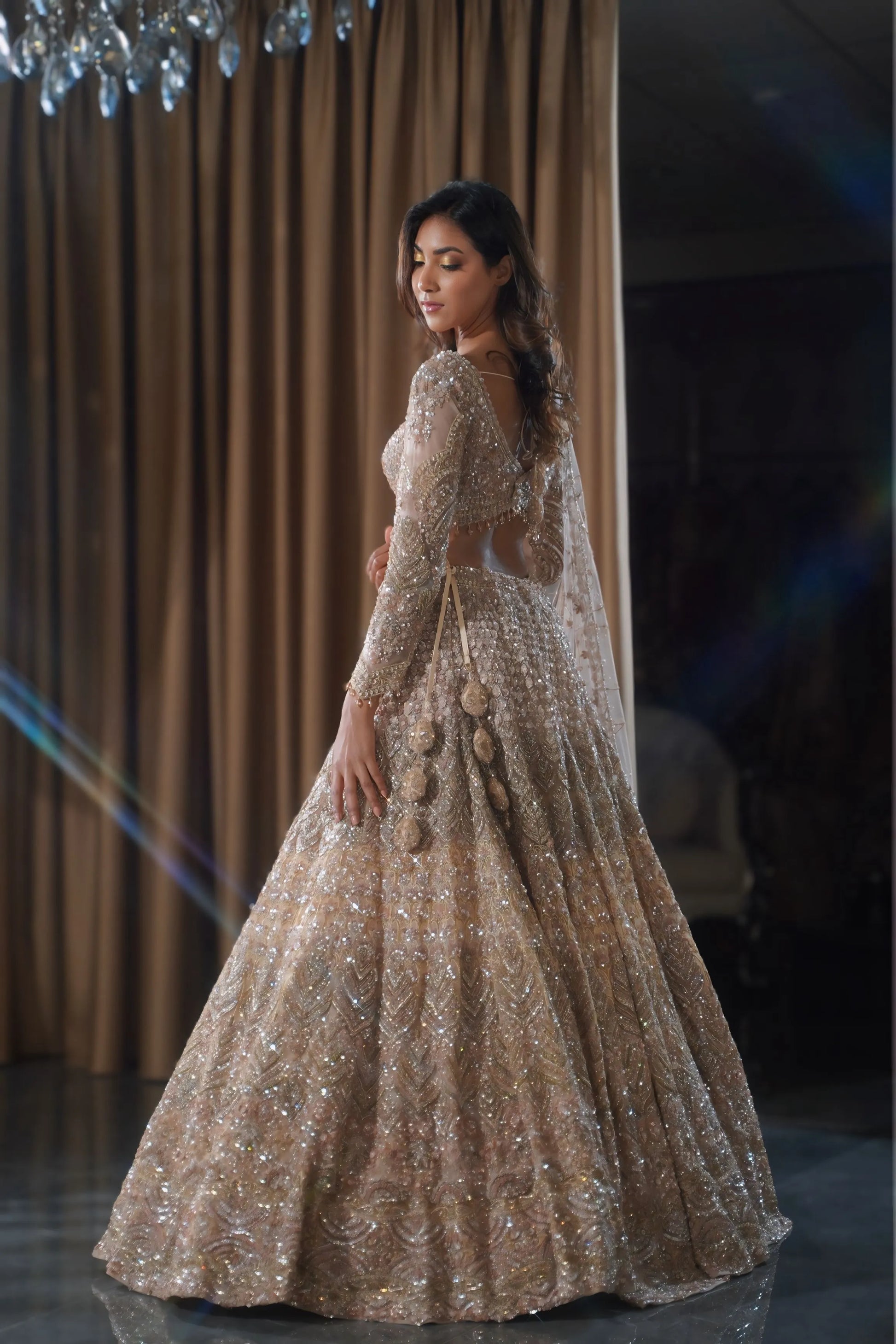 The fusion of the luminous champagne tone with the dense crystal work creates a look that is timelessly elegant, radiantly glamorous, and perfectly bridal.