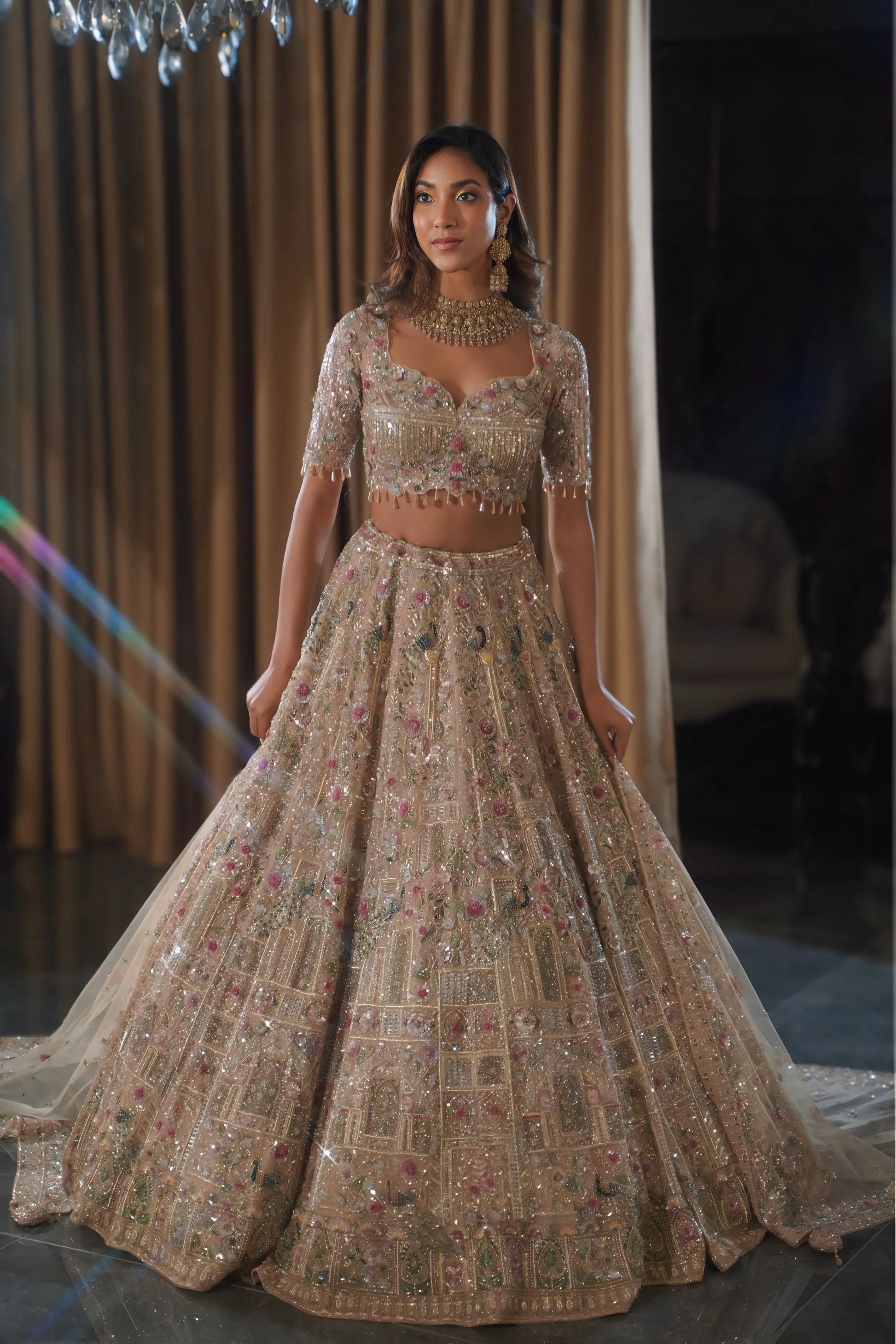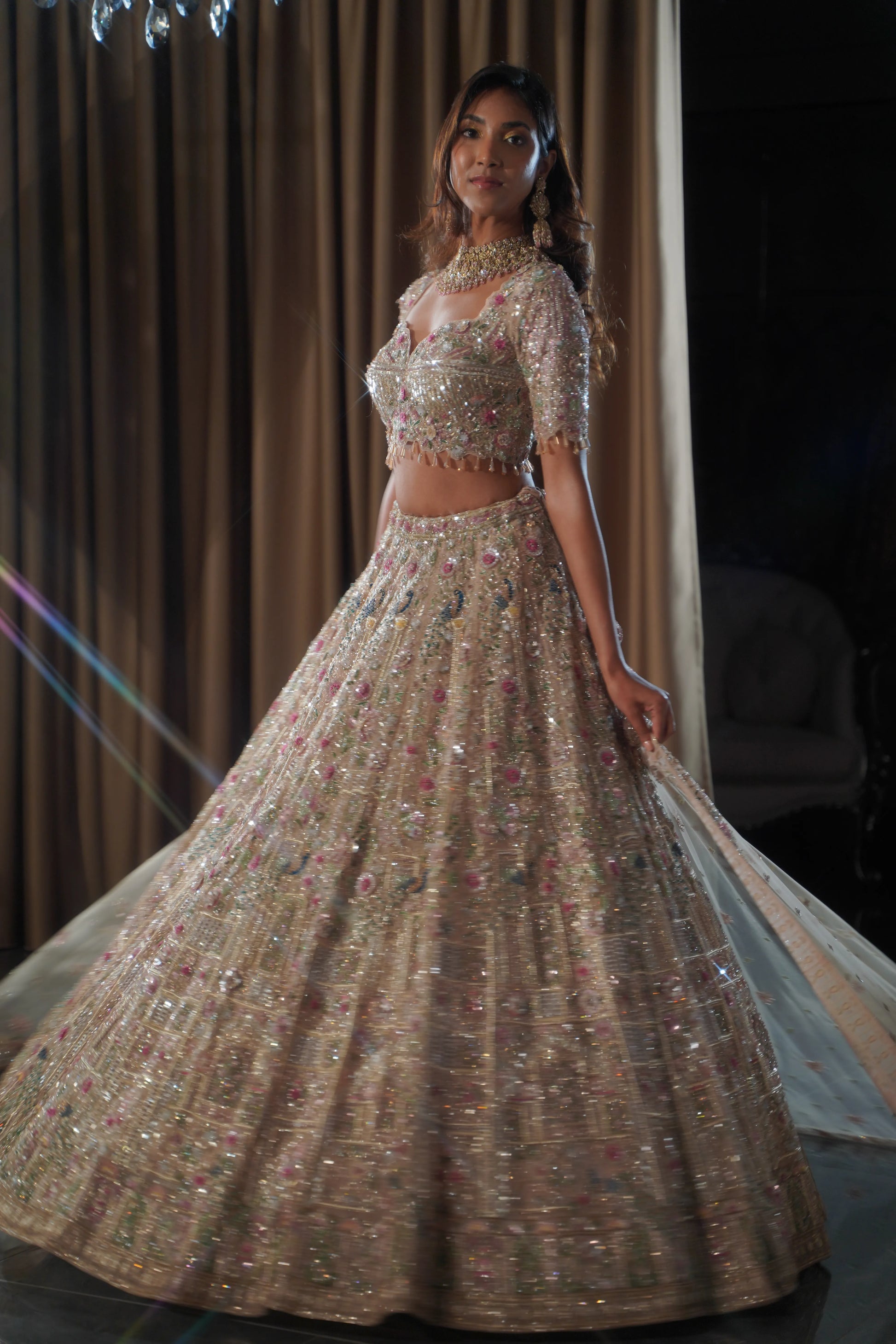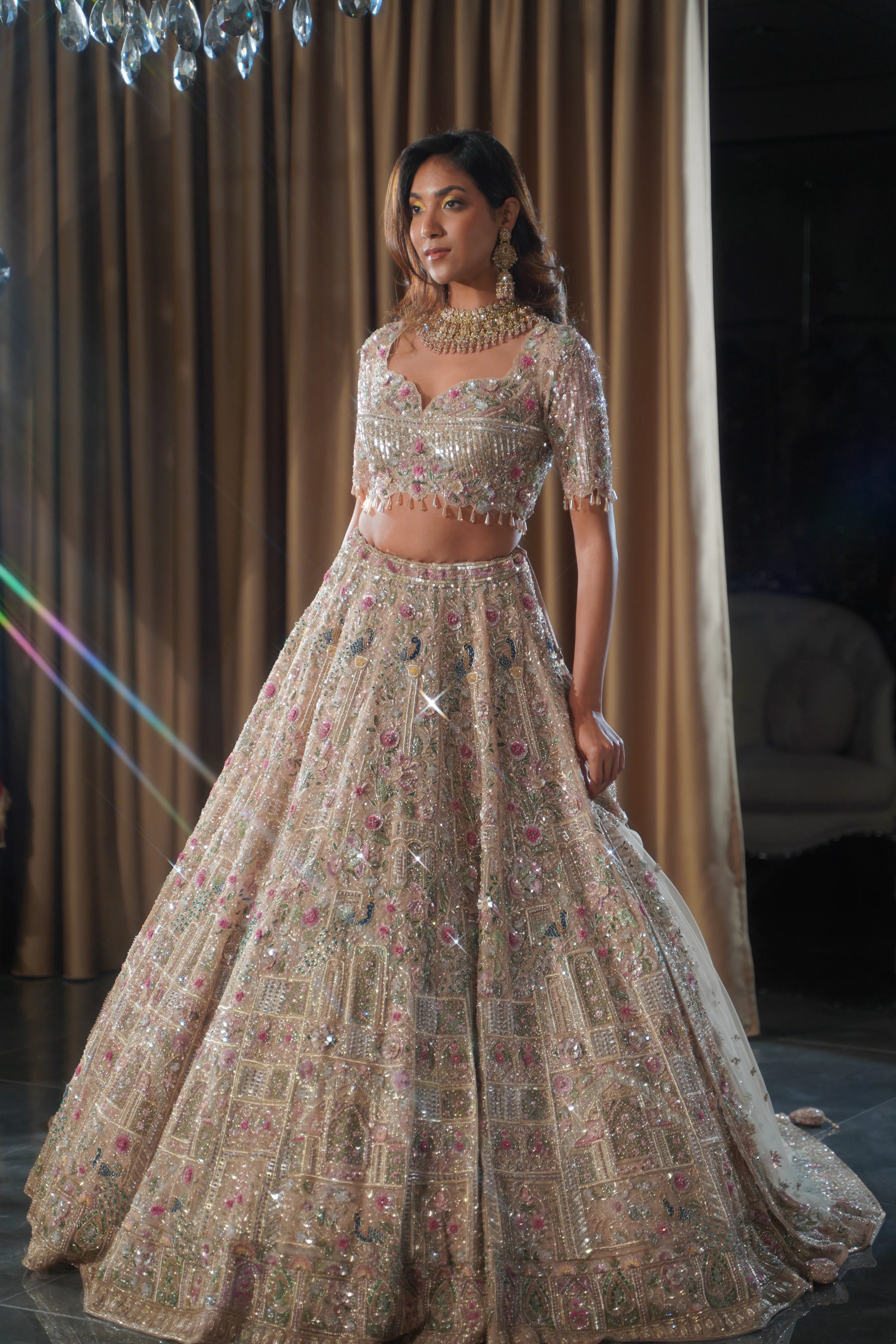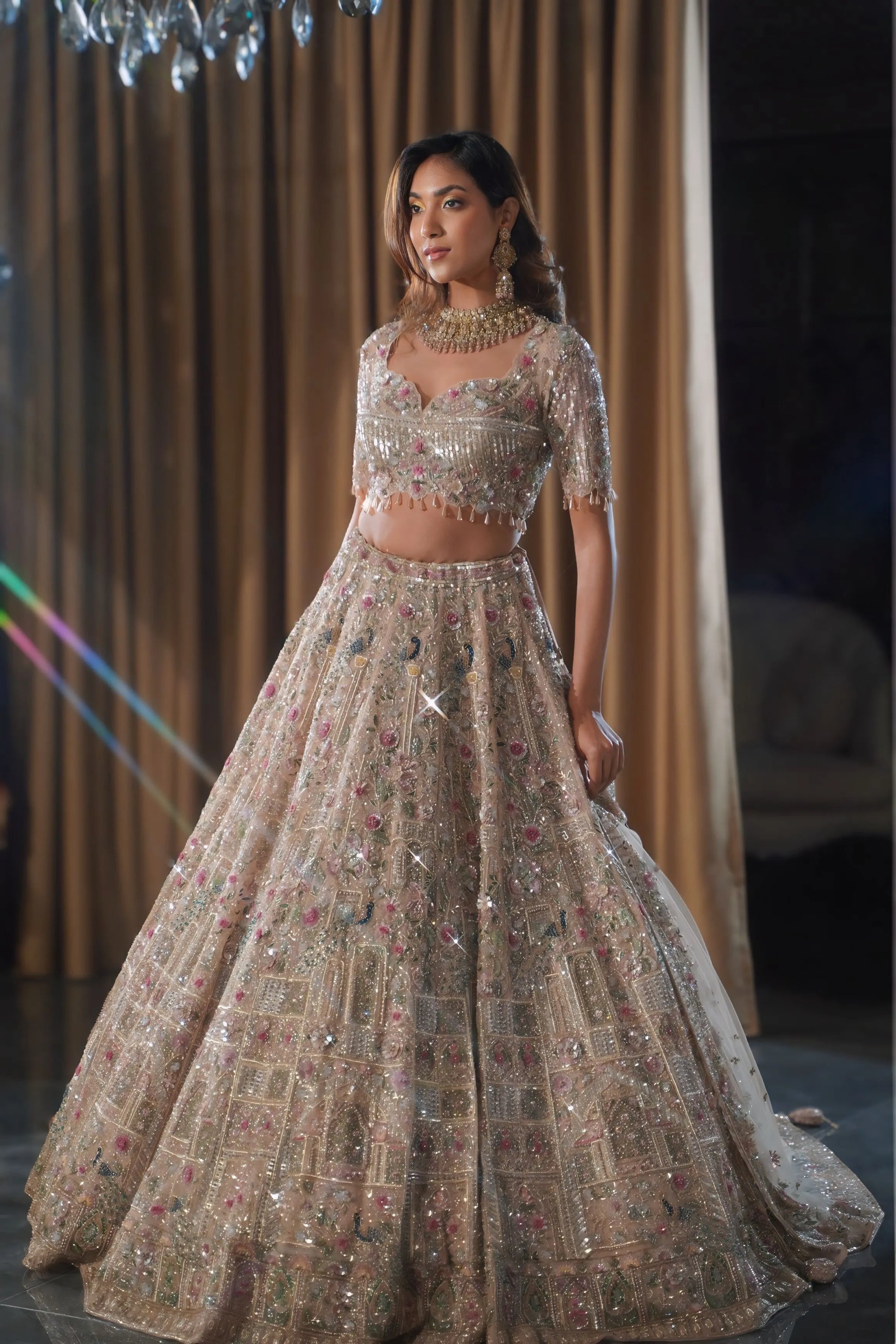 The Garden Romance: Champagne Blush Bridal Lehenga with Floral Fantasy