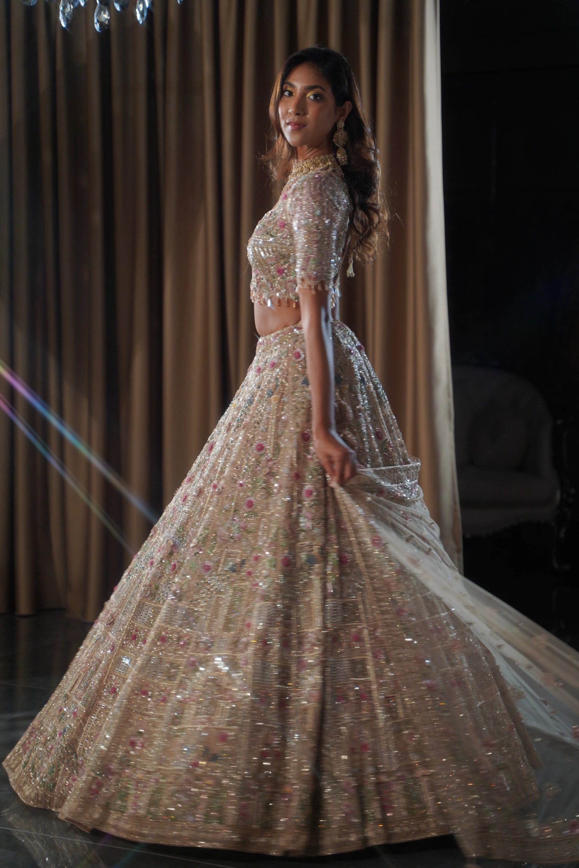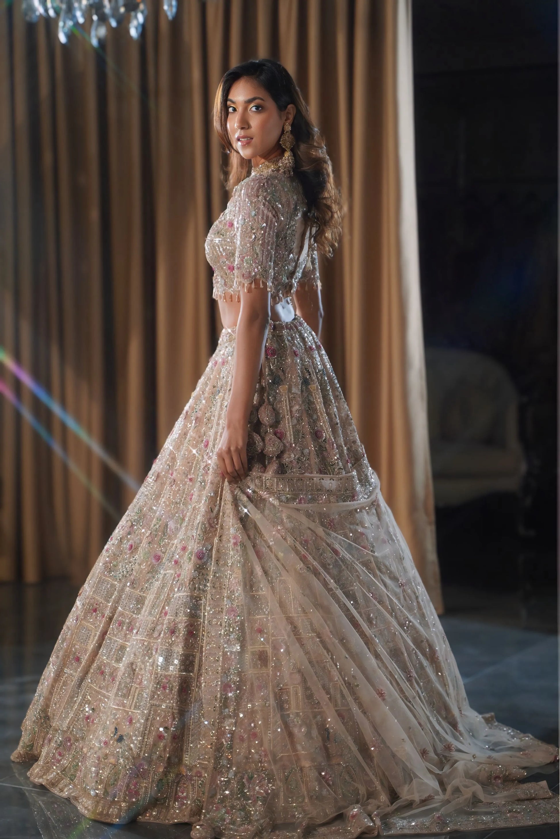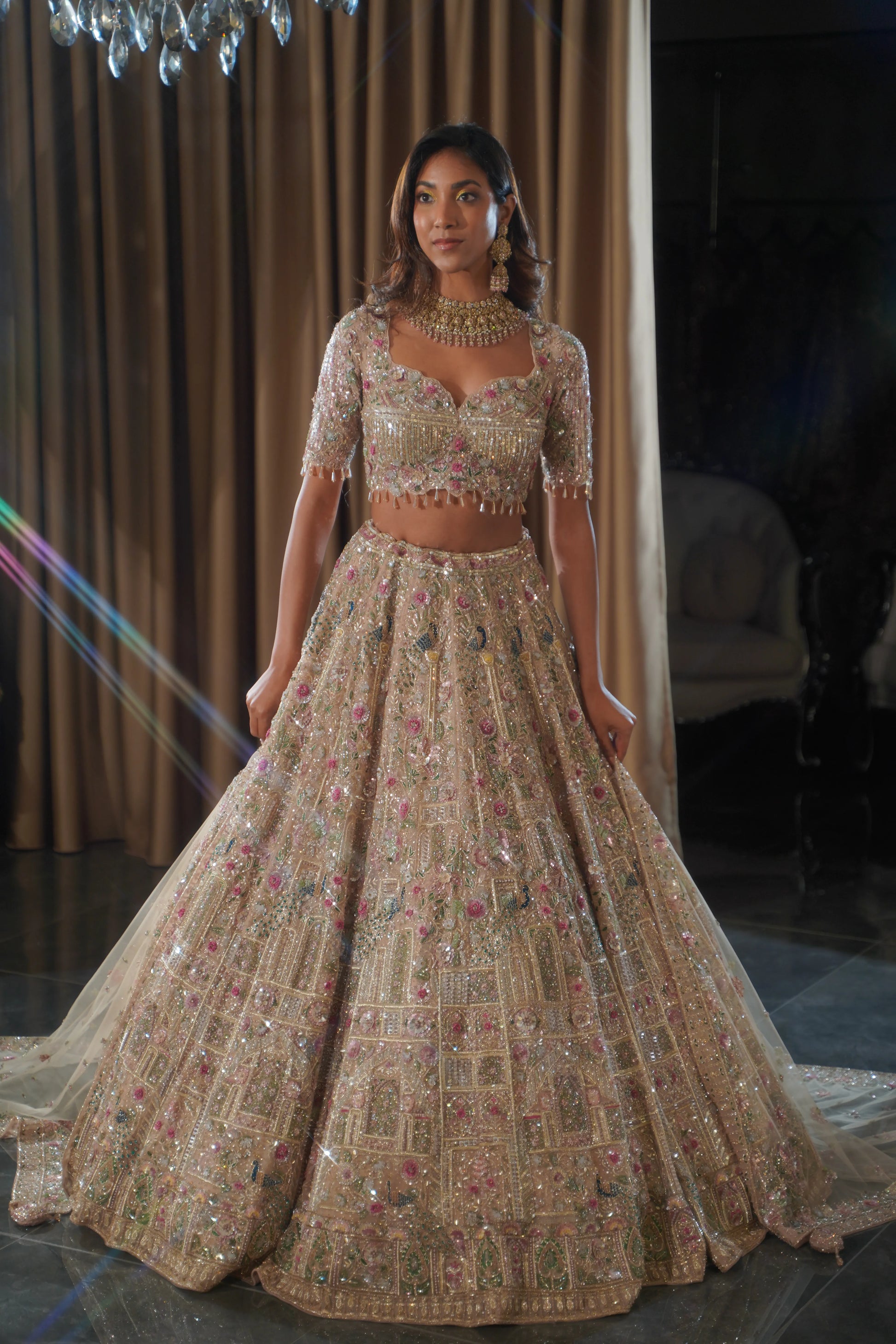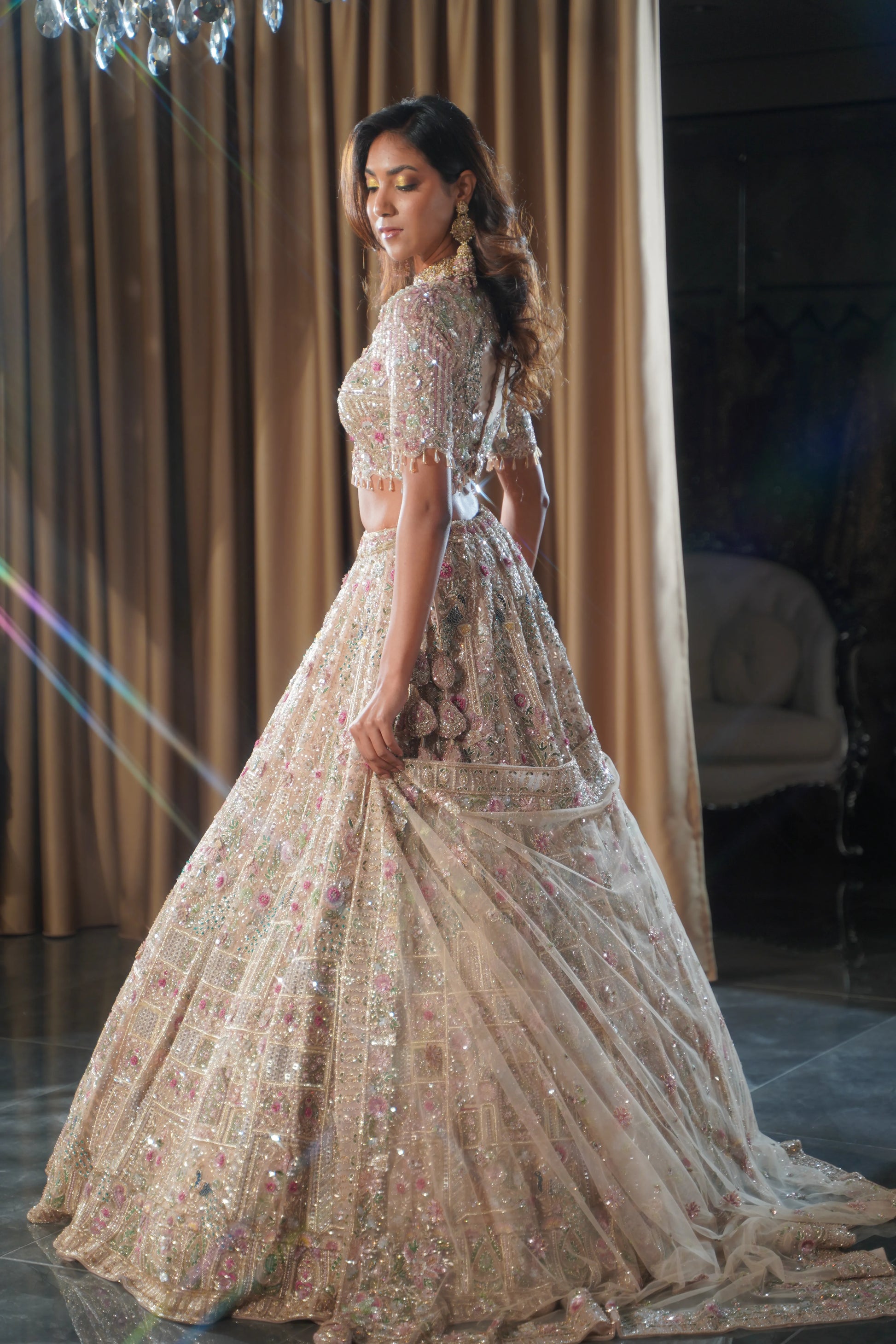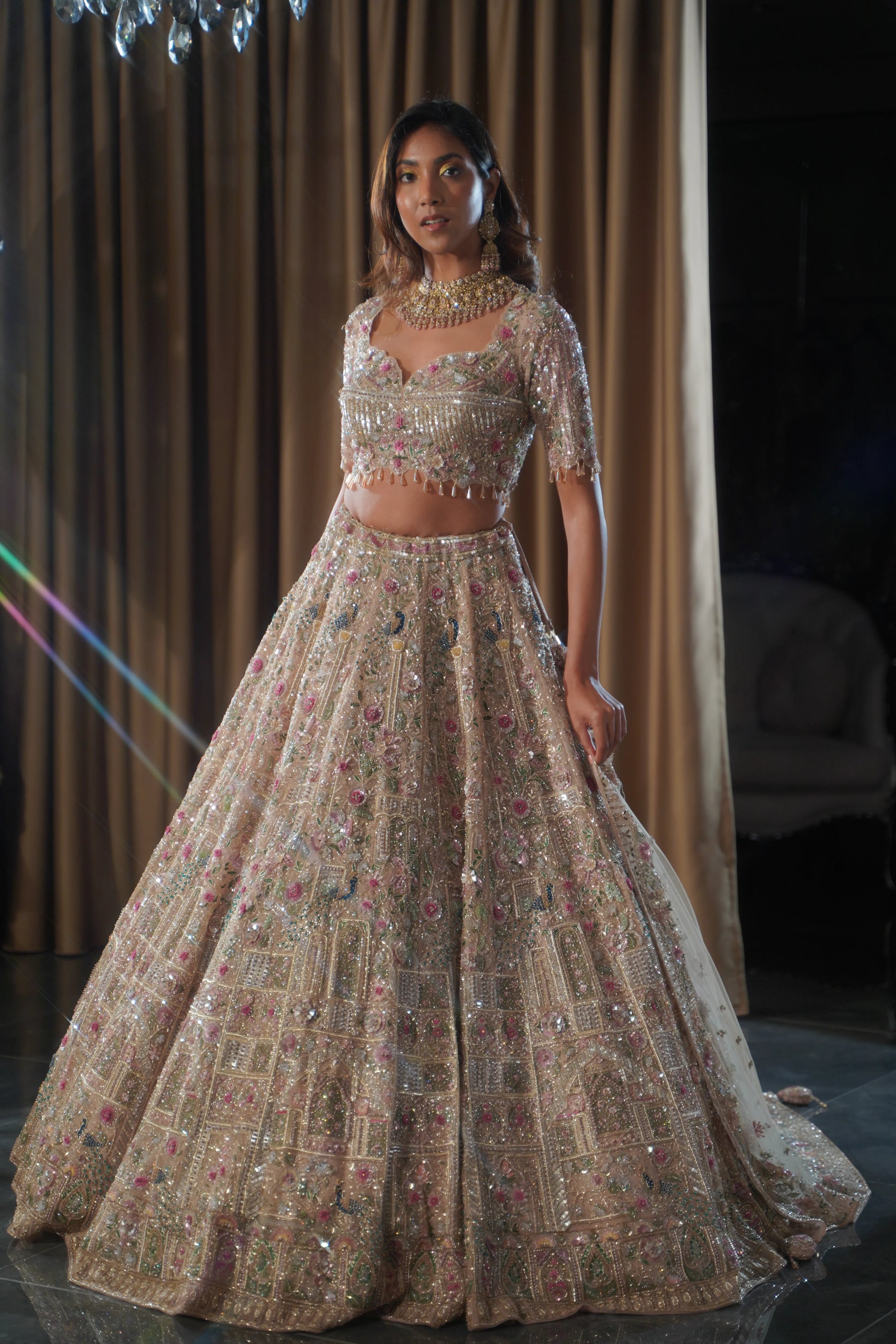 The Garden Romance: Champagne Blush Bridal Lehenga with Floral Fantasy