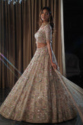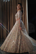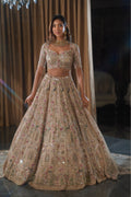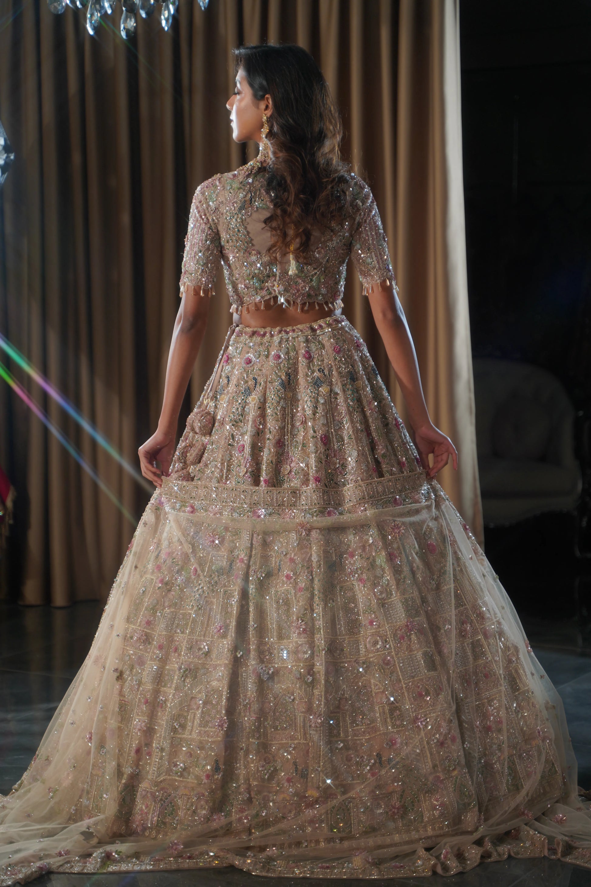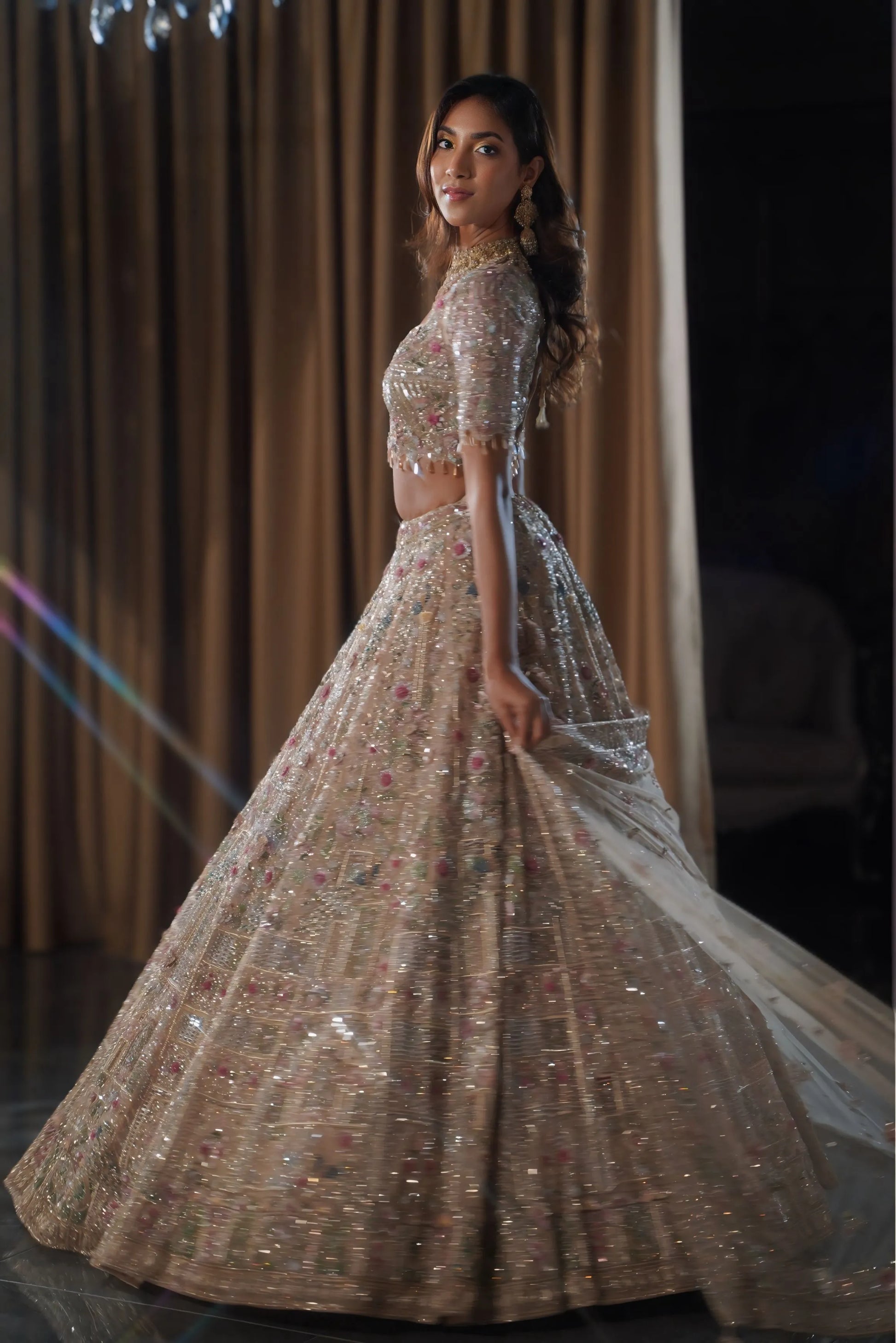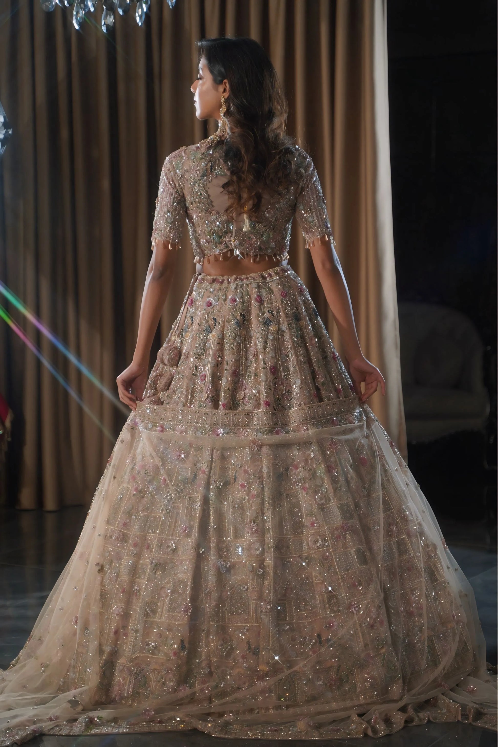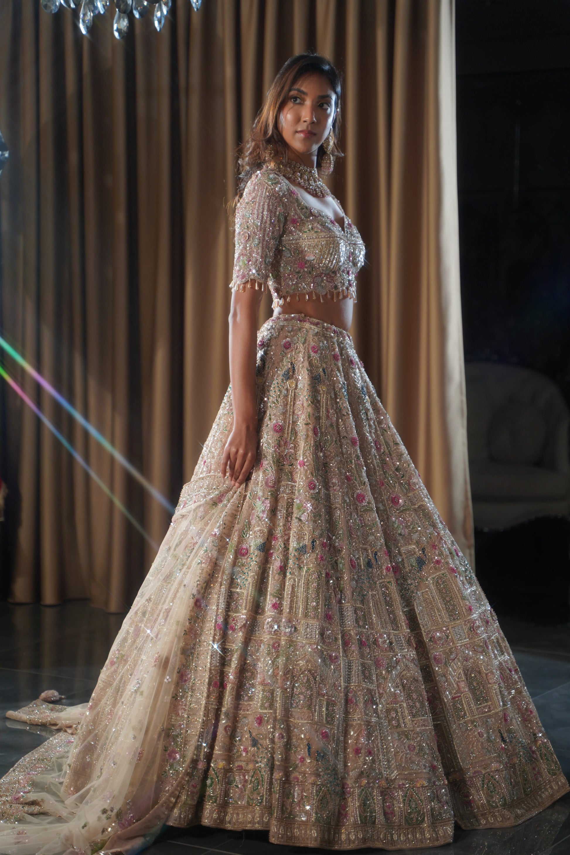 The Garden Romance: Champagne Blush Bridal Lehenga with Floral Fantasy