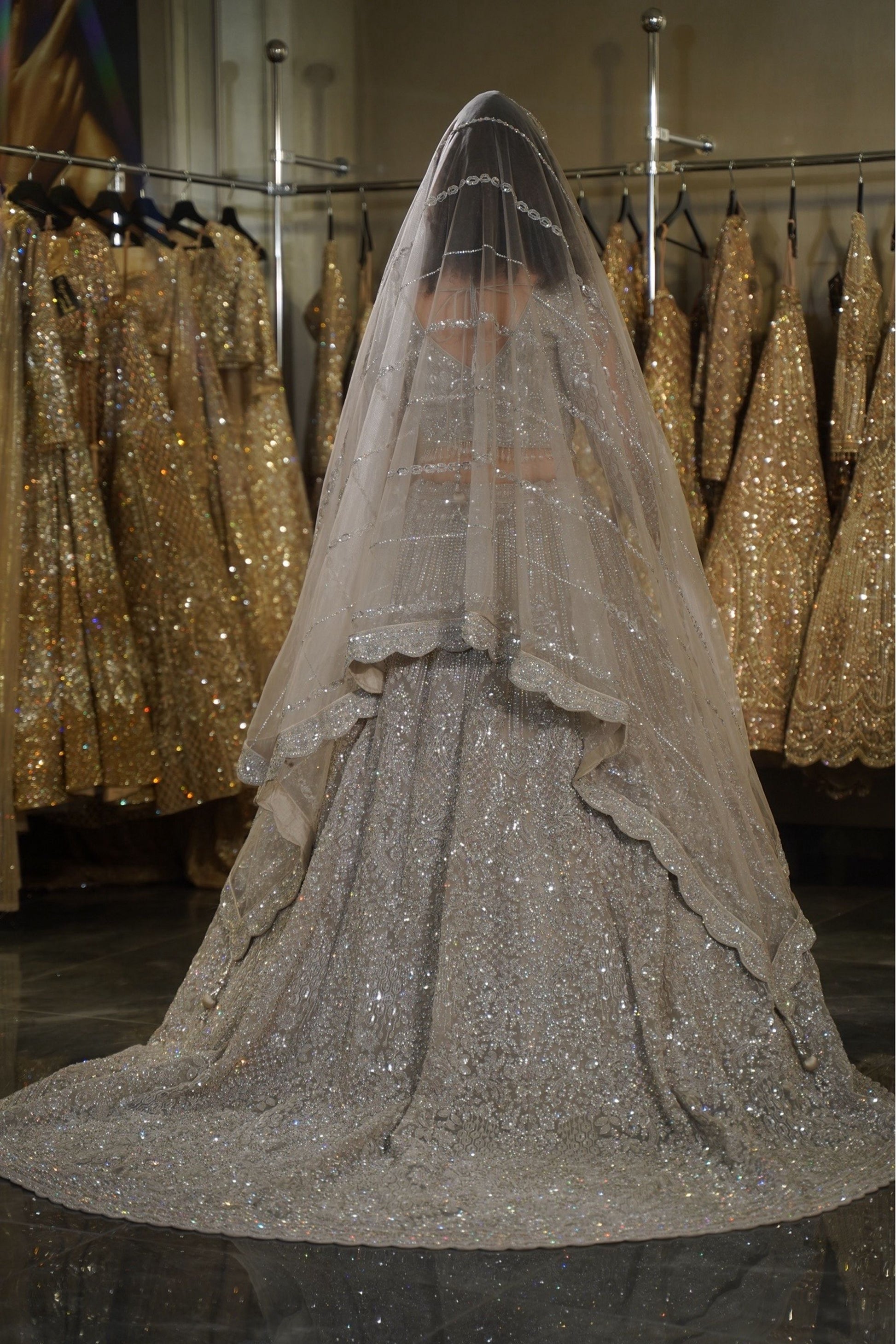 Shine with the intensity of a thousand stars in this breathtaking Platinum Silver Lehenga Set. This high-octane ensemble captures the essence of "liquid metal," featuring a monochromatic palette heavily encrusted with silver crystals and sequins. Designed for the ultra-modern bride who wants a look that is cool, futuristic, and undeniably luxurious, this outfit is the ultimate showstopper for a grand reception or a winter wonderland wedding.