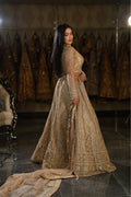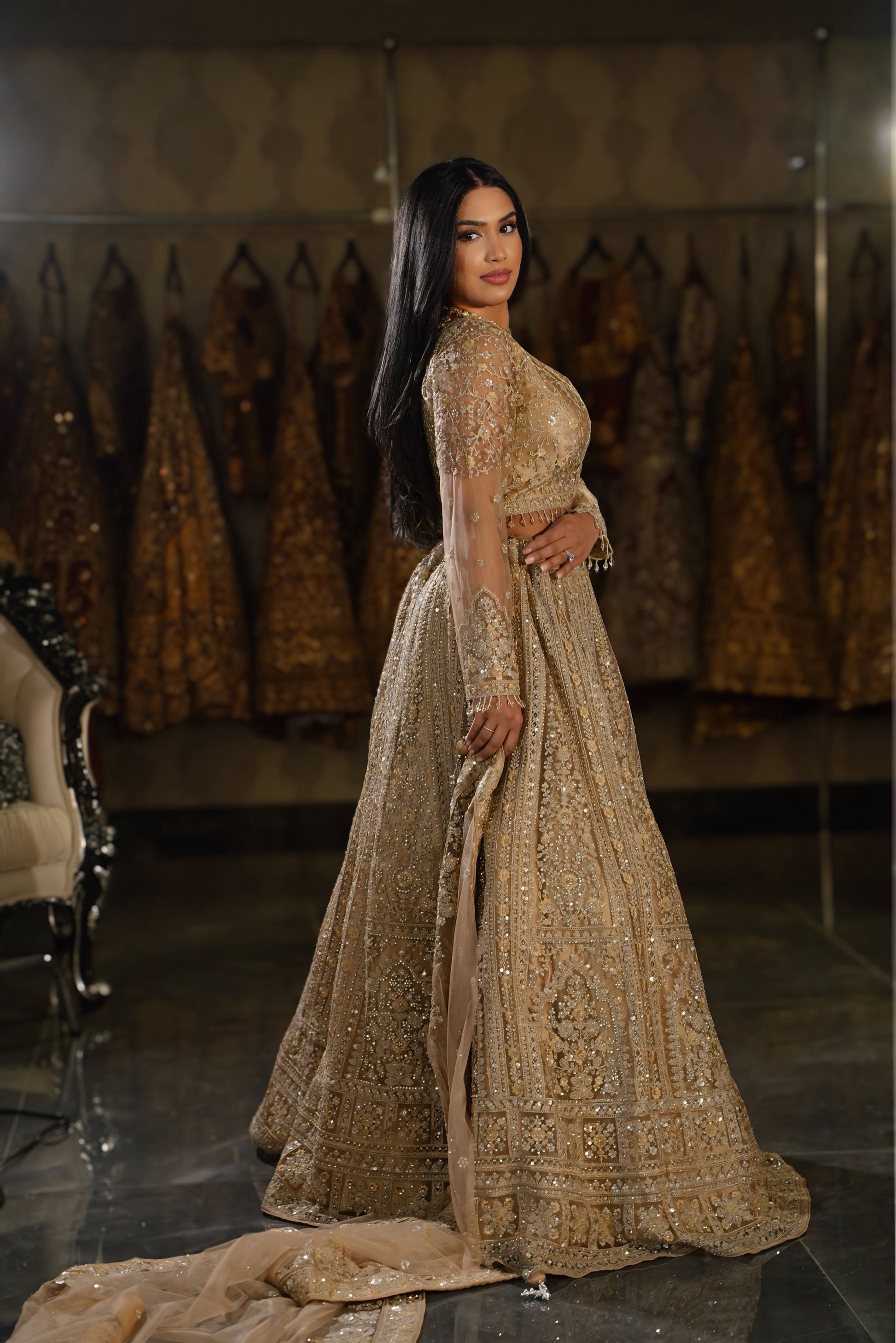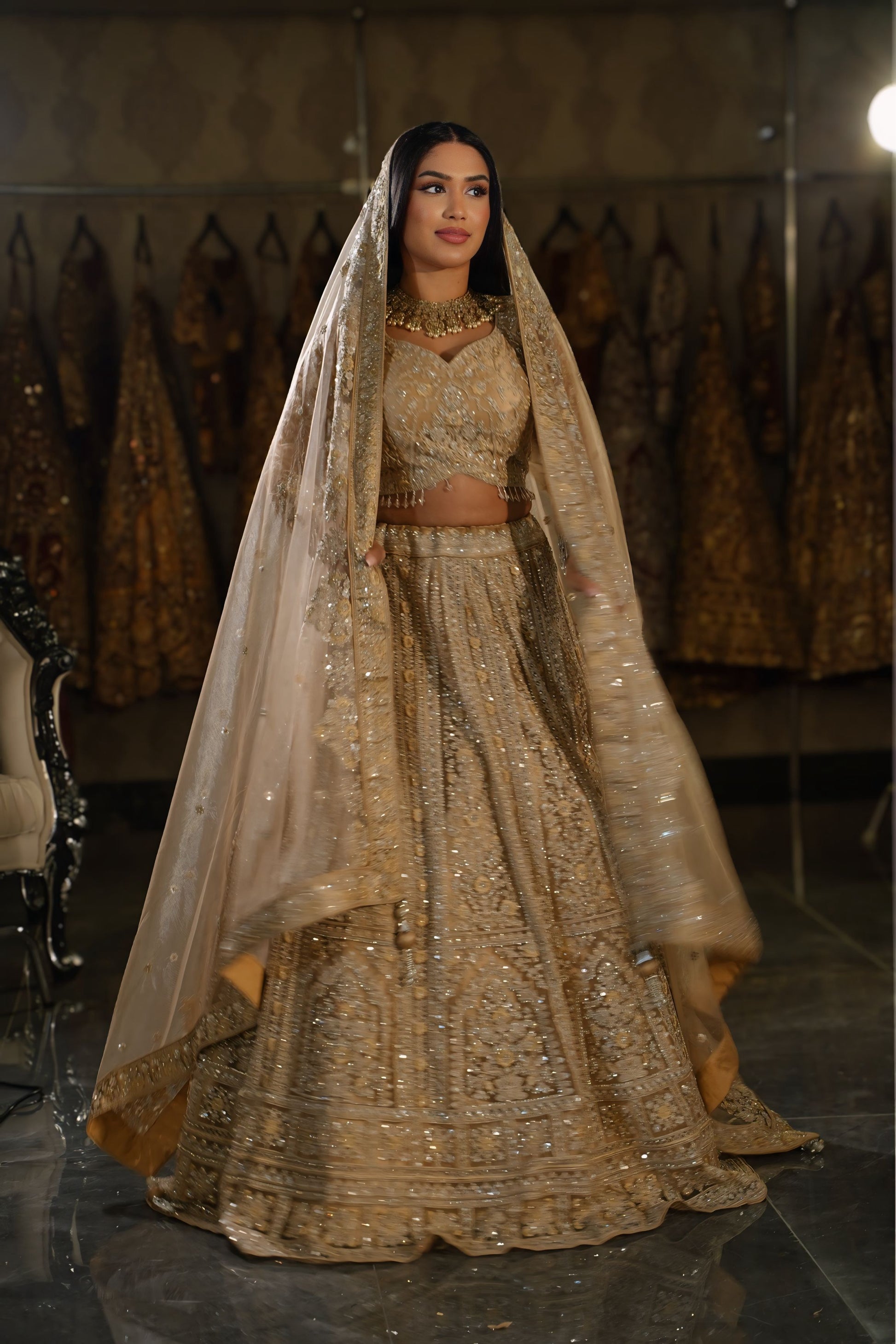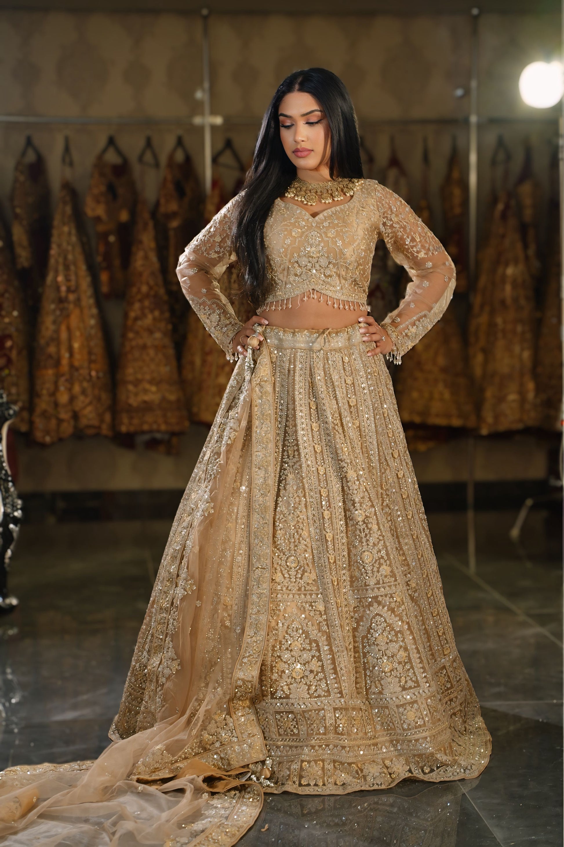 Radiate timeless sophistication with this exquisite Champagne Gold Bridal Lehenga Set. A masterclass in neutral elegance, this ensemble features a warm beige-gold palette brought to life with intricate vertical embroidery and sparkling crystal details. It is the perfect choice for the modern bride who seeks a look of refined opulence for her reception, engagement, or sangeet.