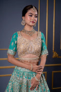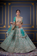 Immerse yourself in luxury with this captivating Seafoam Green and Beige Bridal Lehenga. A breathtaking departure from traditional bridal colors, this ensemble creates a serene yet opulent aesthetic reminiscent of ocean waves meeting golden sands. Perfect for the modern bride who seeks a unique, refreshing palette for her reception or engagement, this outfit balances soft ombre tones with heavy, regal embroidery.