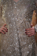 Exude sophistication with this exquisite Dusty Taupe Sharara Set. A vision of refined glamour, this ensemble features a graceful knee-length straight kurta paired with voluminous wide-legged sharara pants. The unique mushroom-beige hue serves as a chic, neutral canvas for heavy silver sequin and crystal embroidery, creating a look that is both modern and dignified. Perfect for a grand Reception, Engagement, or a sophisticated Sangeet where you want to shine with elegant subtlety.