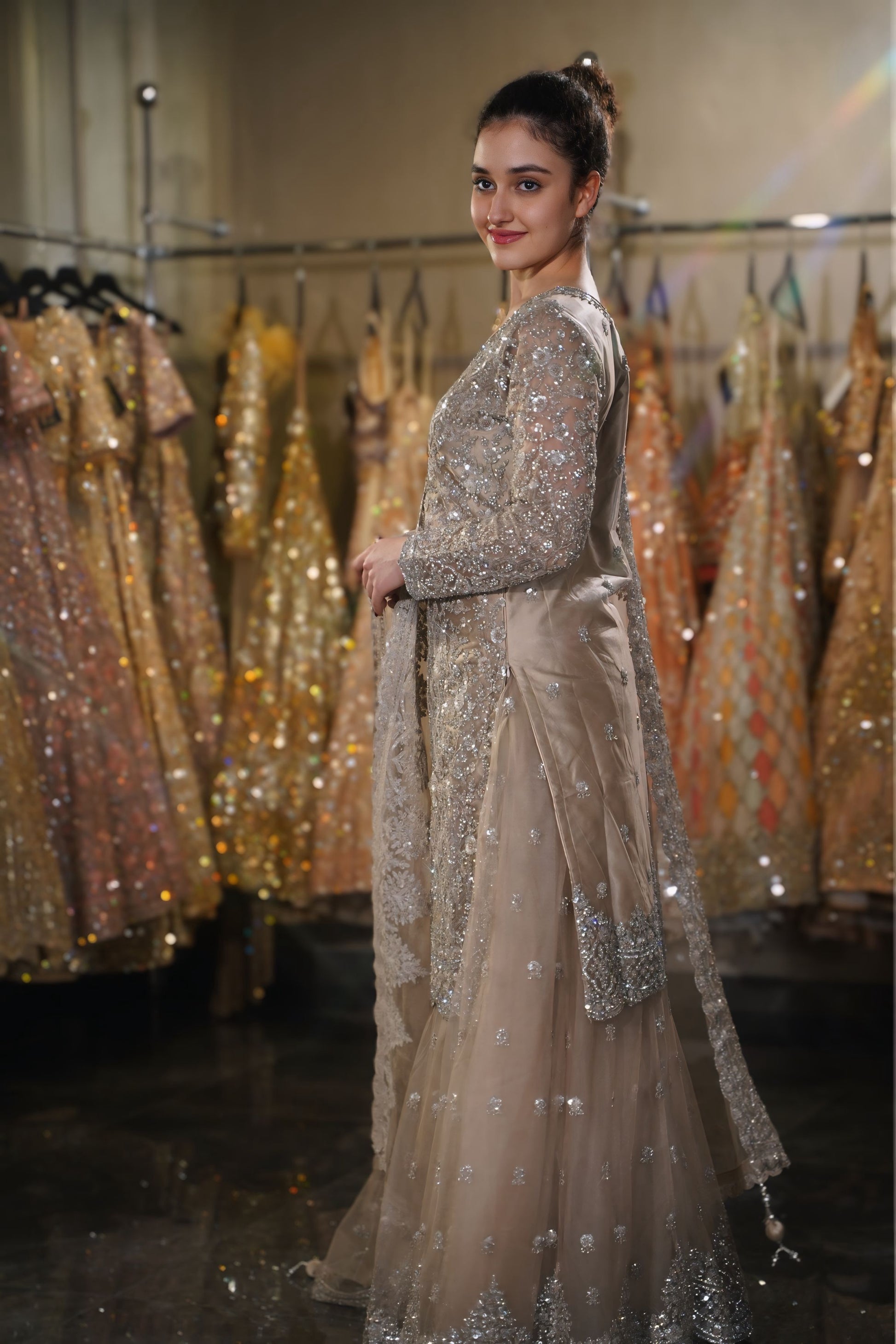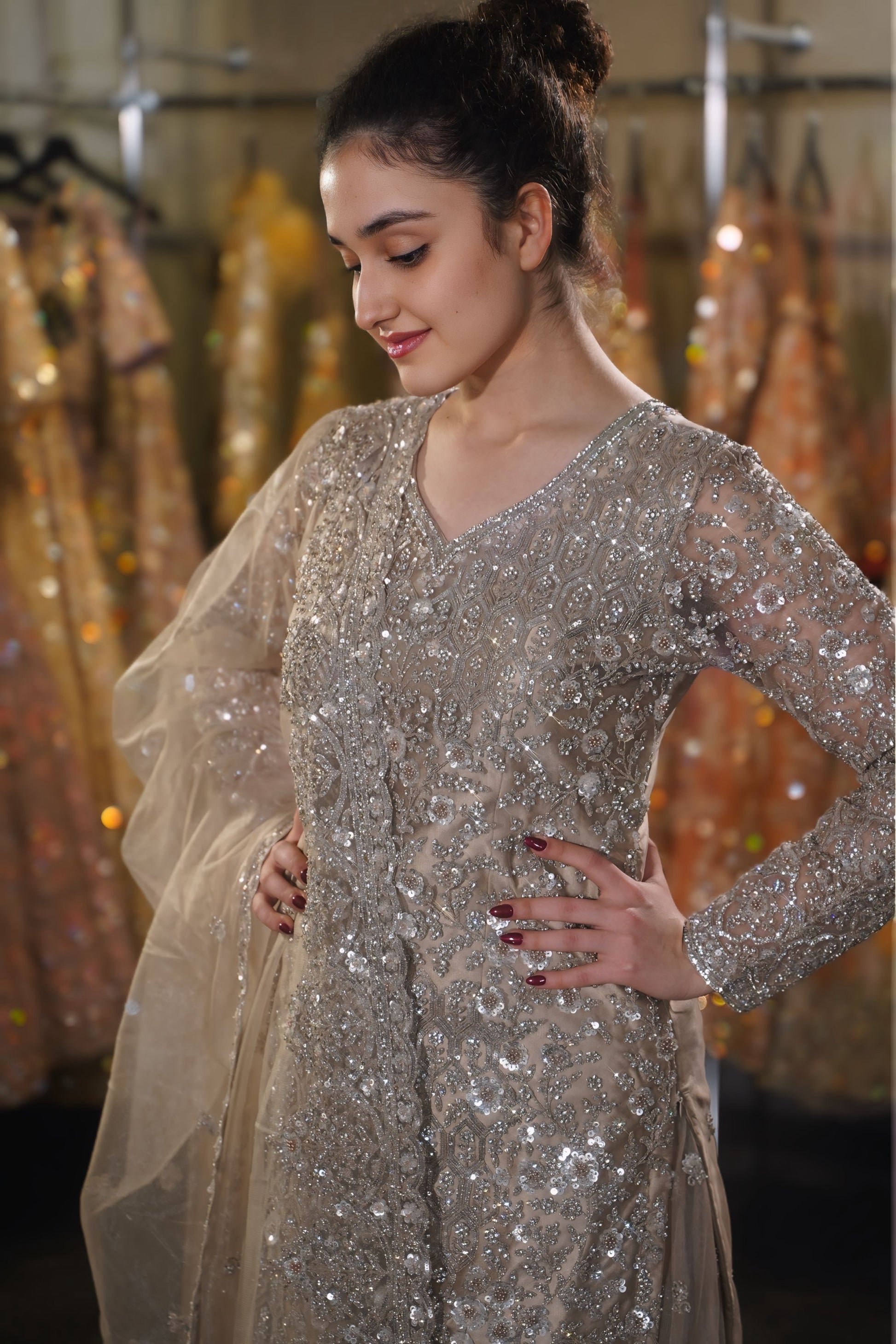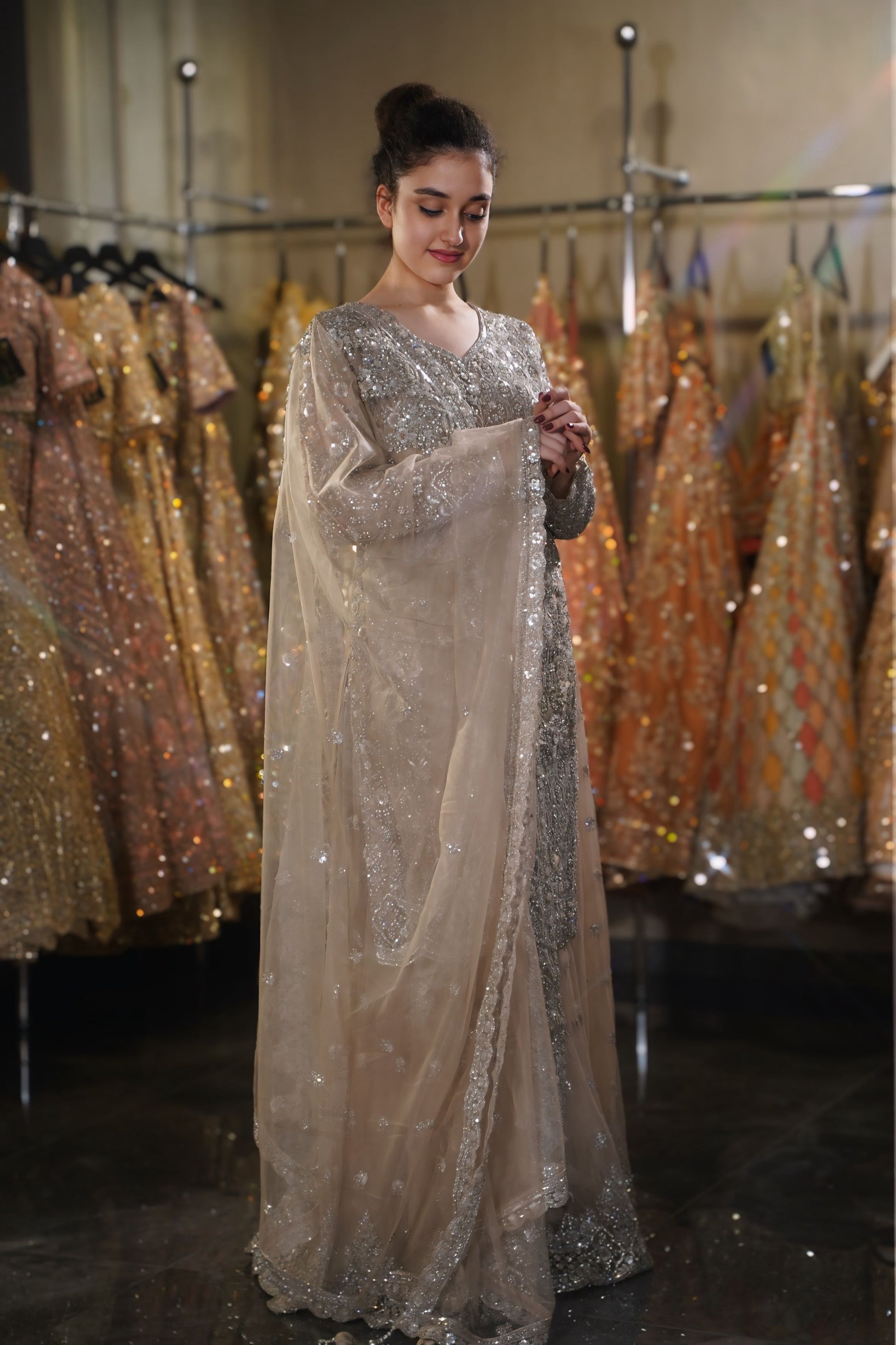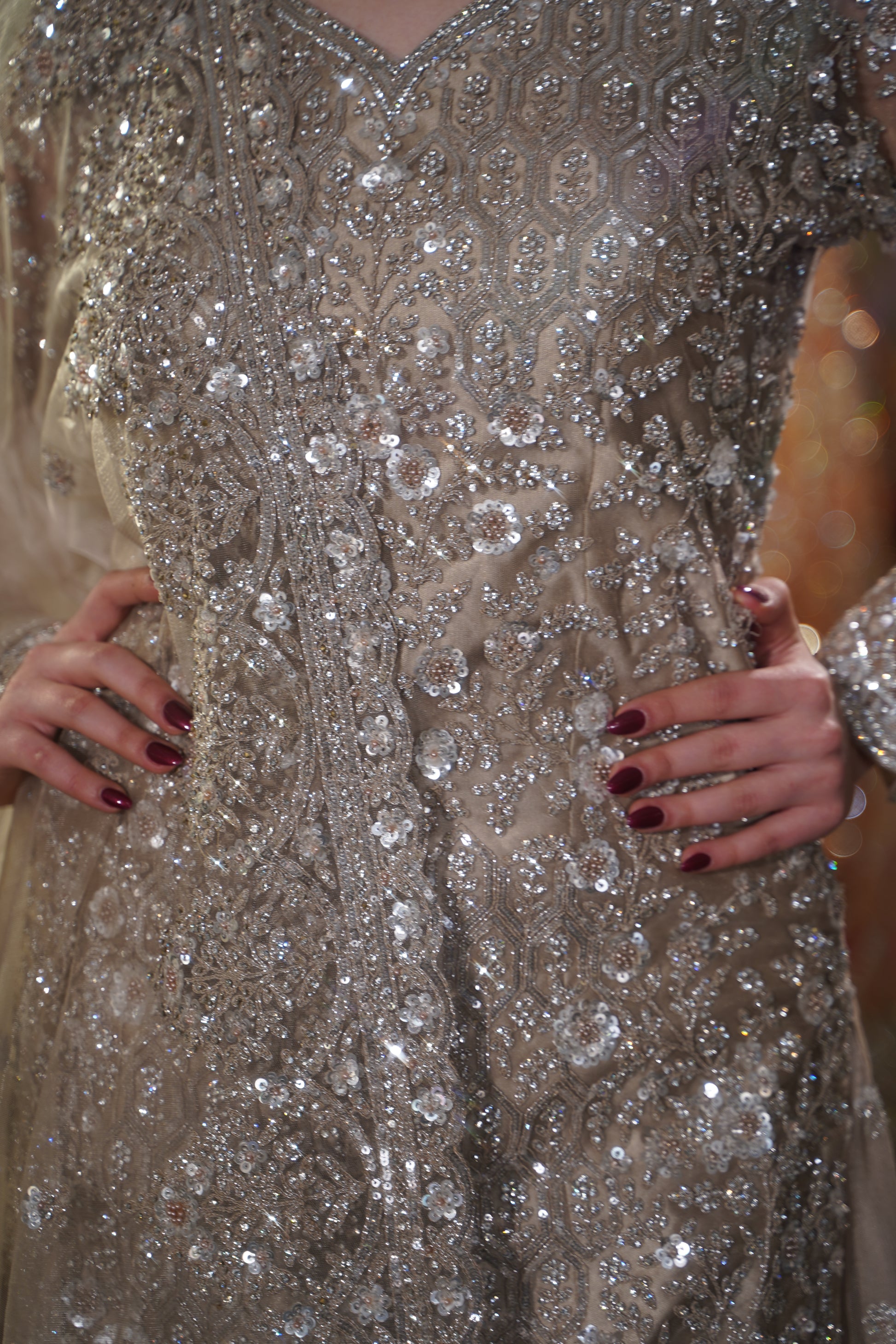 Work: Silver Sequins, Zari, Crystals, and Heavy Border Work