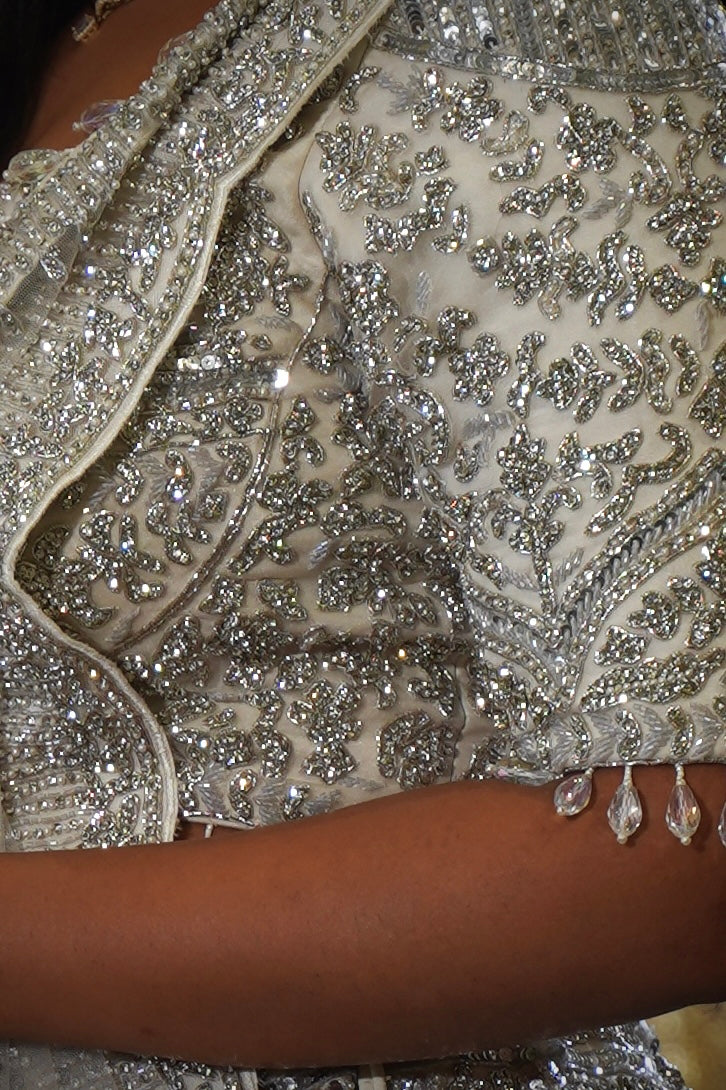 | Blouse (Choli) | Elbow-length sleeved ivory choli with heavy silver sequin work and crystal bead fringe detailing at cuffs |