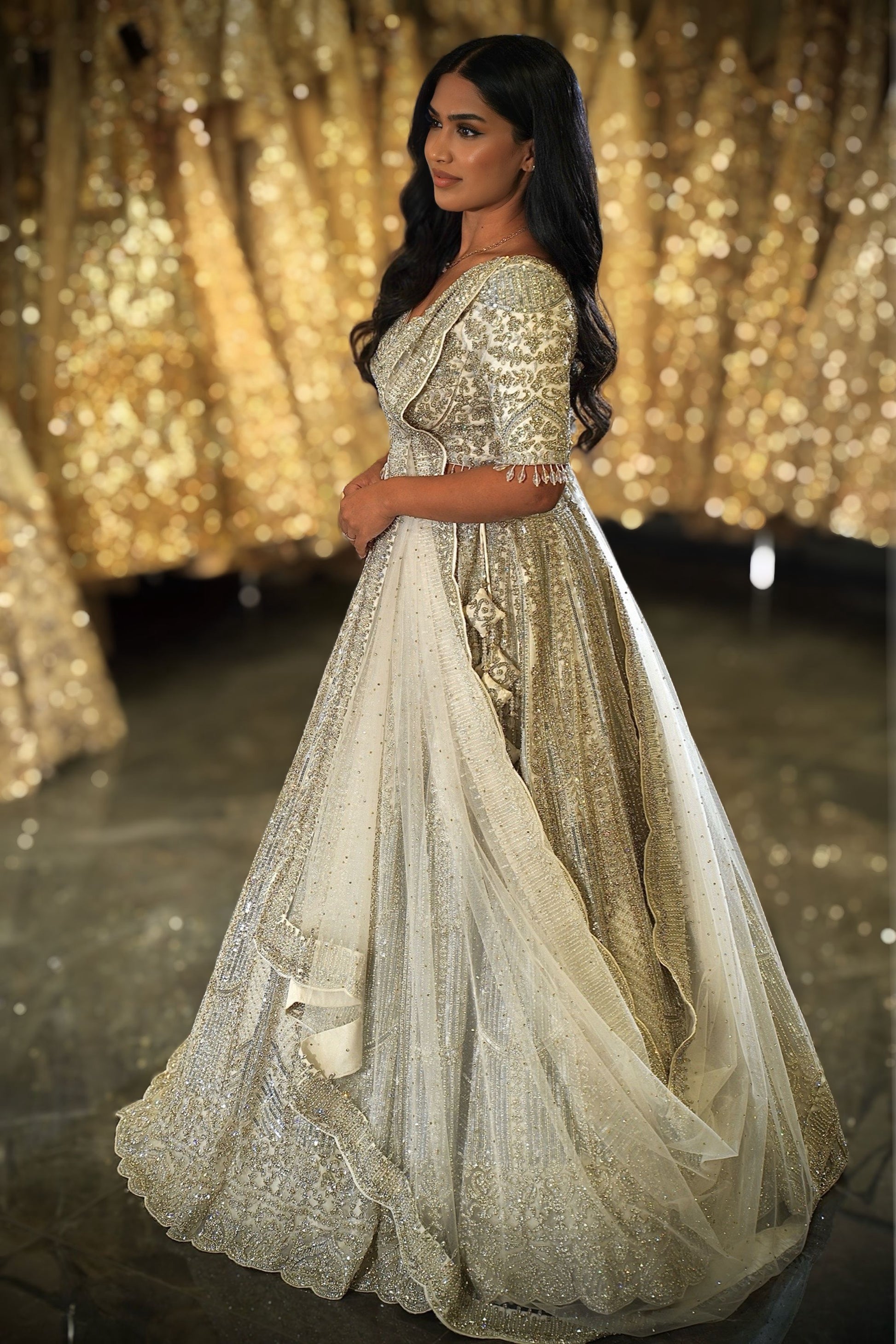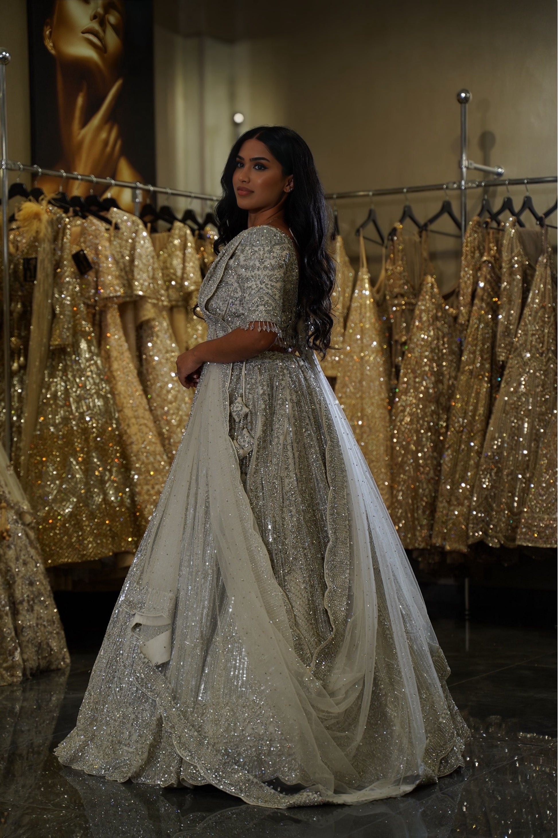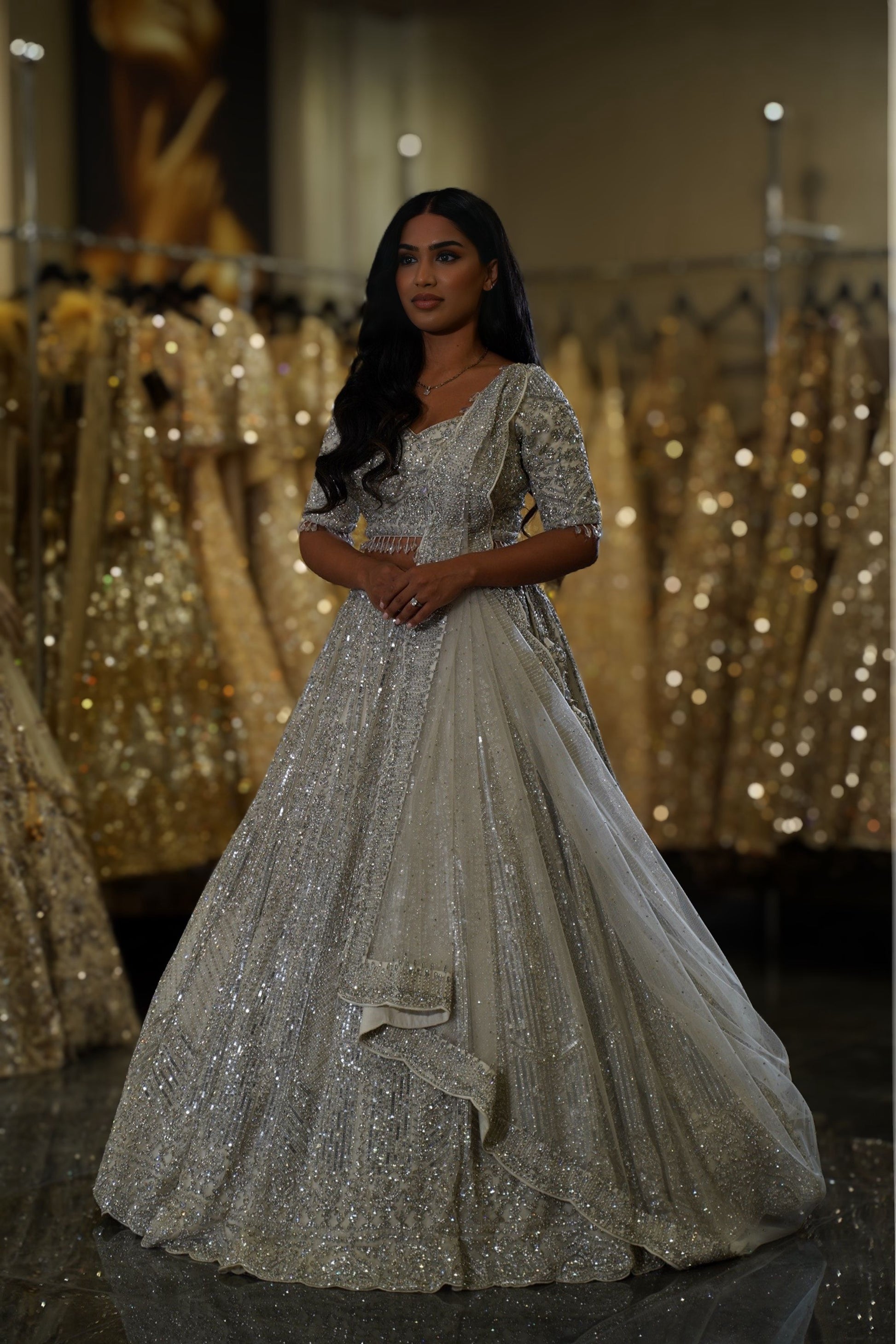 Radiate pure brilliance with this exquisite Pristine Silver and Ivory Bridal Lehenga. A vision of ethereal glamour, this ensemble is designed for the bride who wants to glow with a celestial light. The snowy ivory base is completely submerged in a waterfall of silver sequins and crystals, creating a look that is both futuristic and timelessly elegant. Perfect for a grand Reception, Engagement, or a Christian wedding, this outfit offers high-voltage glamour with a sophisticated edge.