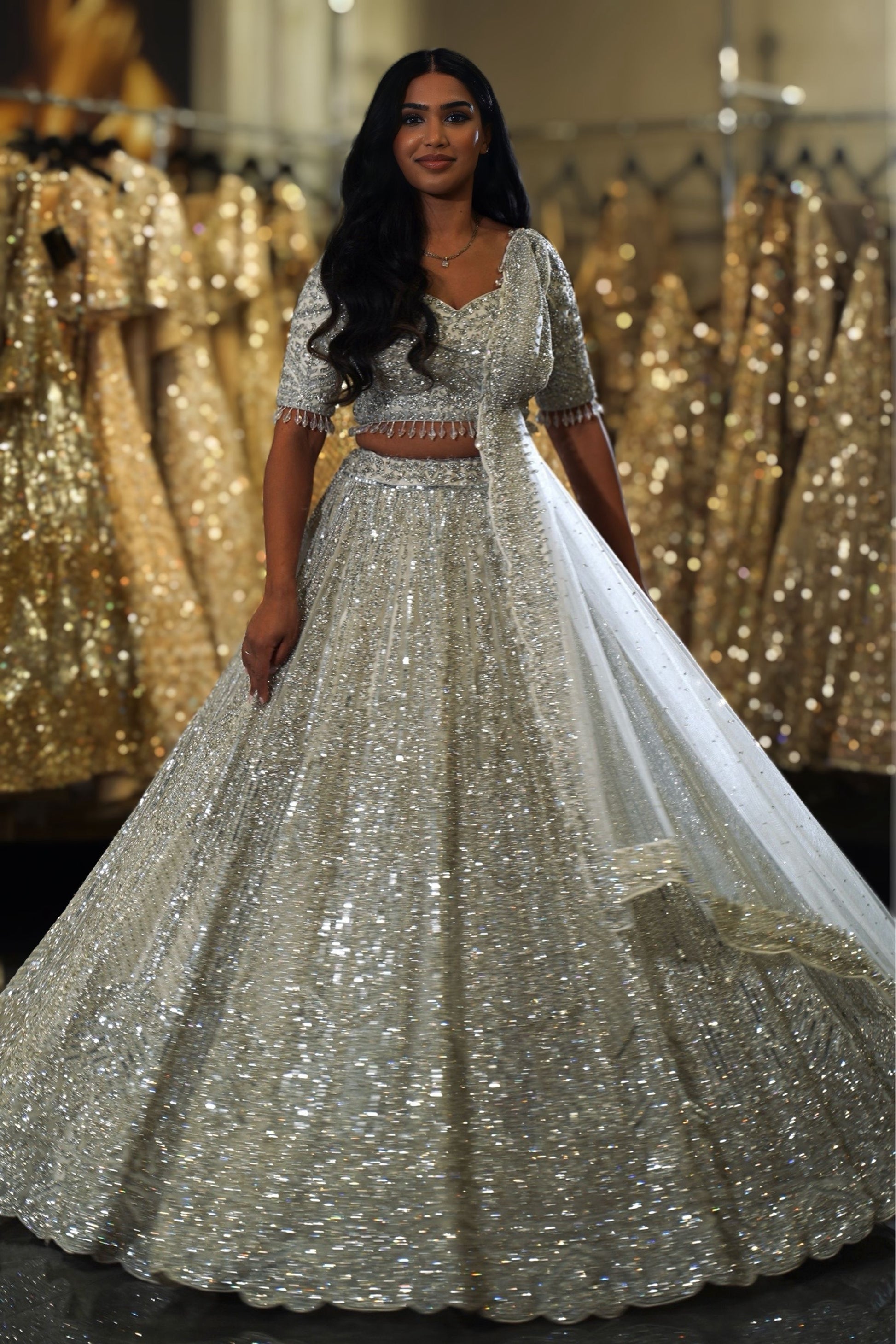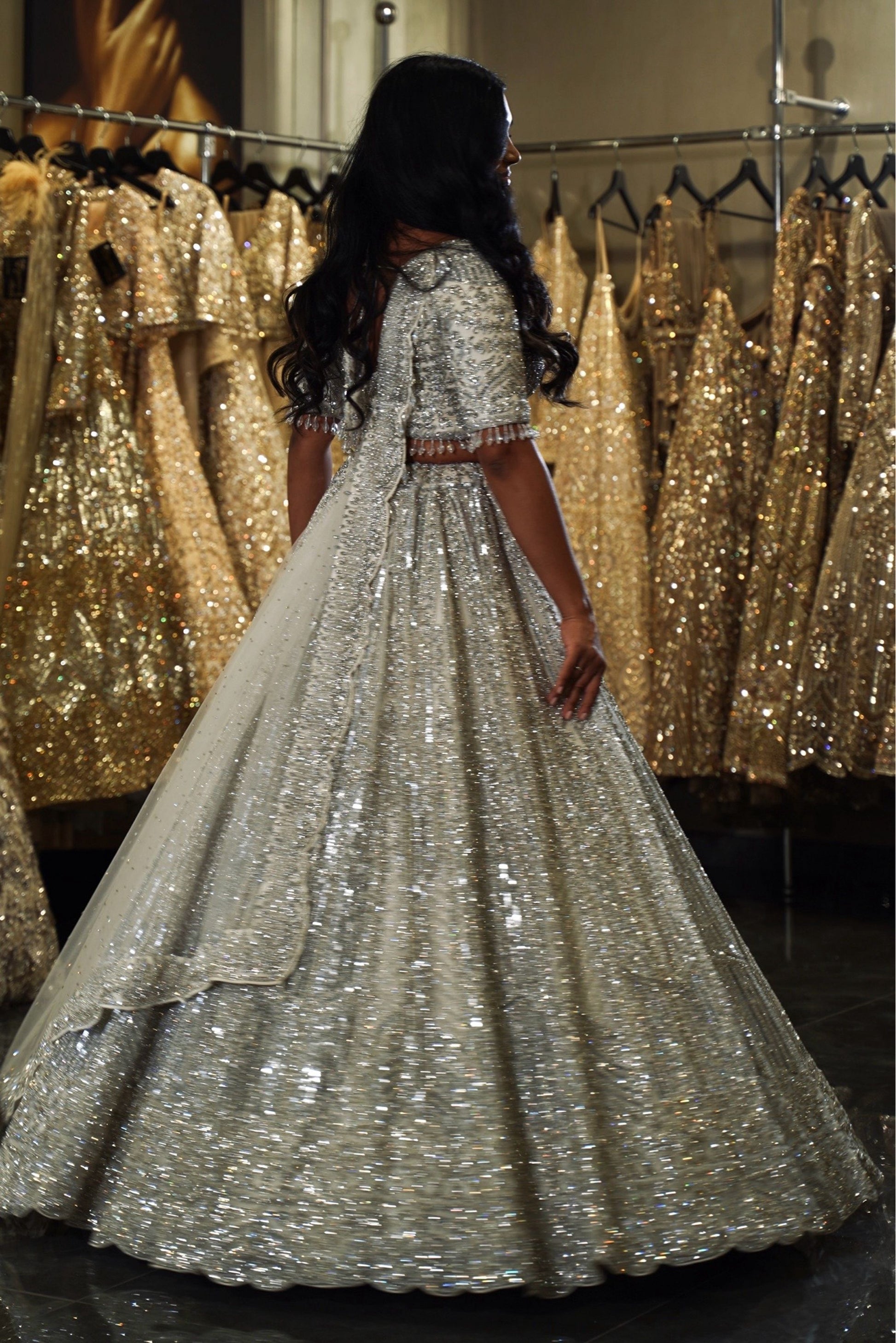 Pristine Silver & Ivory Linear Sequin Embroidered Bridal Lehenga
