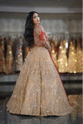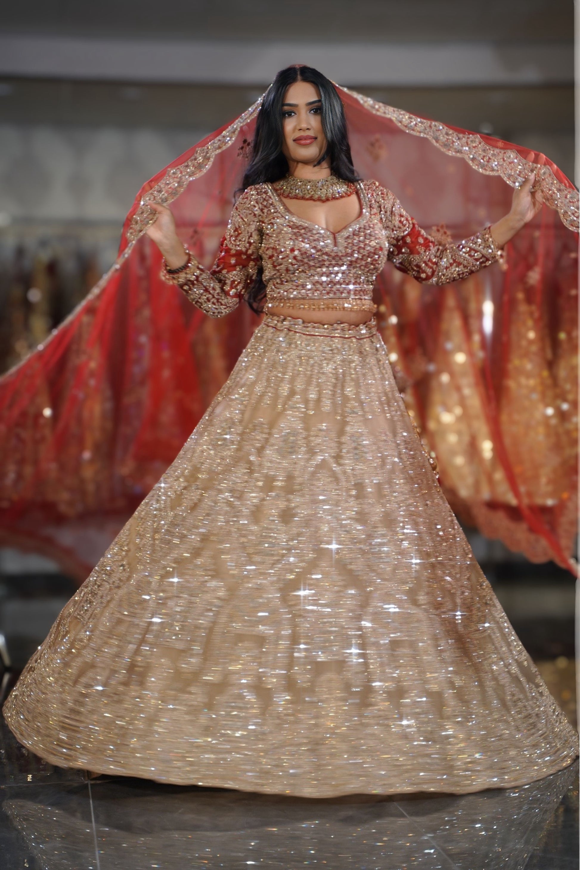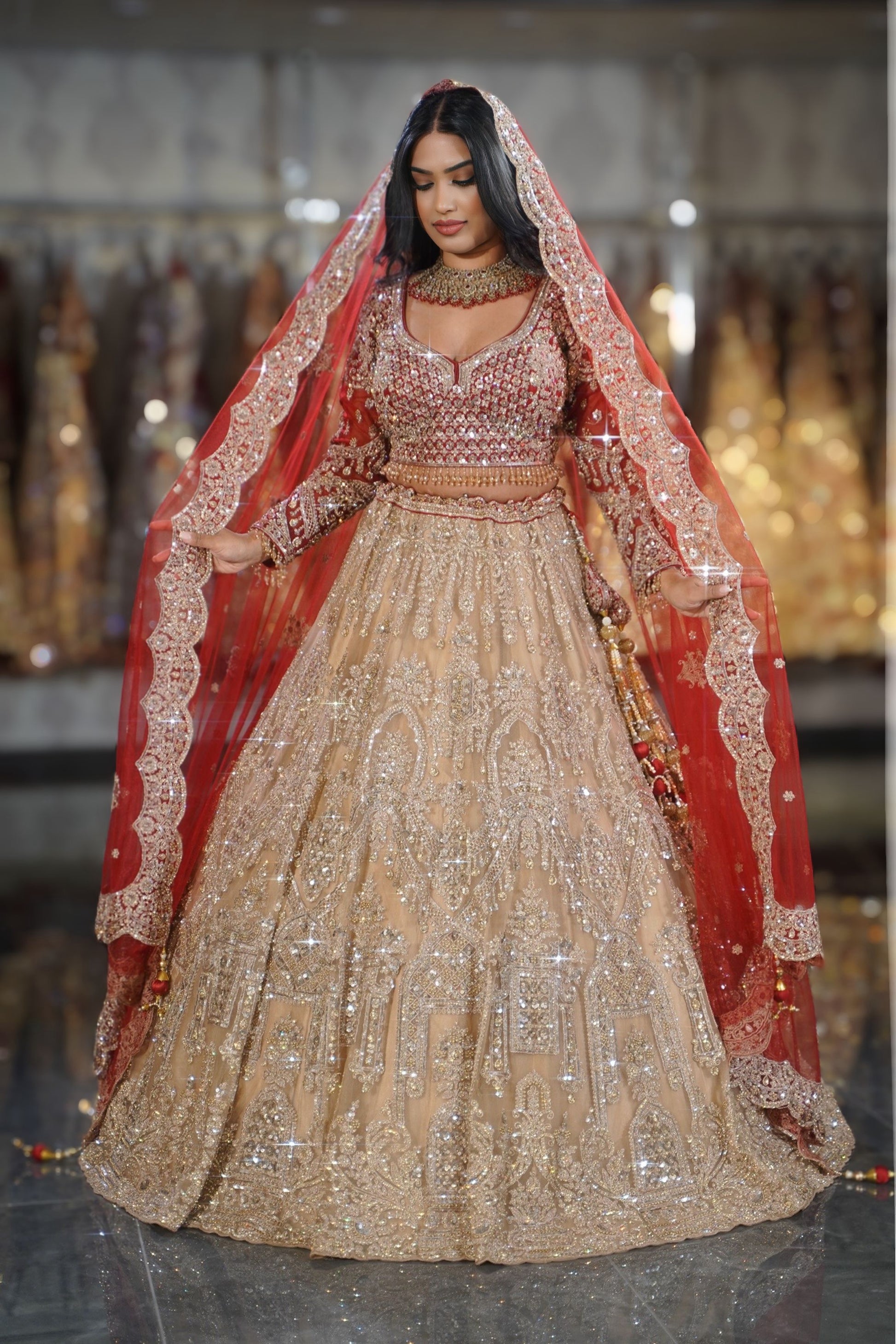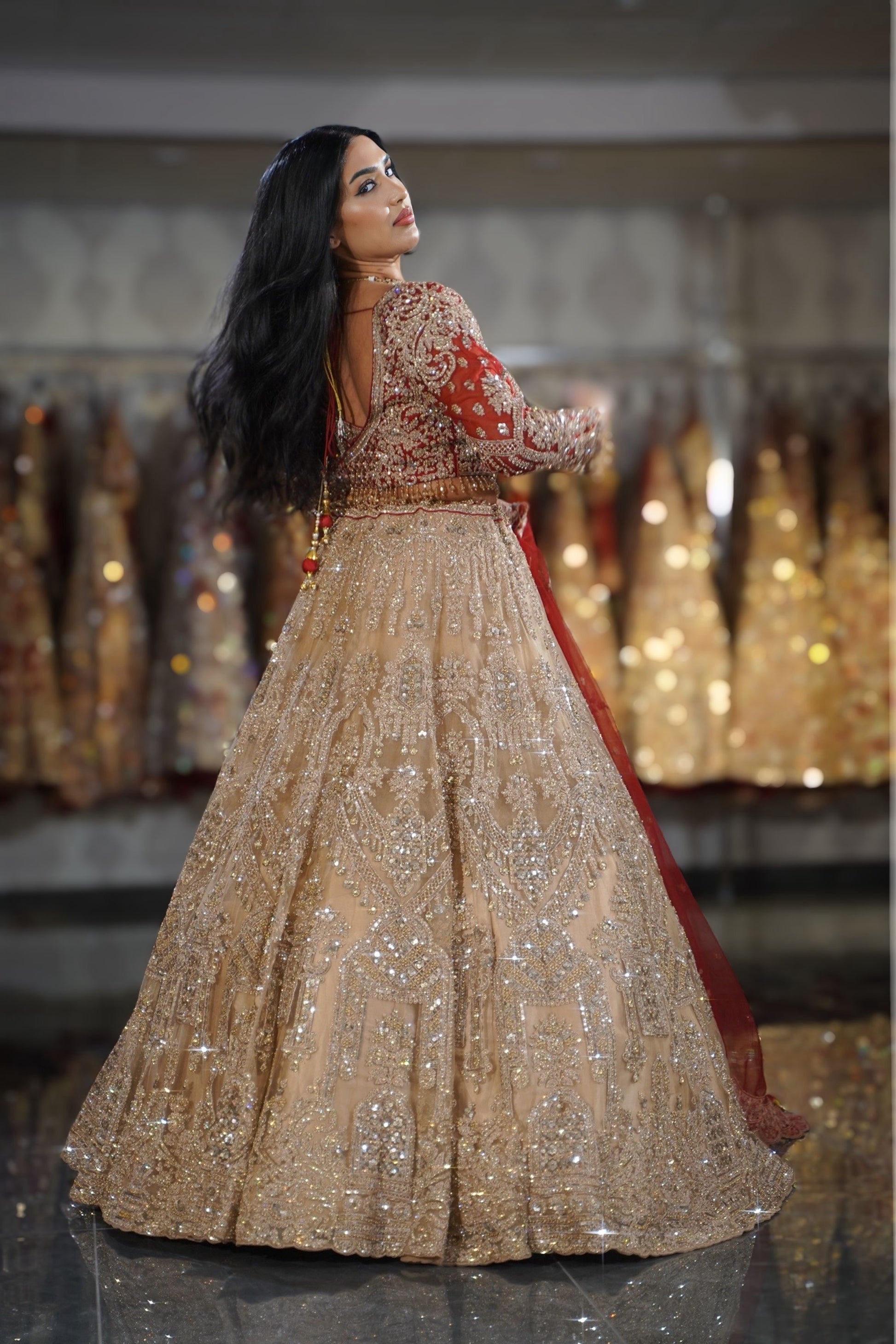 Step into your fairytale moment with this breathtaking Crimson & Gold Bridal Lehenga Set. This regal ensemble masterfully plays with contrast, pairing a rich maroon blouse with a shimmering champagne gold skirt to create a look that is both traditional and boldly distinct. It is the ultimate choice for the bride who wants to command attention with a luxurious, dual-tone color palette on her special day.