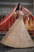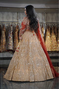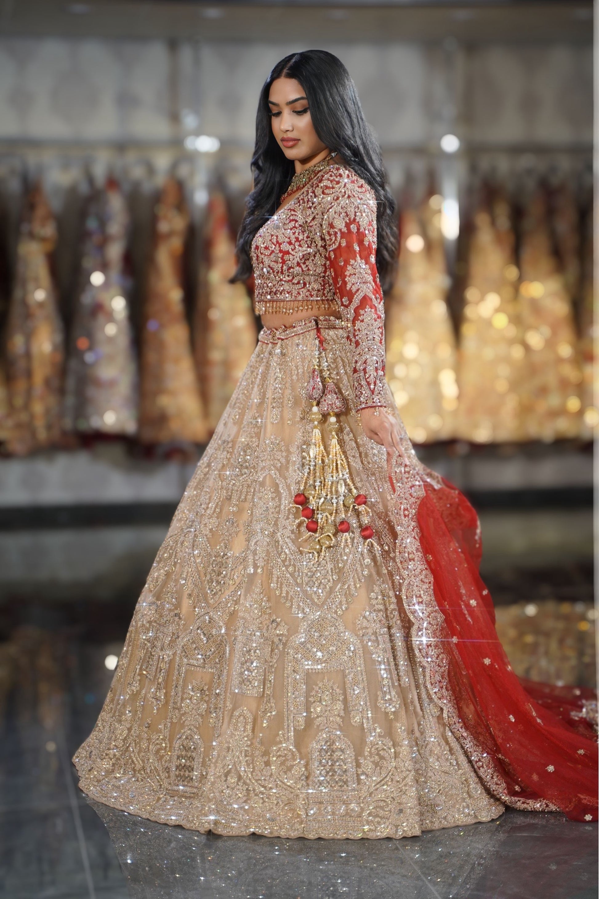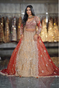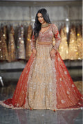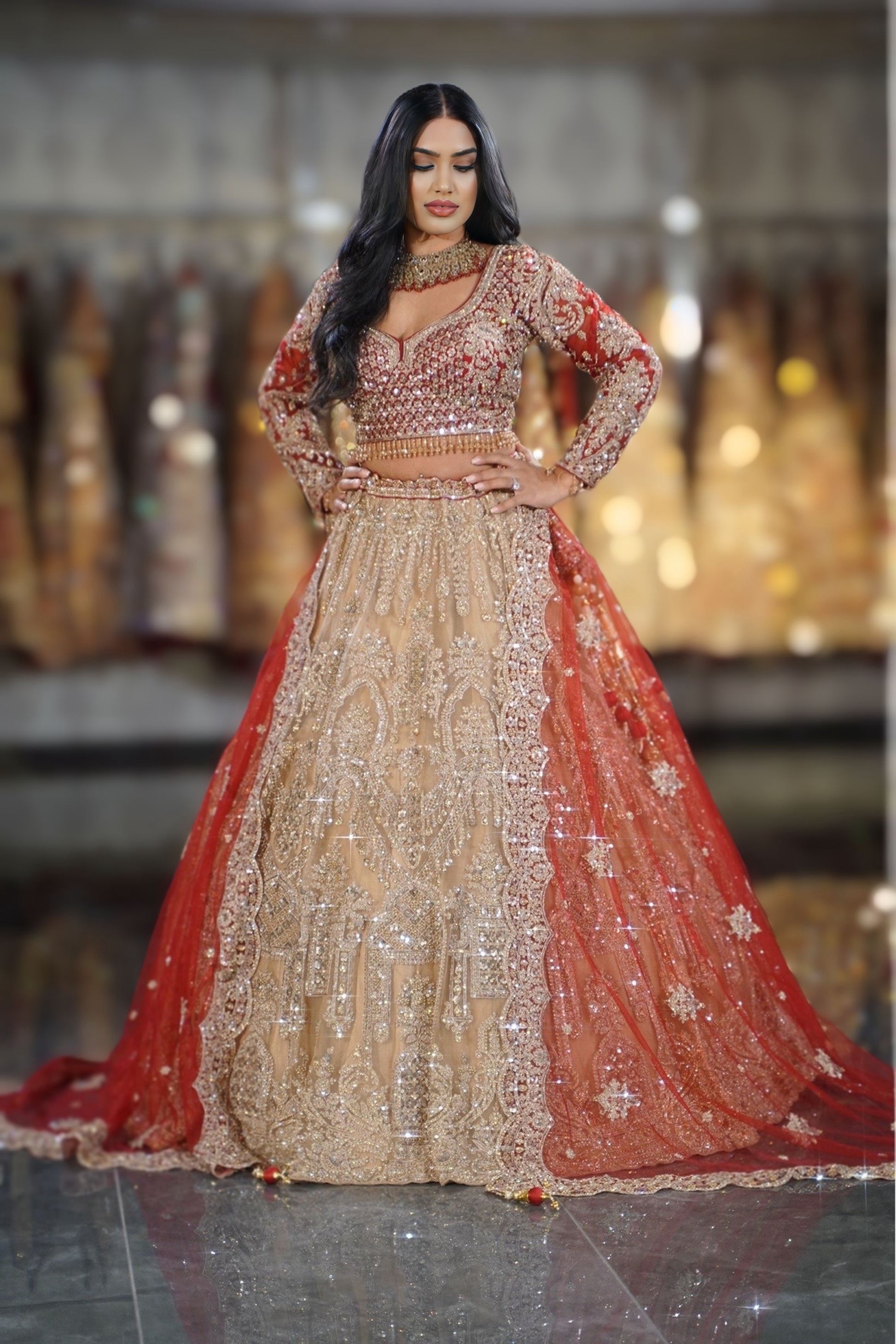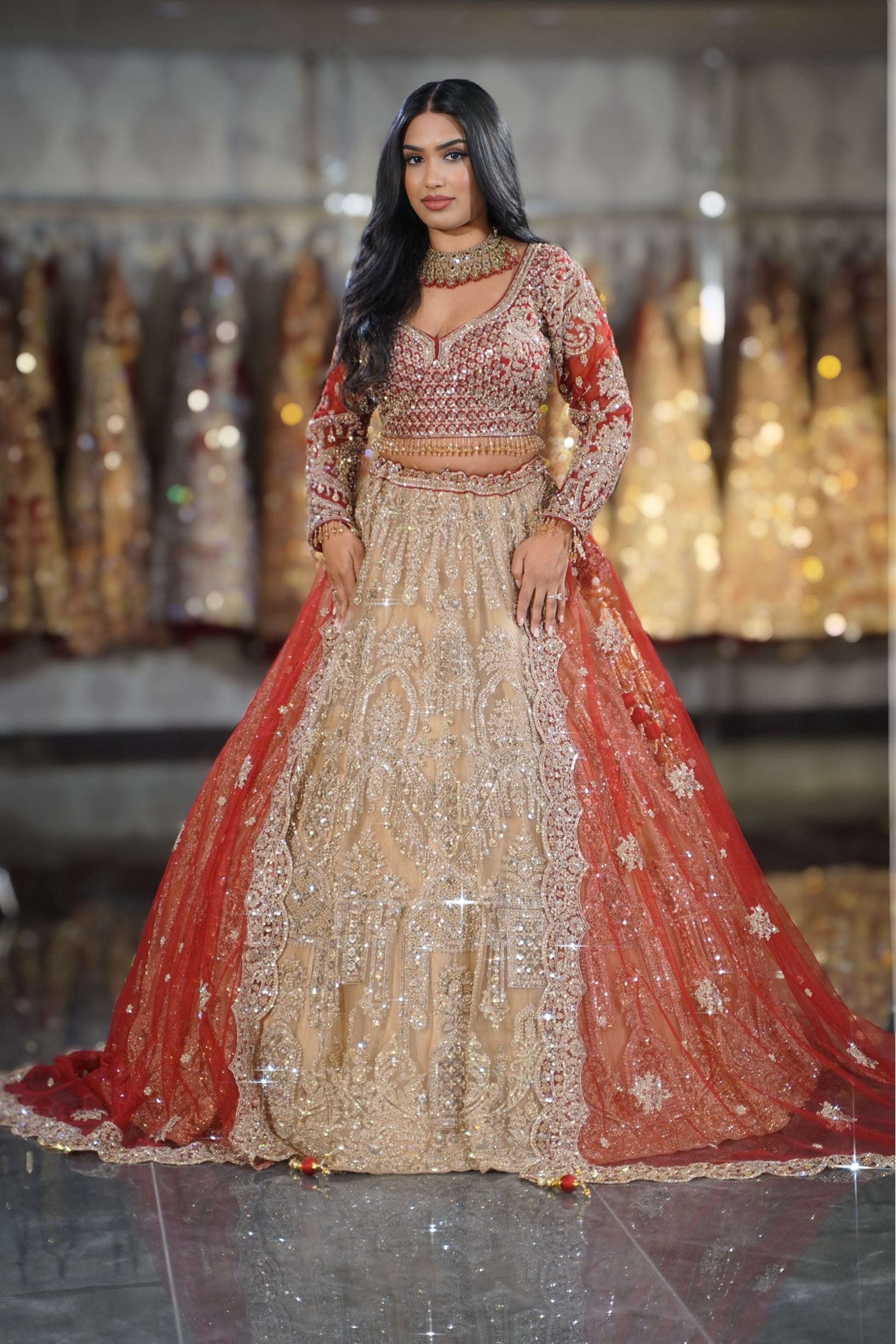 Step into your fairytale moment with this breathtaking Crimson & Gold Bridal Lehenga Set. This regal ensemble masterfully plays with contrast, pairing a rich maroon blouse with a shimmering champagne gold skirt to create a look that is both traditional and boldly distinct. It is the ultimate choice for the bride who wants to command attention with a luxurious, dual-tone color palette on her special day.