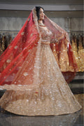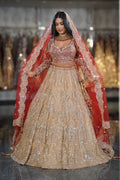 | Lehenga (Skirt) | Voluminous champagne gold skirt with heavy architectural and floral zari embroidery |