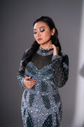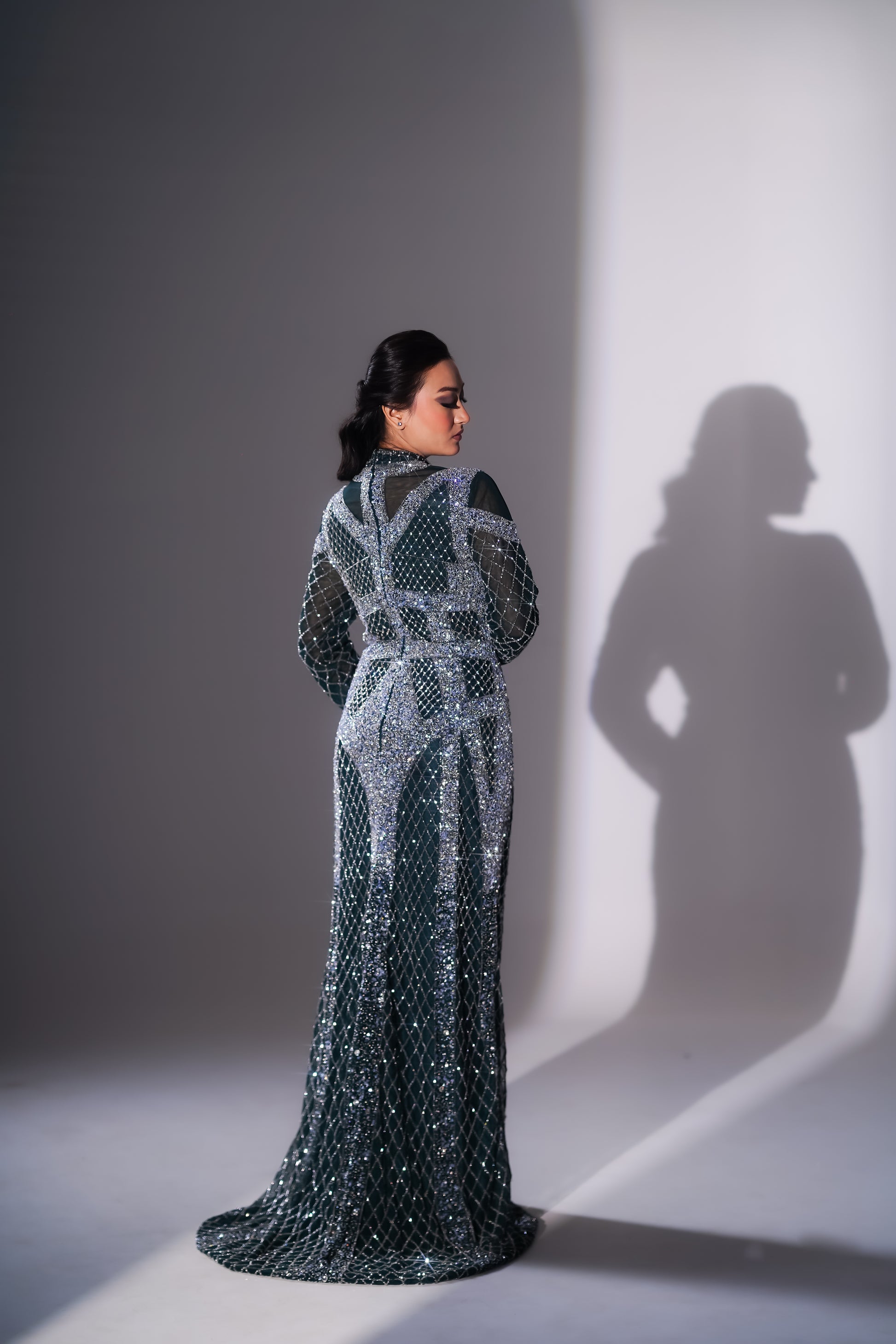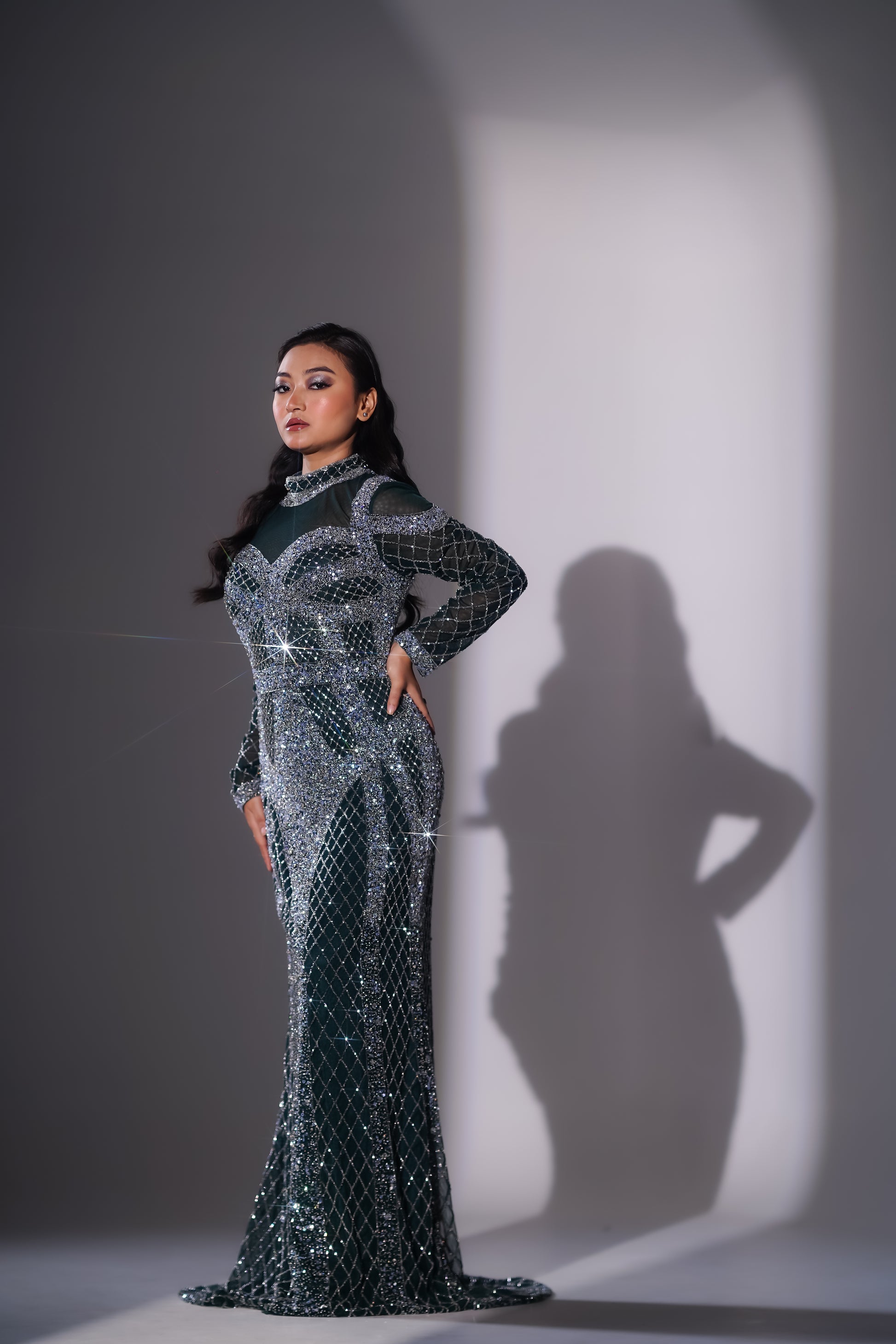 Make a striking entrance with this magnificent Emerald Green Evening Gown. A vision of structural elegance, this gown features a deep forest green base illuminated by precise, geometric silver artistry. Designed for the woman who appreciates sharp lines and high-fashion detailing, this floor-length masterpiece is the ultimate choice for a prestigious Gala, a winter Wedding Reception, or a Red Carpet event where you want to exude regal confidence.