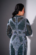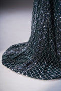 Geometric Diamond Lattice: The skirt and sleeves are defined by a sharp diamond trellis (lattice) pattern embroidered in silver sequins and beads, creating a mesmerizing, elongated visual effect 💠