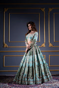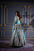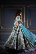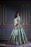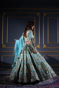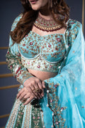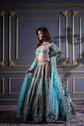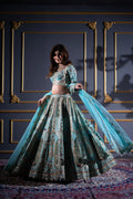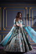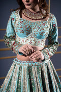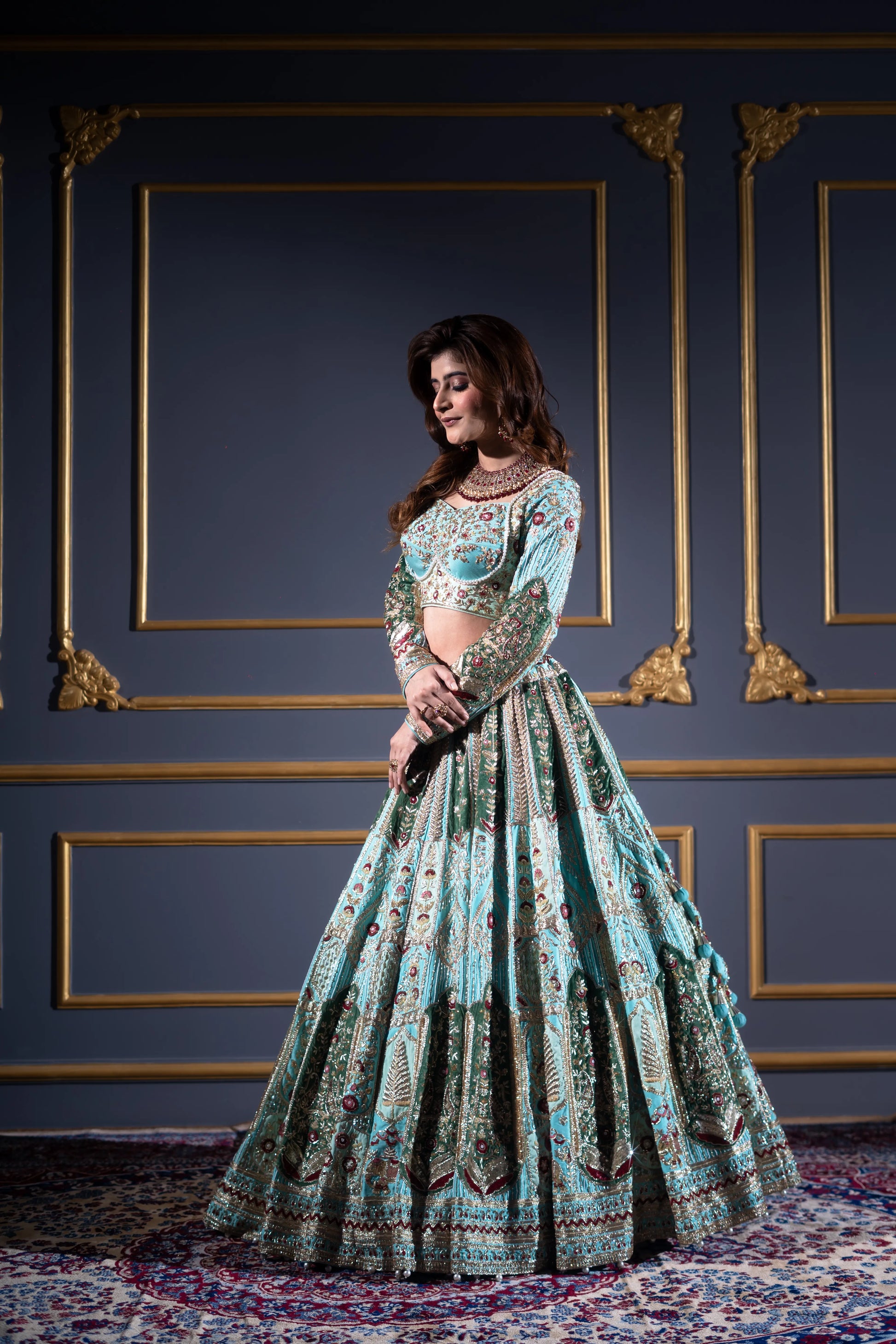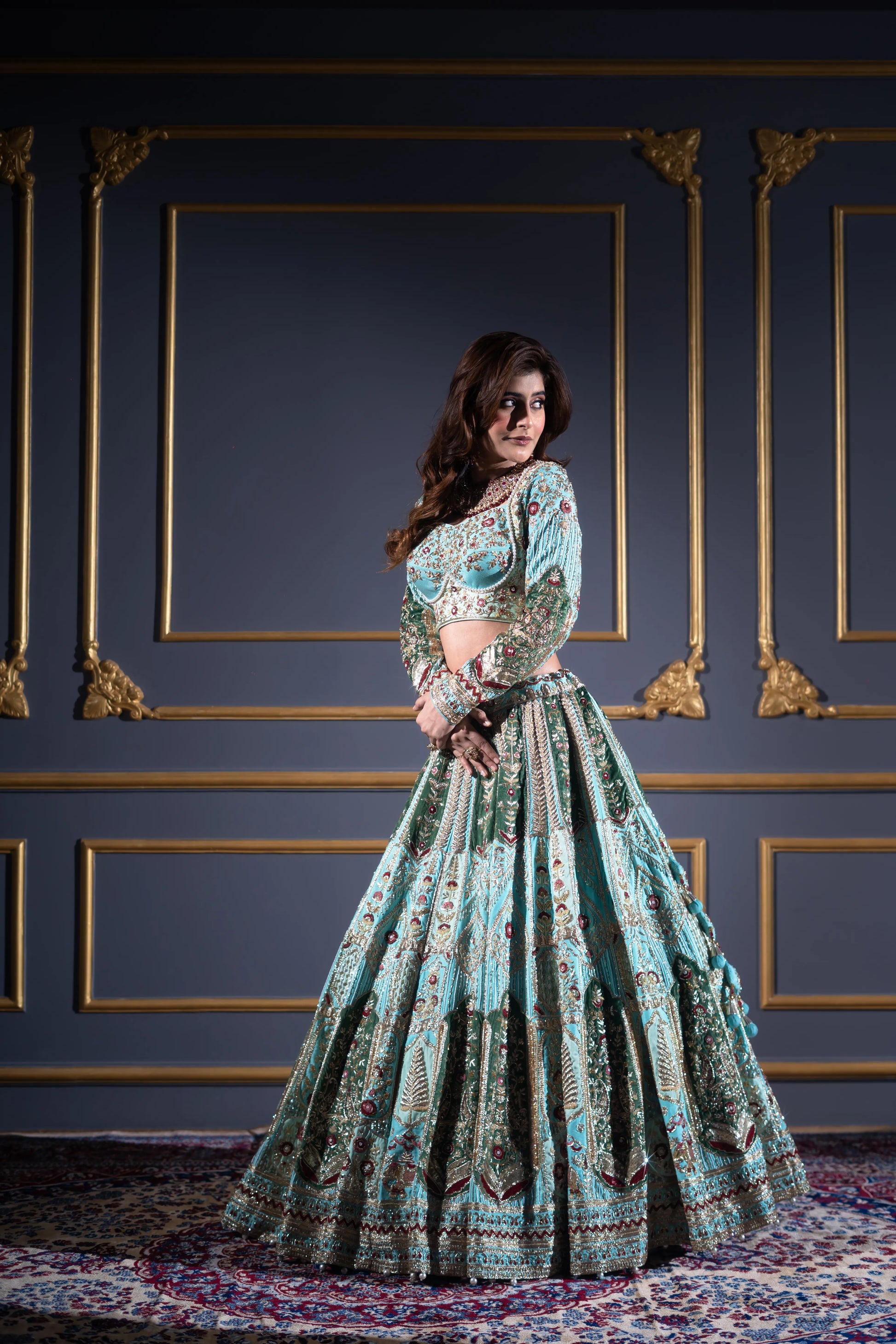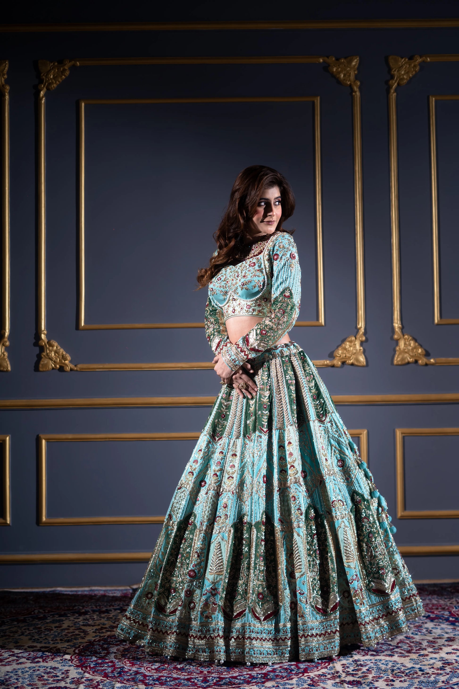 Turquoise Blue & Olive Pearl Embroidered Bridal Lehenga