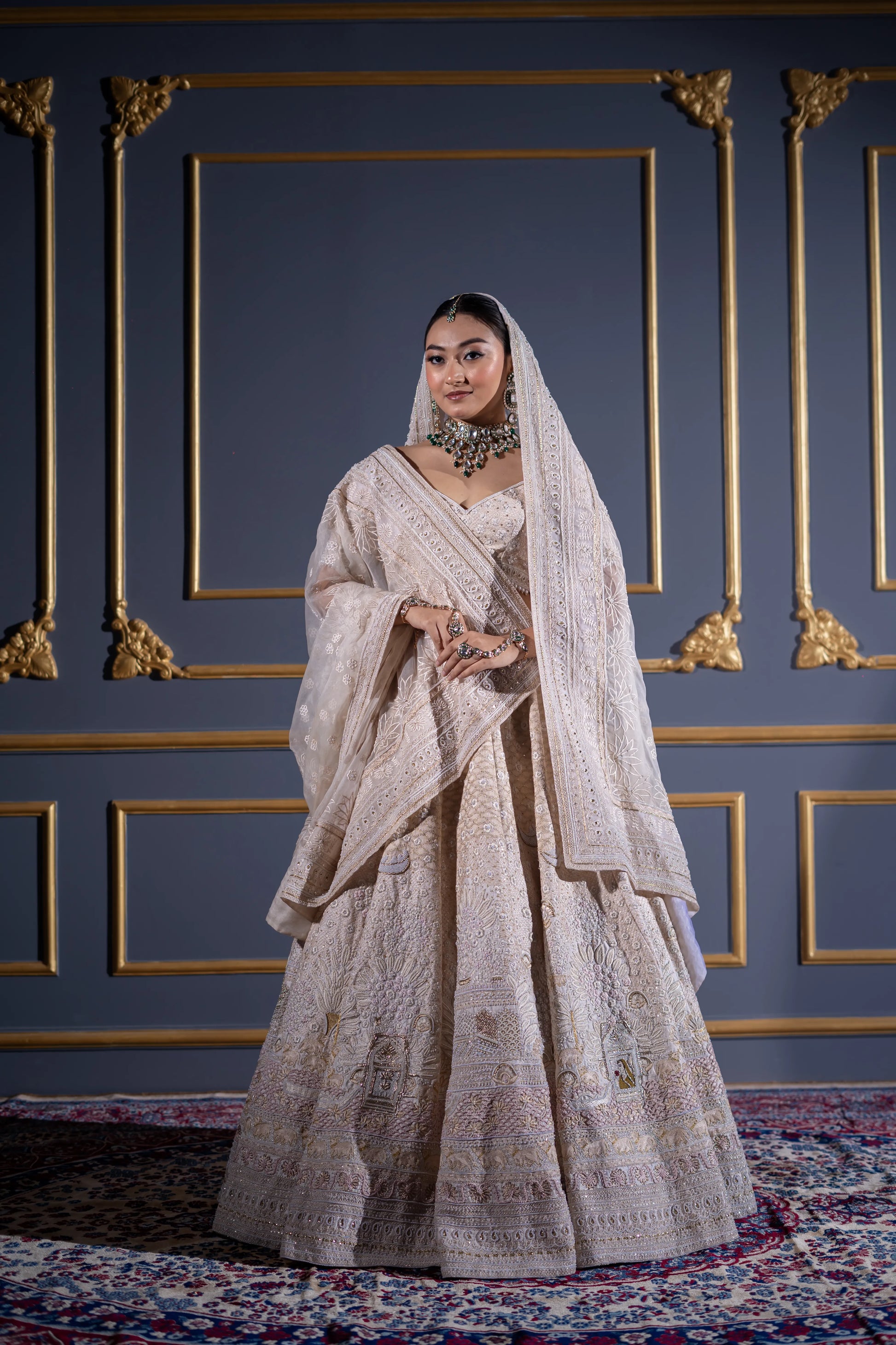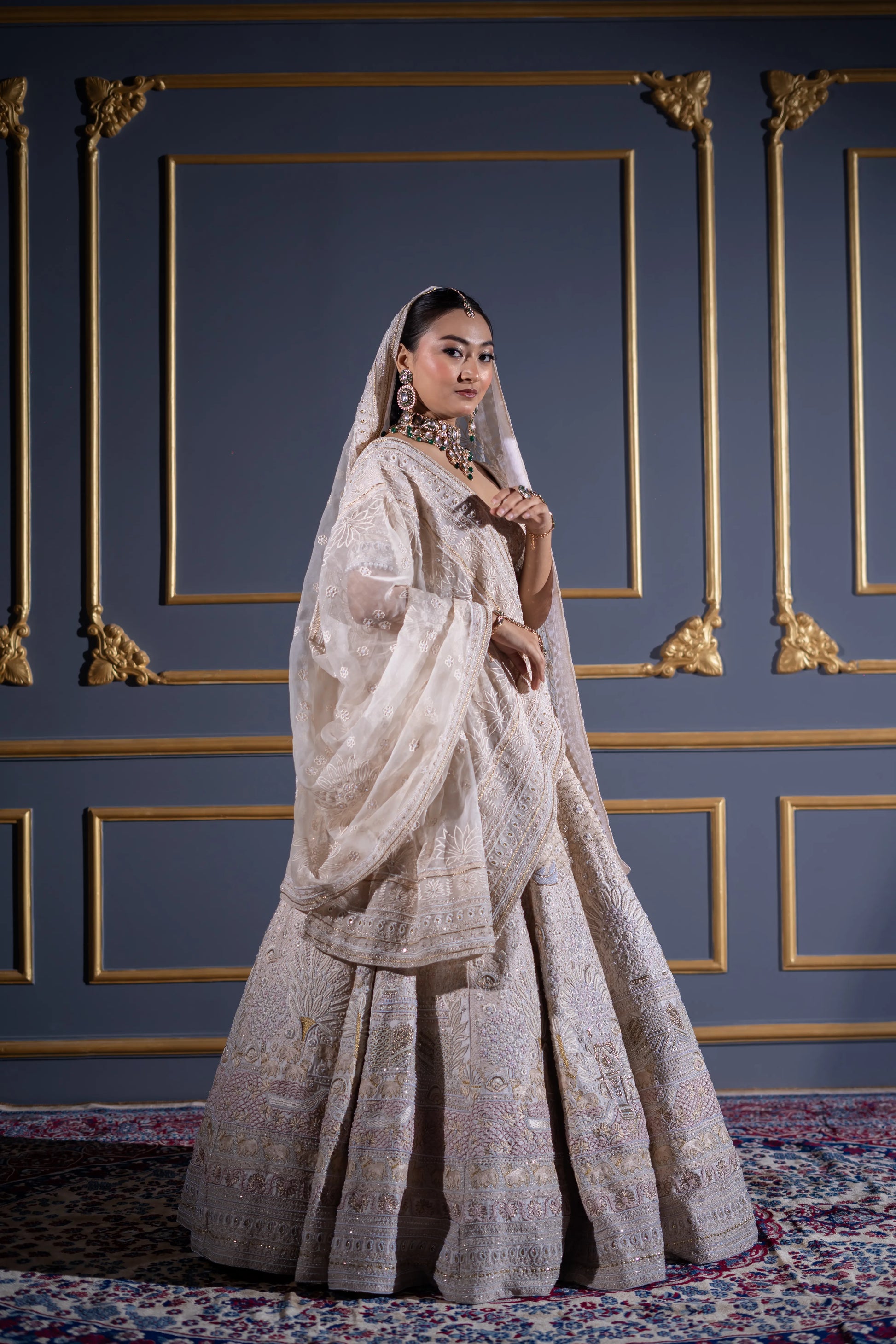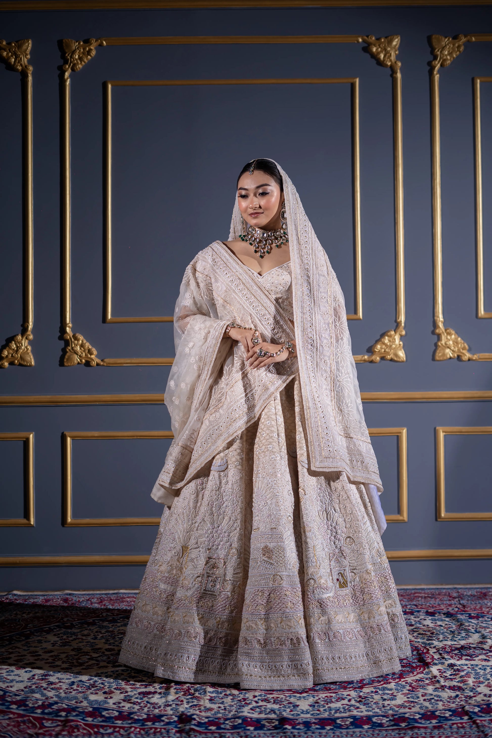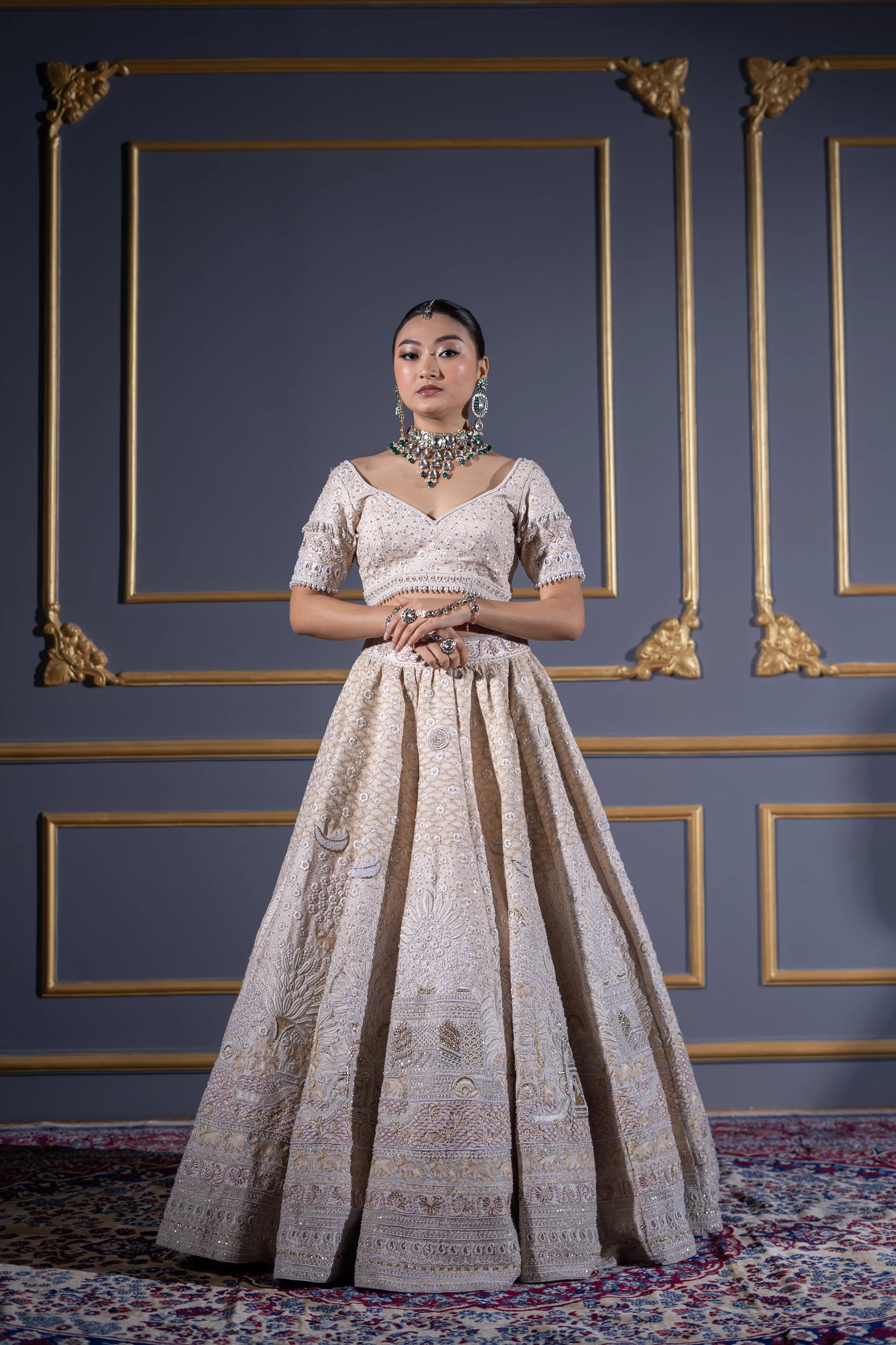 Ivory Beige Bird & Nature Motif Embroidered Bridal Lehenga