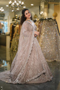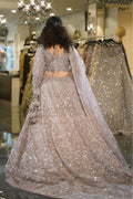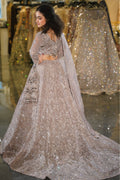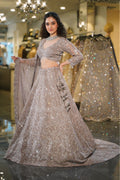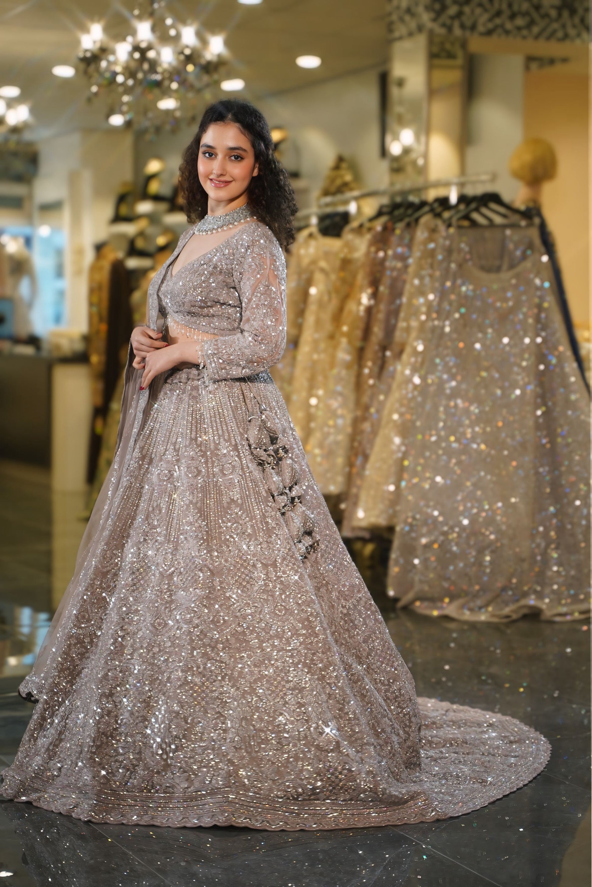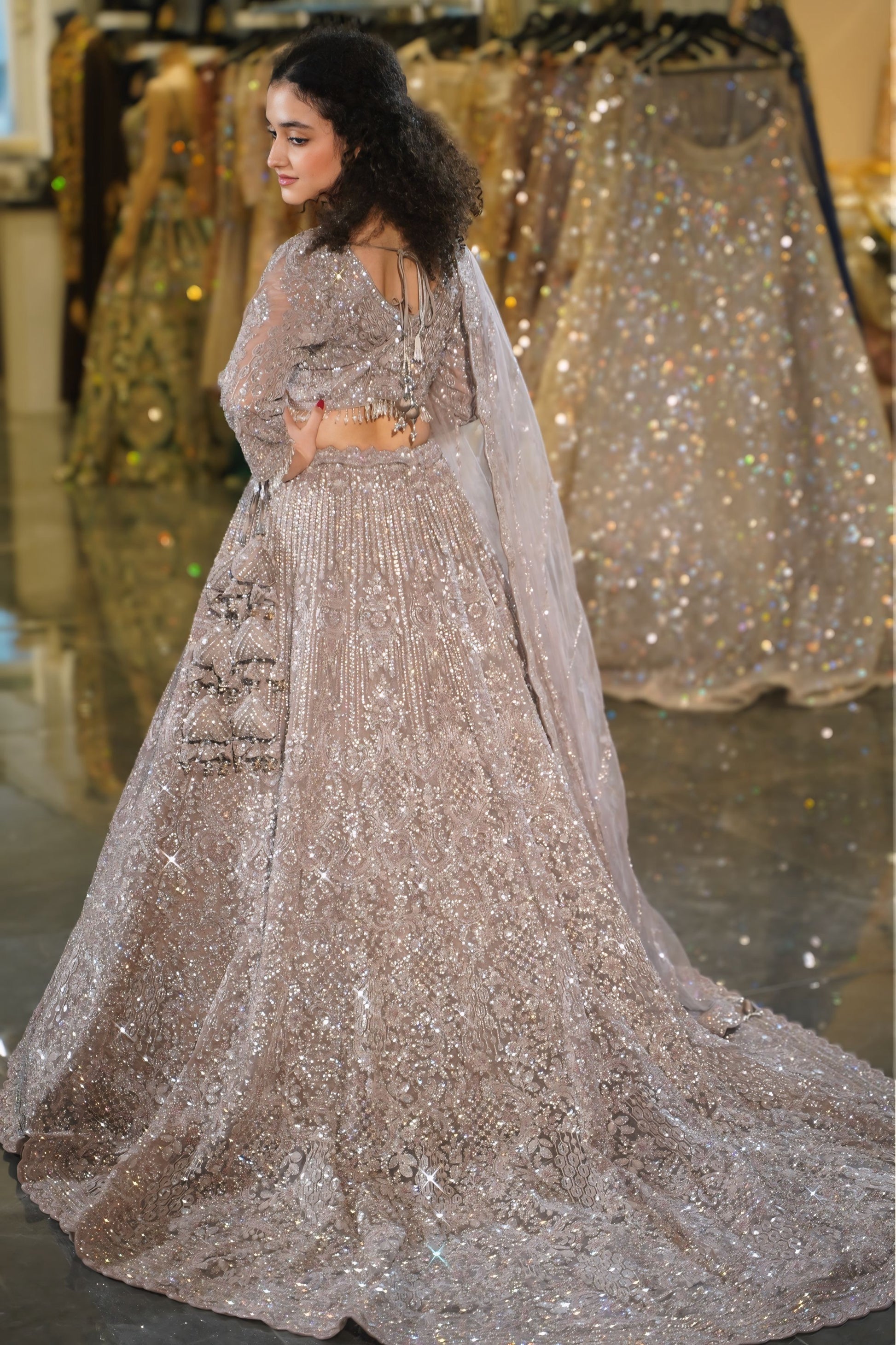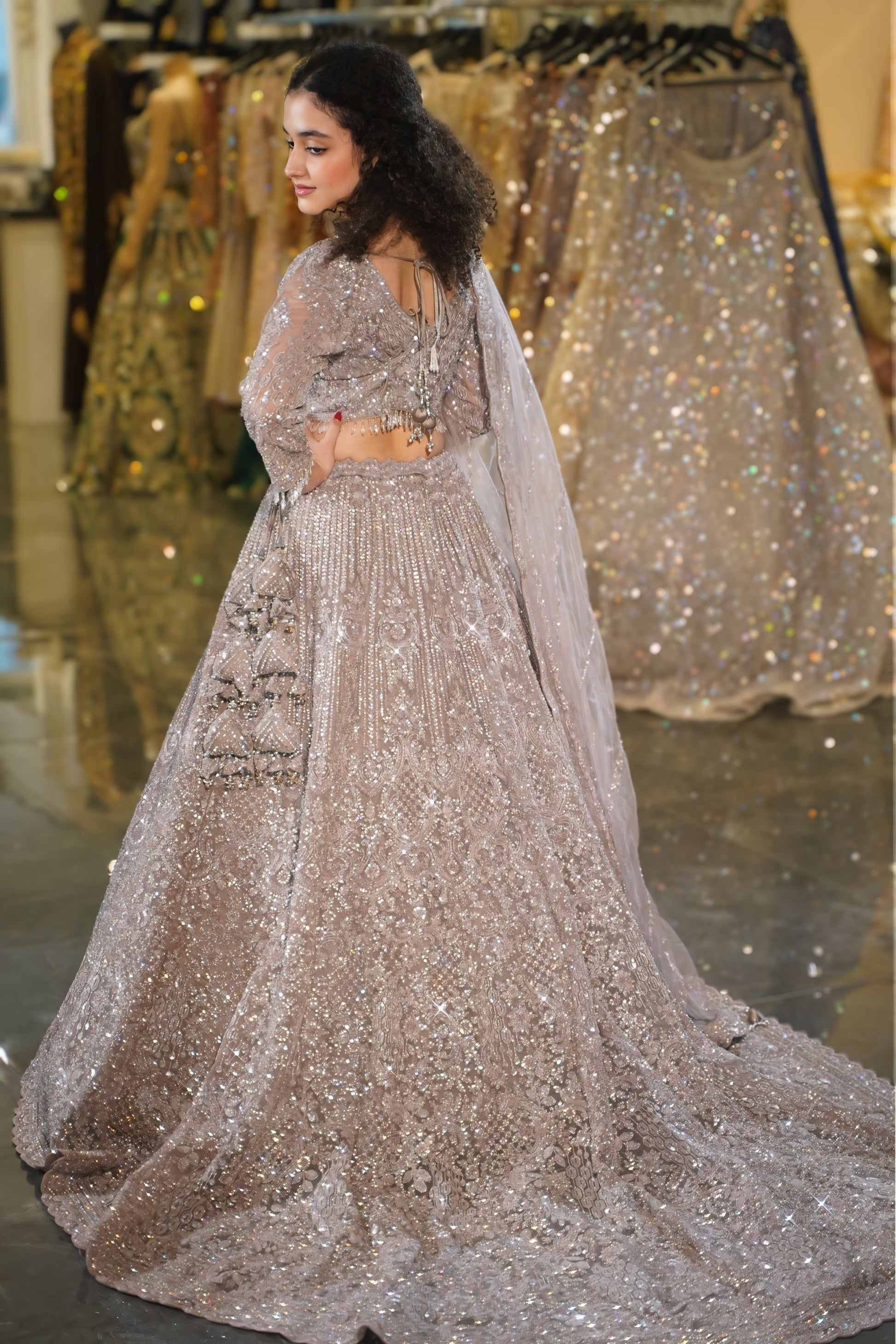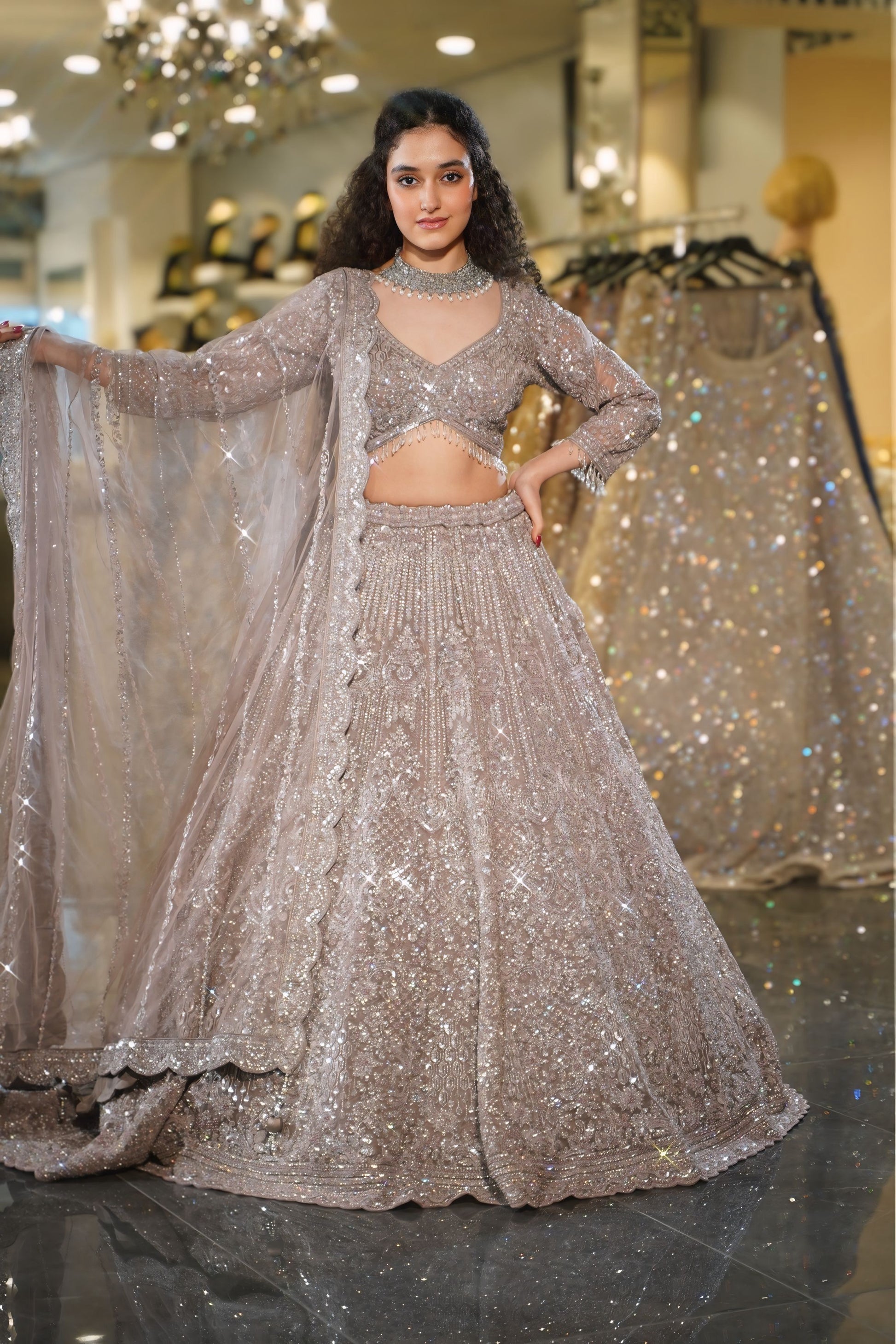 Step into a realm of dazzling sophistication with this Dusty Mauve Bridal Lehenga Set. This avant-garde ensemble moves beyond traditional palettes to offer a cool-toned, ethereal aesthetic perfect for the modern bride. Bathed in silver sequins and accented with playful crystal fringes, this outfit creates a "frosted" effect that sparkles with diamond-like intensity, making it an impeccable choice for a high-glamour reception or sangeet.