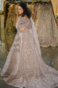 Frosted Silver Sheen: The dusty mauve net base is densely saturated with silver cutdana and sequins, creating a metallic, icy glow that captivates under spotlight ✨