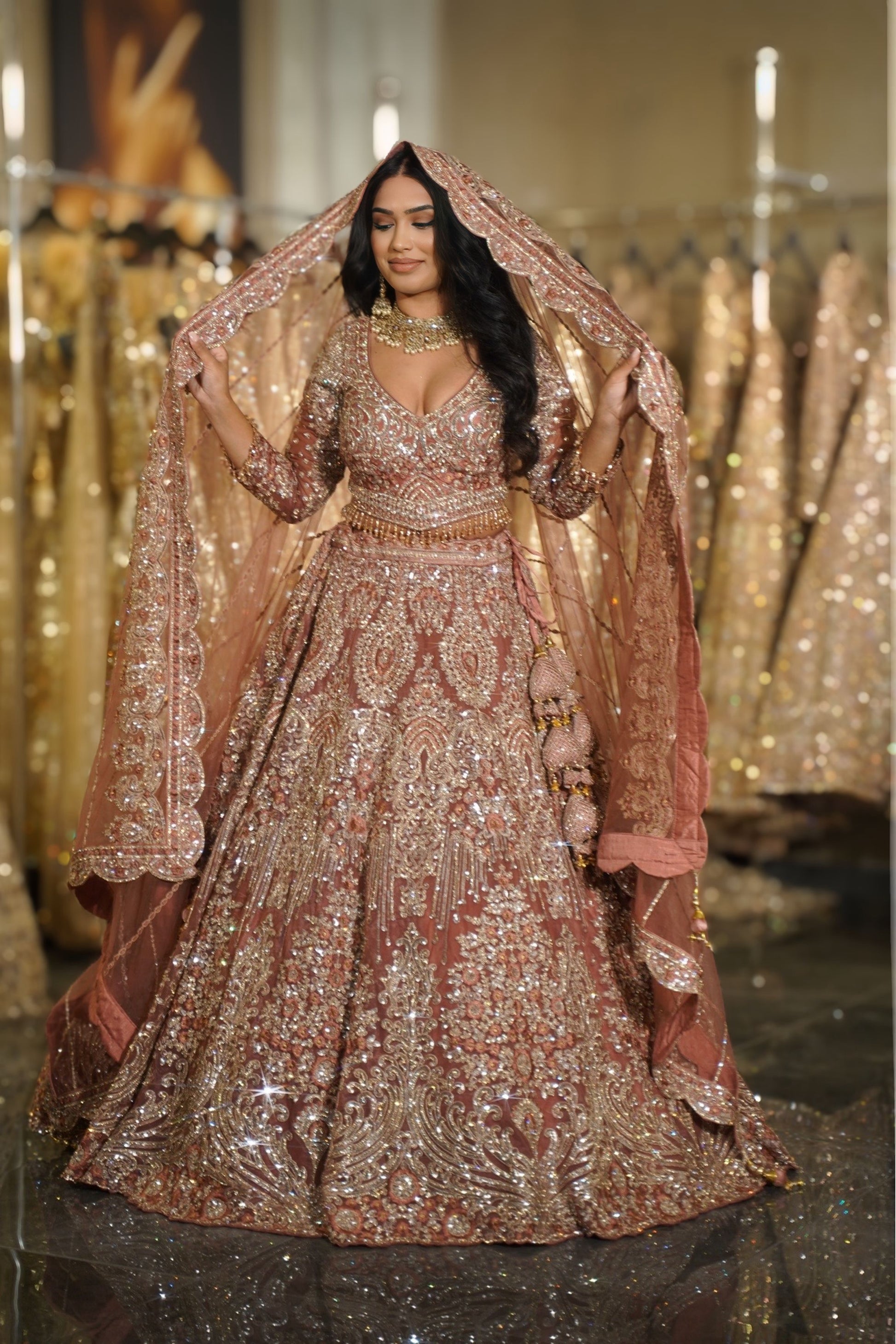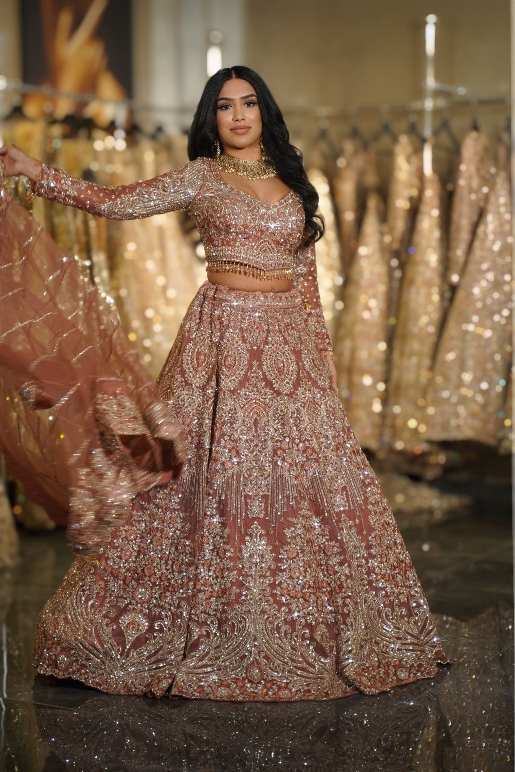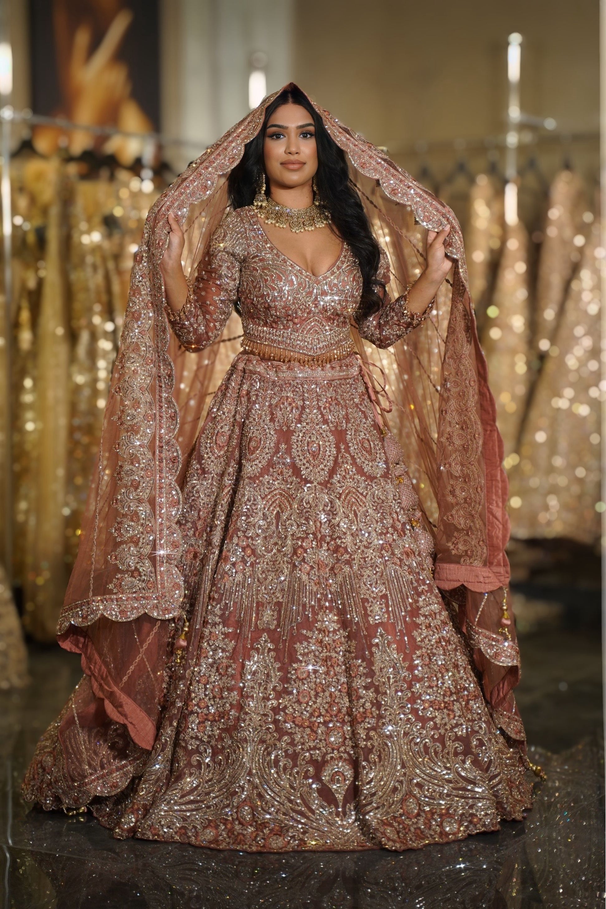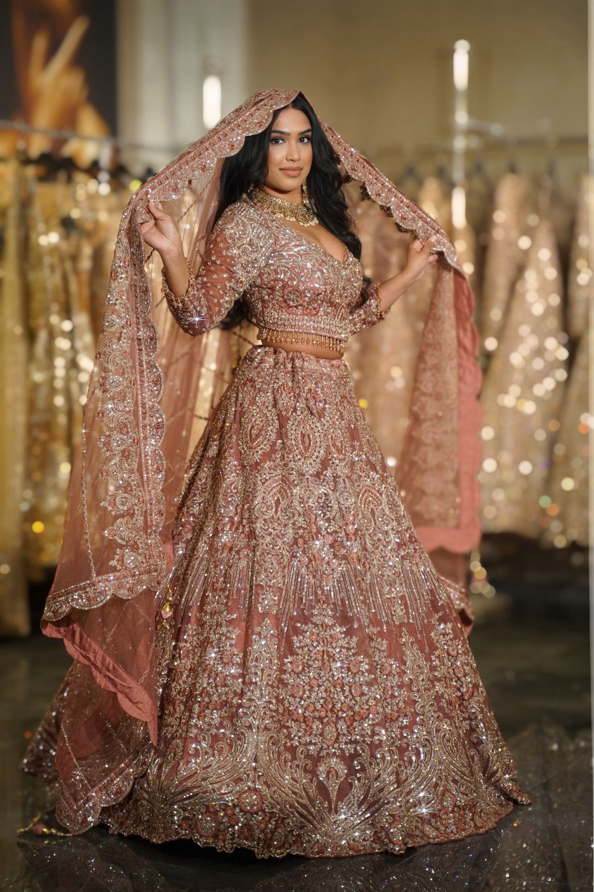 Embrace a look of timeless romance with this breathtaking Dusty Rose Lehenga Set. Moving away from bright bridal reds, this ensemble offers a sophisticated, earthy pink hue that exudes vintage glamour. Heavily embellished with antique silver and crystal work, it creates a mesmerizing shimmer that feels both regal and ethereal. Perfect for the bride who wants a unique, high-fashion color palette for her reception or grand engagement.
