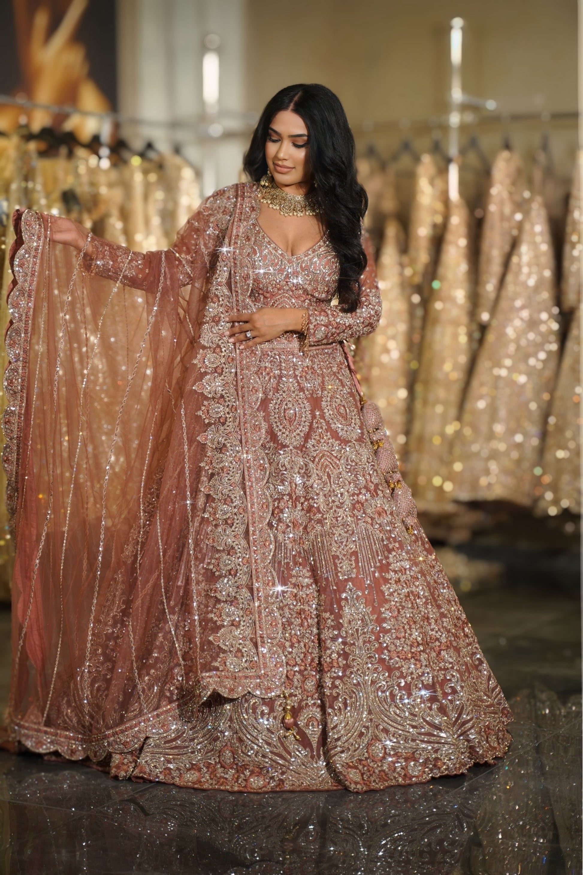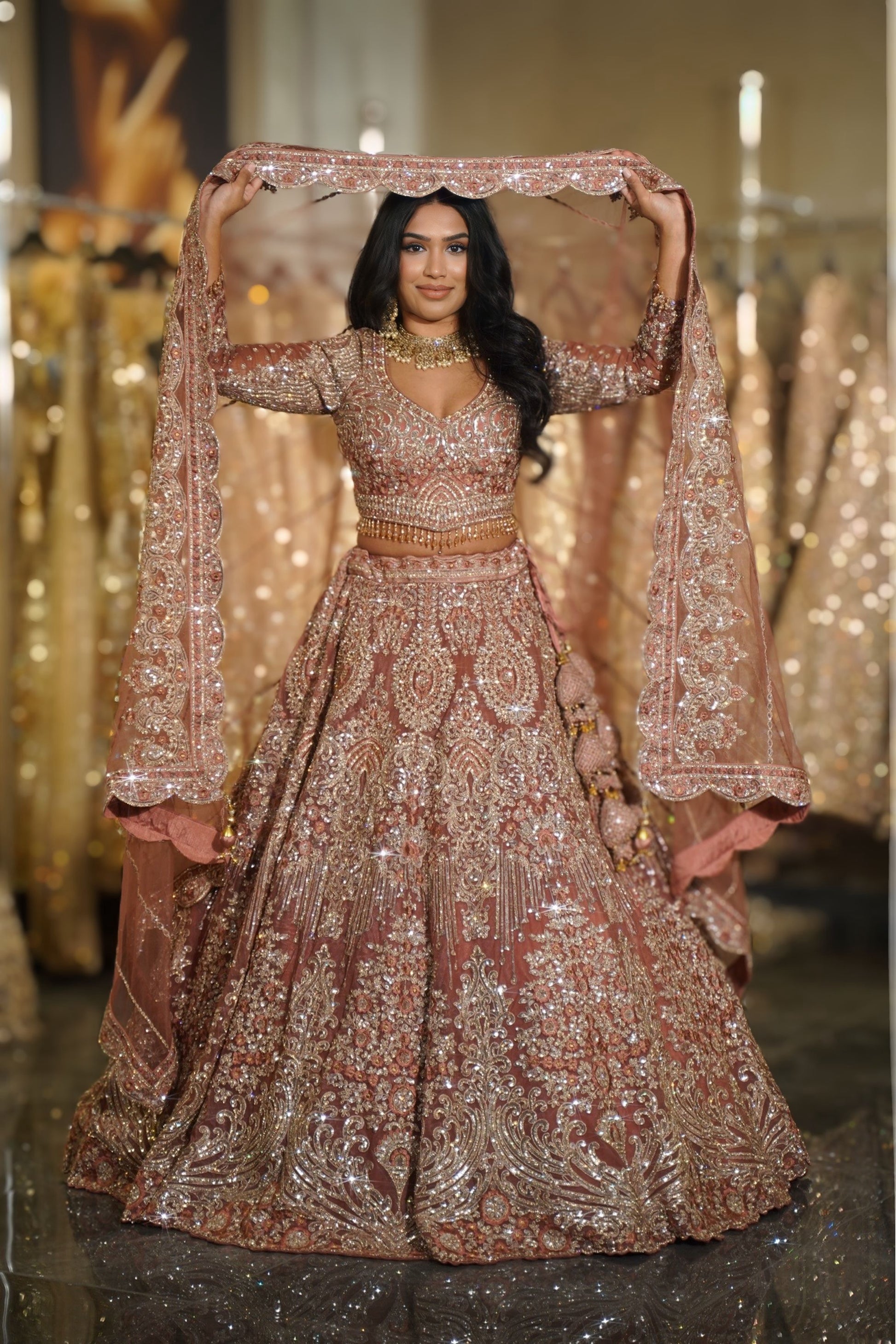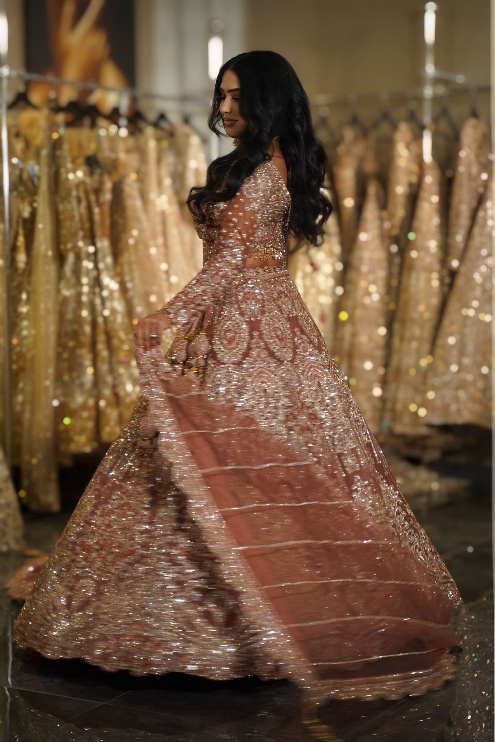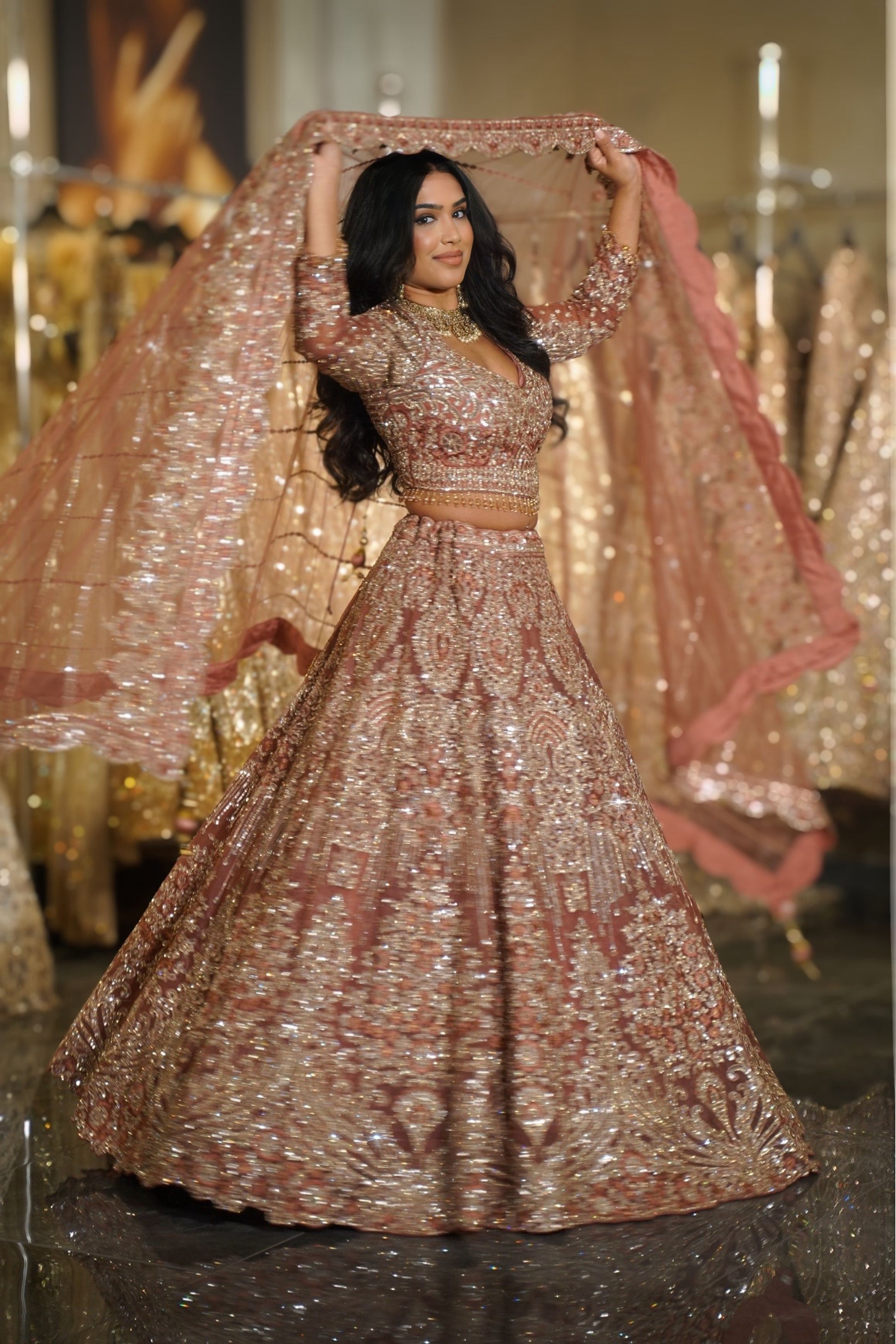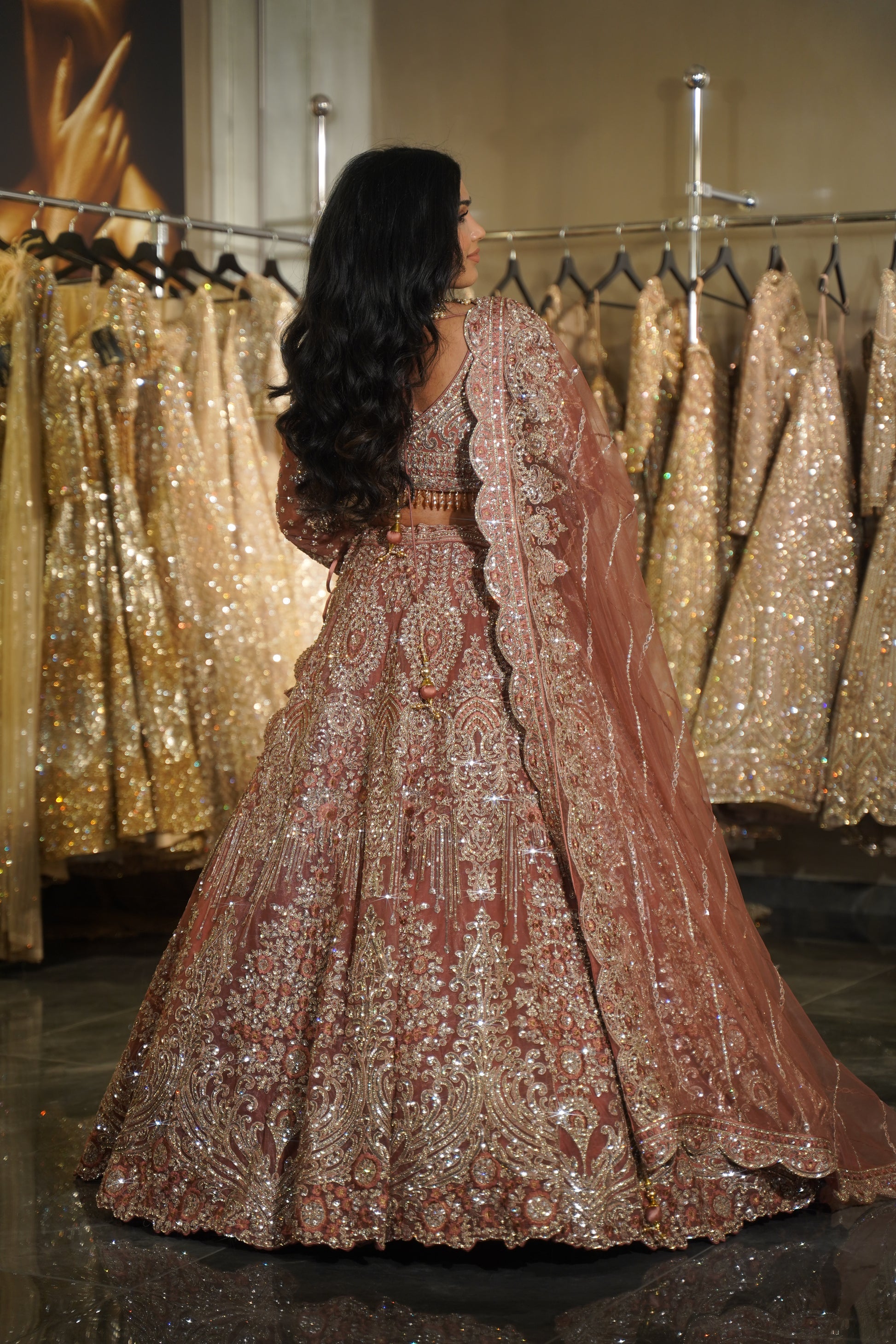 Embrace a look of timeless romance with this breathtaking Dusty Rose Lehenga Set. Moving away from bright bridal reds, this ensemble offers a sophisticated, earthy pink hue that exudes vintage glamour. Heavily embellished with antique silver and crystal work, it creates a mesmerizing shimmer that feels both regal and ethereal. Perfect for the bride who wants a unique, high-fashion color palette for her reception or grand engagement.