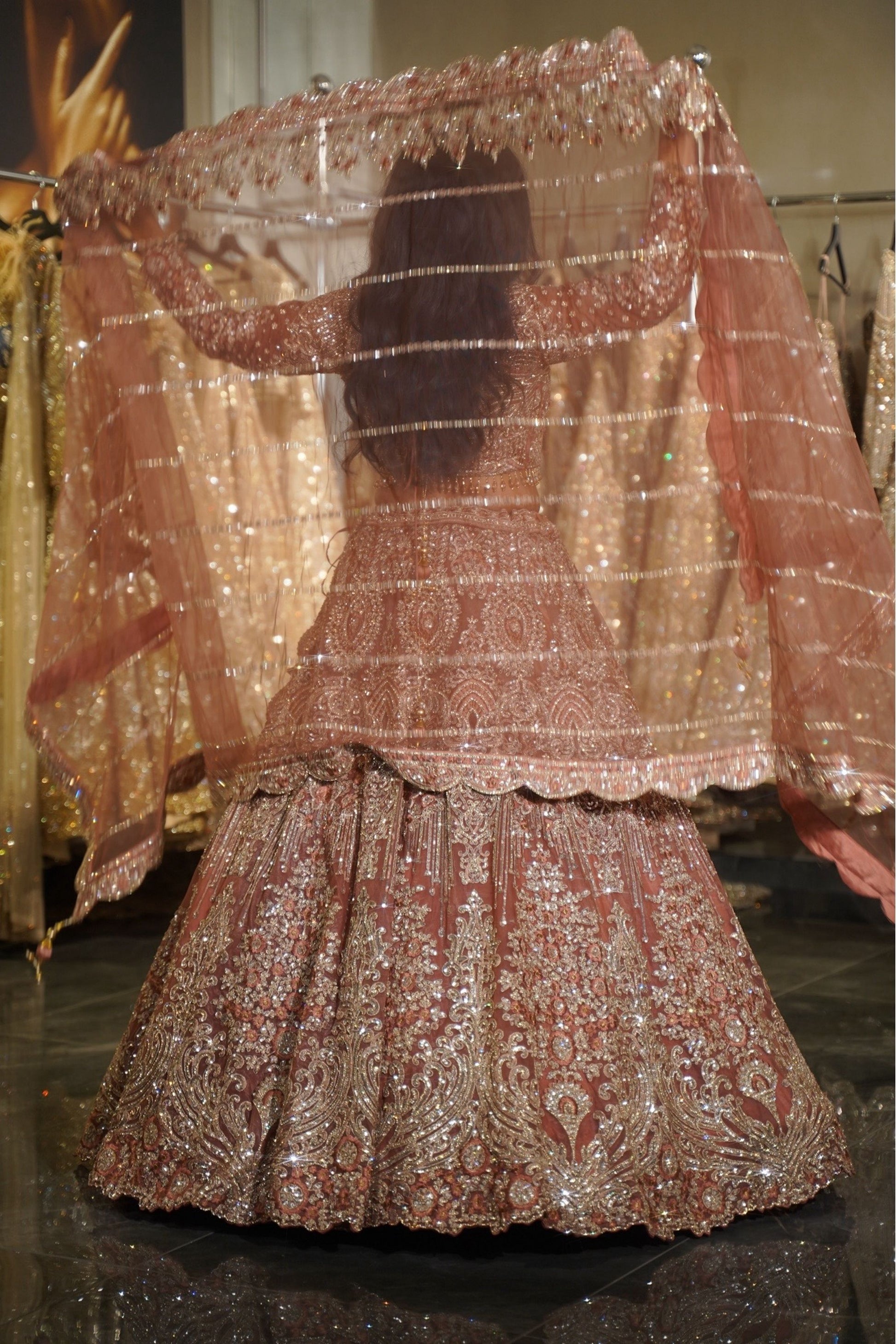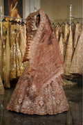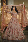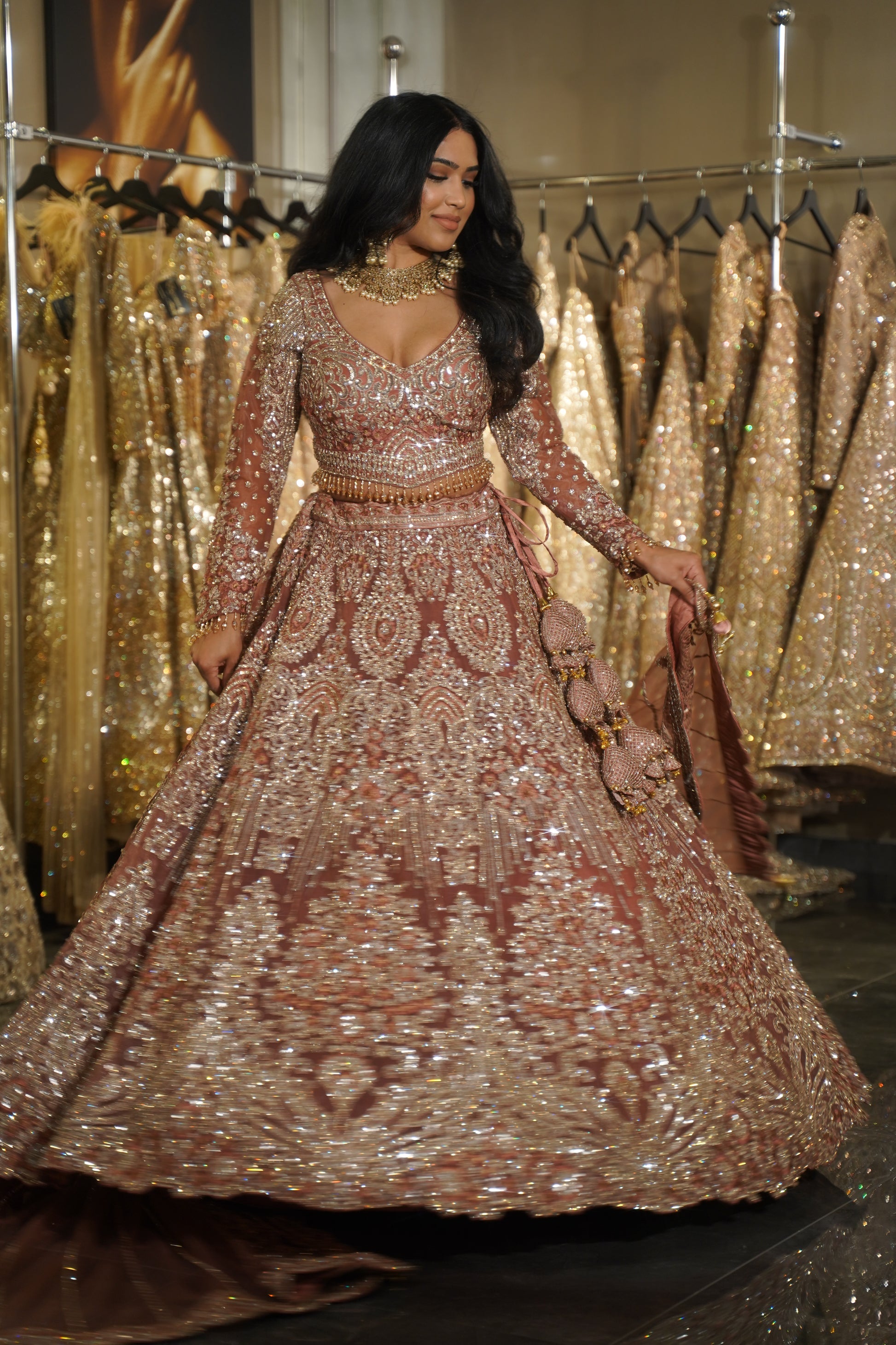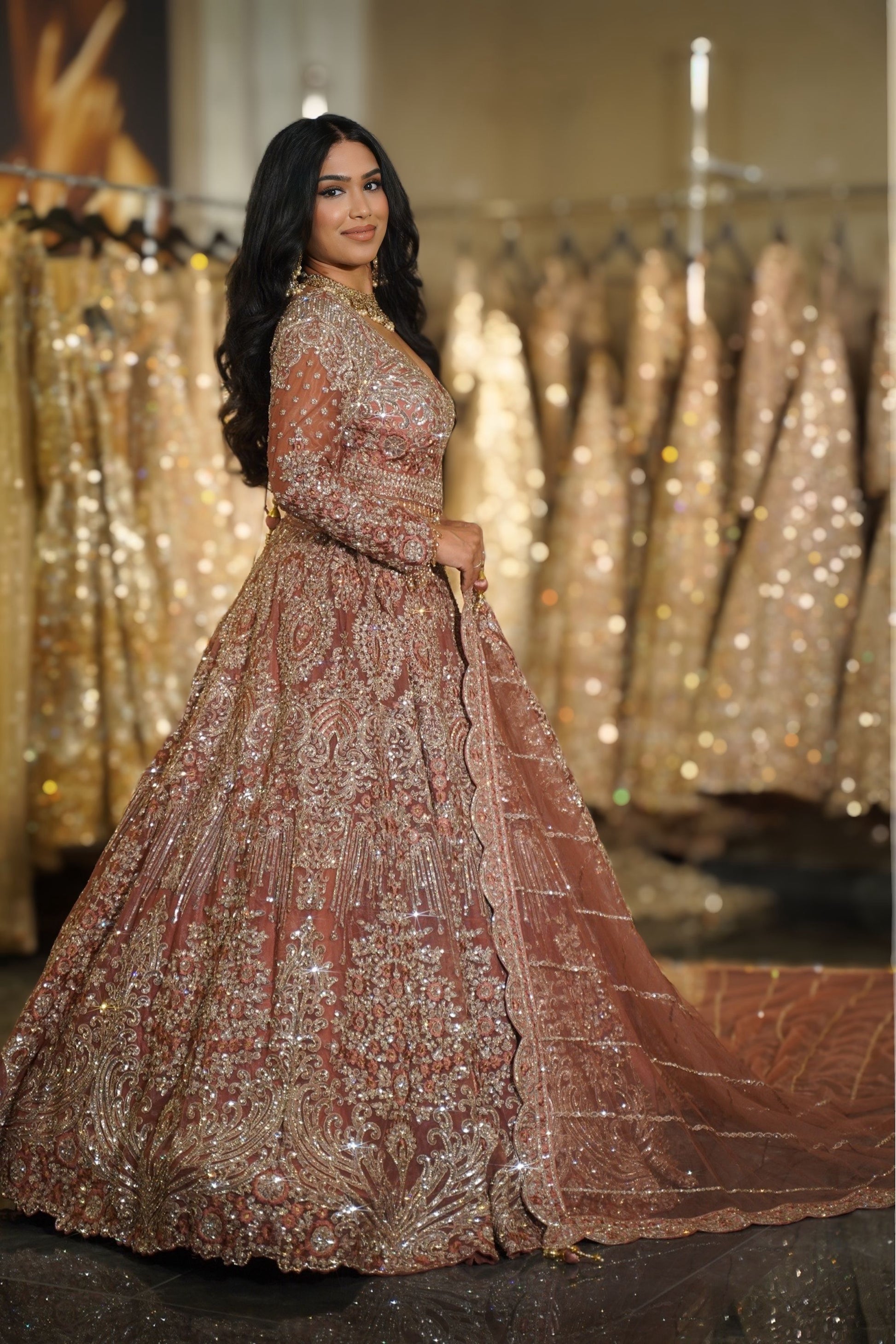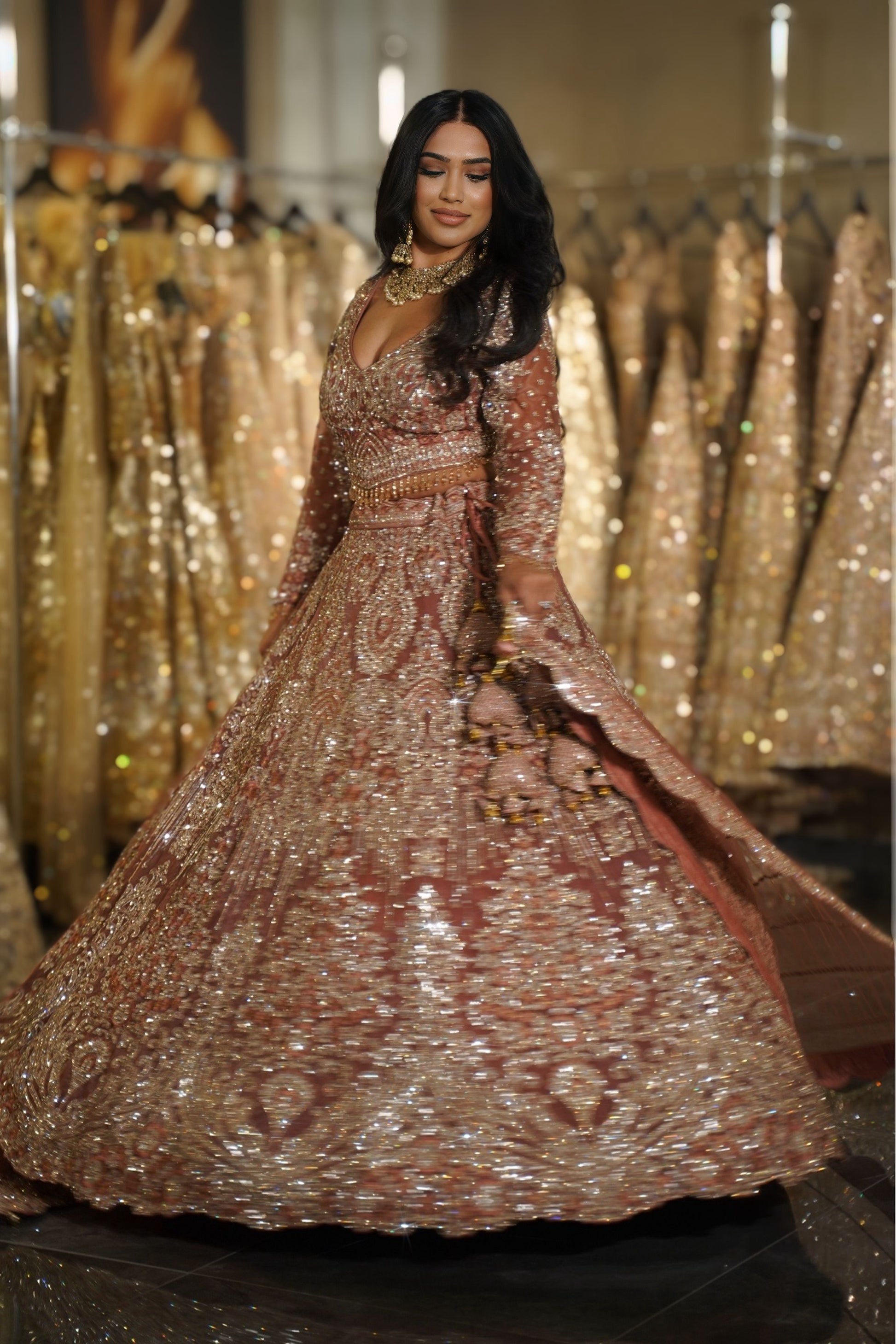 Embrace a look of timeless romance with this breathtaking Dusty Rose Lehenga Set. Moving away from bright bridal reds, this ensemble offers a sophisticated, earthy pink hue that exudes vintage glamour. Heavily embellished with antique silver and crystal work, it creates a mesmerizing shimmer that feels both regal and ethereal. Perfect for the bride who wants a unique, high-fashion color palette for her reception or grand engagement.