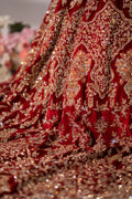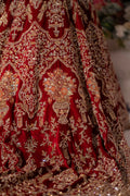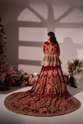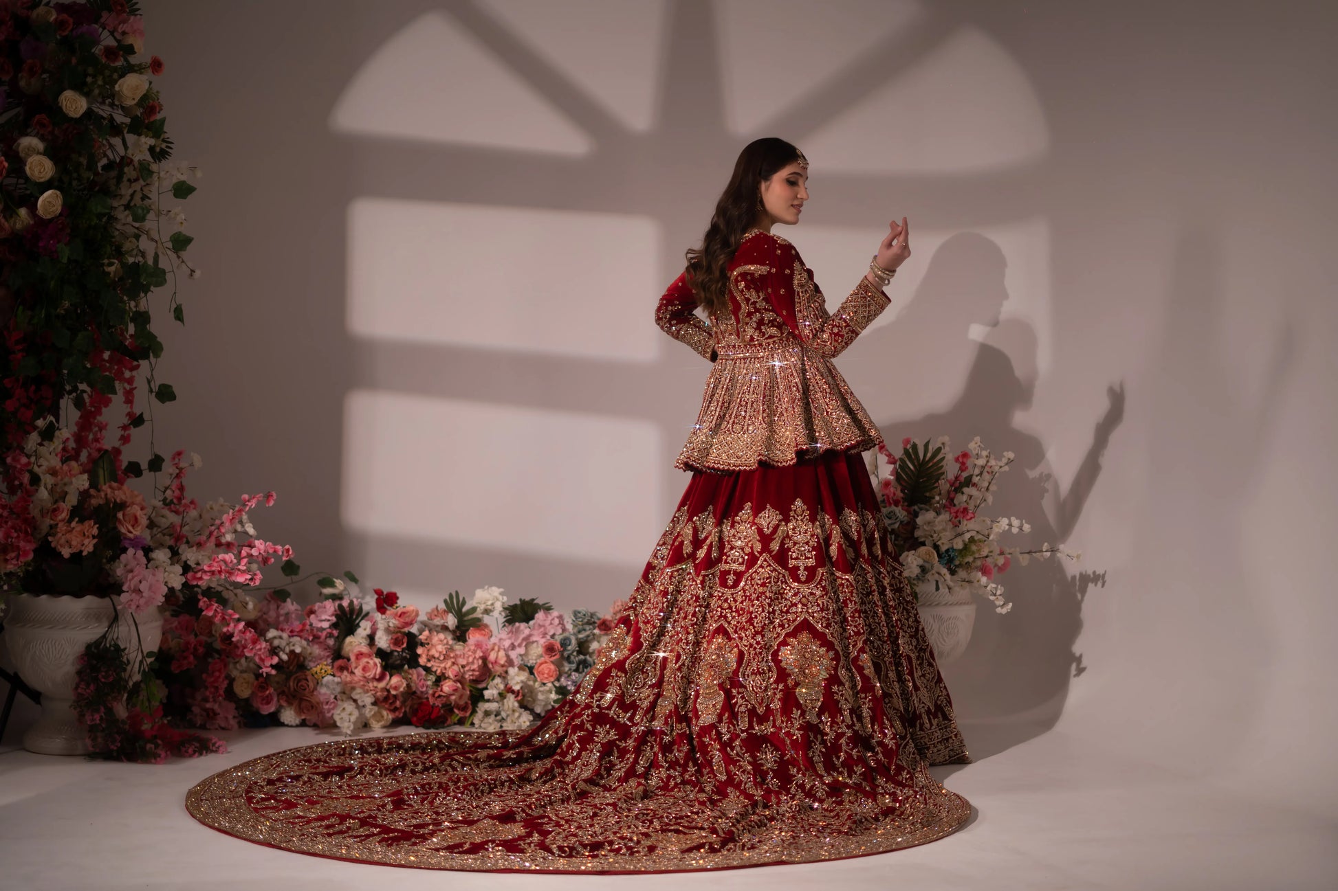 Make a grand entrance that will be remembered forever with this show-stopping Deep Maroon Velvet Bridal Lehenga. A fusion of modern structure and ancient royal grandeur, this ensemble features a trendy peplum-style blouse paired with a magnificent lehenga that boasts an extended cathedral train. Designed for the bride who wants to look like an empress, this outfit commands attention with its heavy gold artistry and dramatic silhouette.
