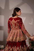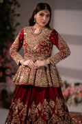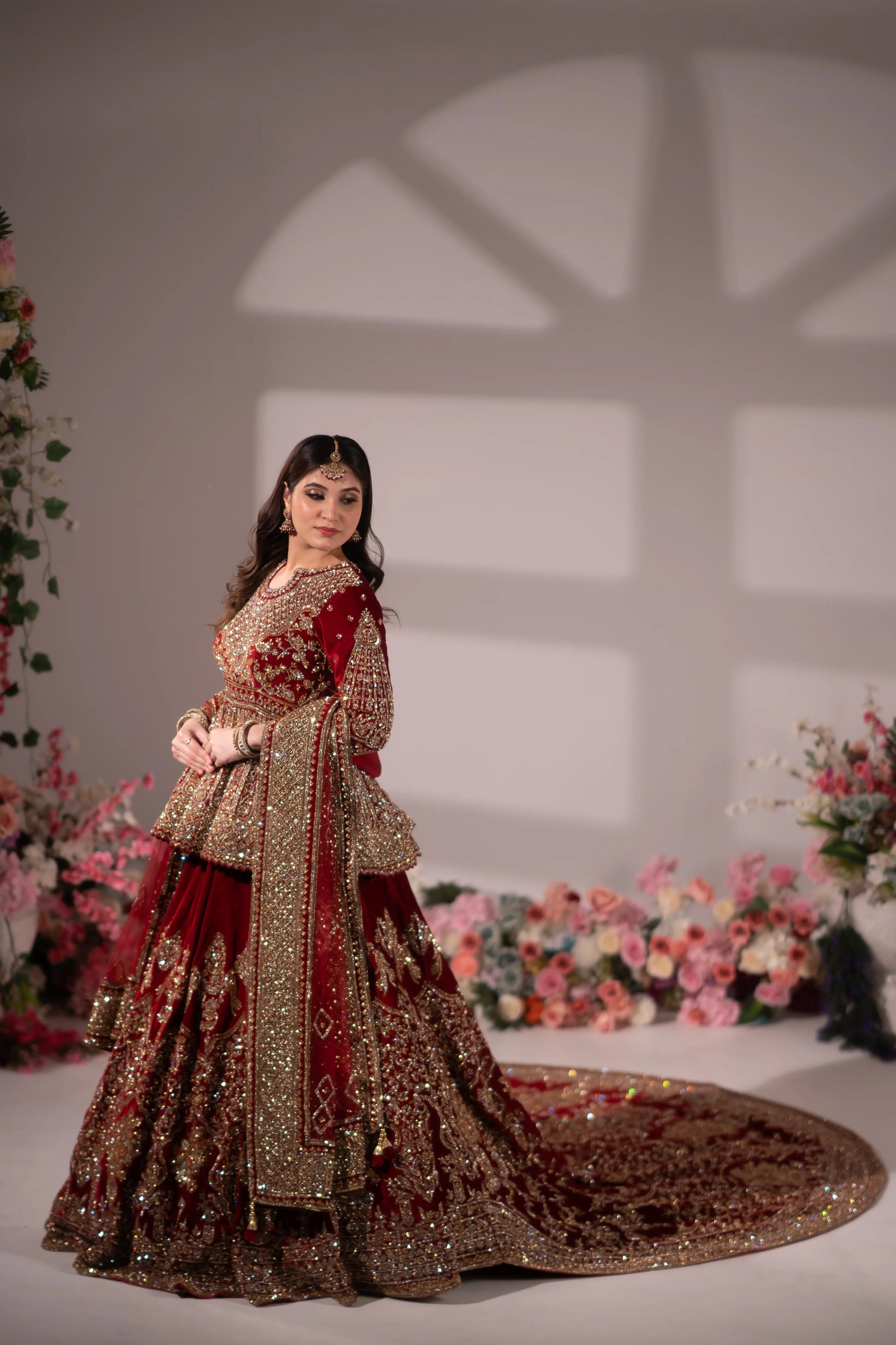 Deep Maroon Velvet Peplum Embroidered Bridal Lehenga